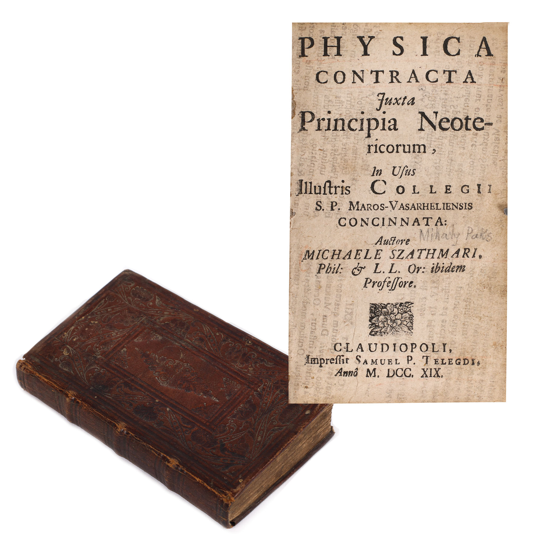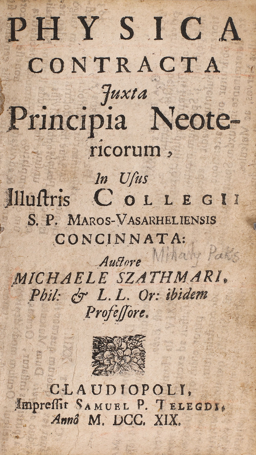79. "Legile fizicii" (Physica contracta), manual școlar în uz la colegiul Maros-Vasarheliensis, de Michaele Szathmari, Cluj-Napoca (Claudiopolis), 1719
