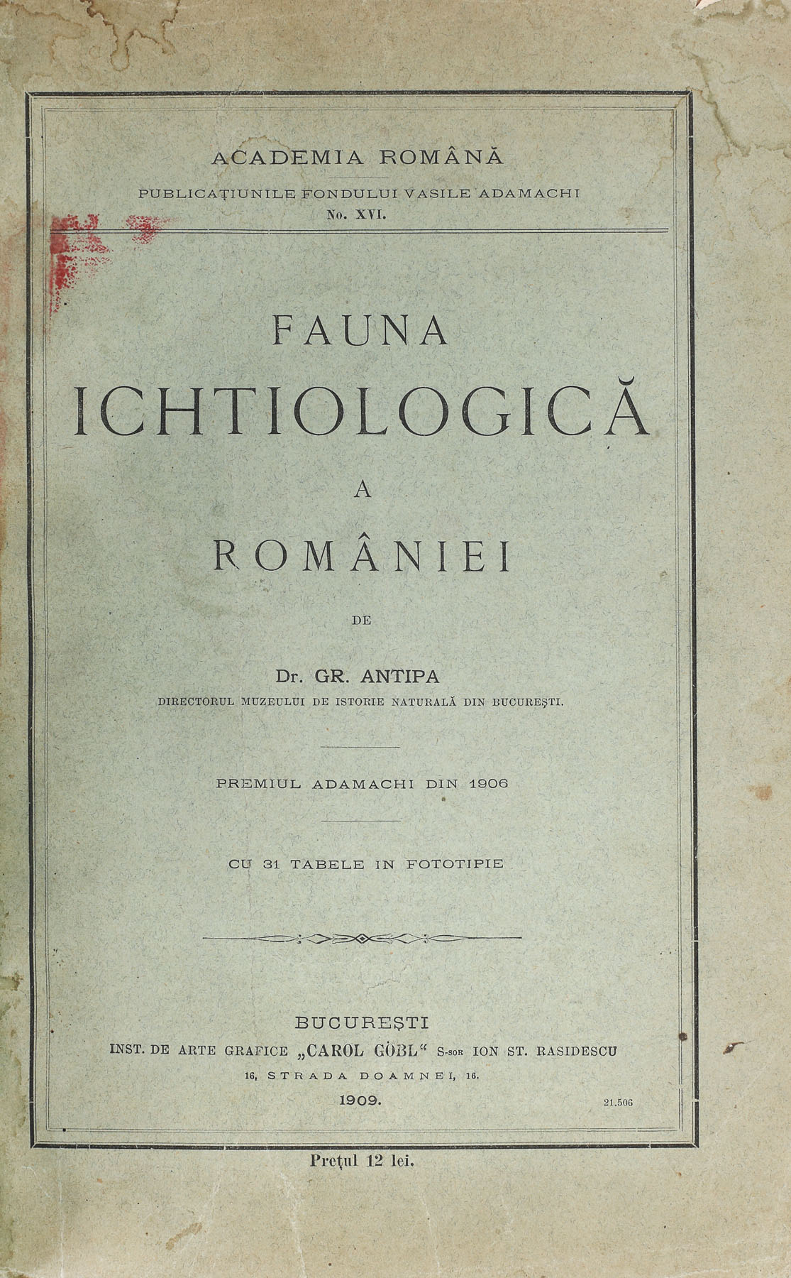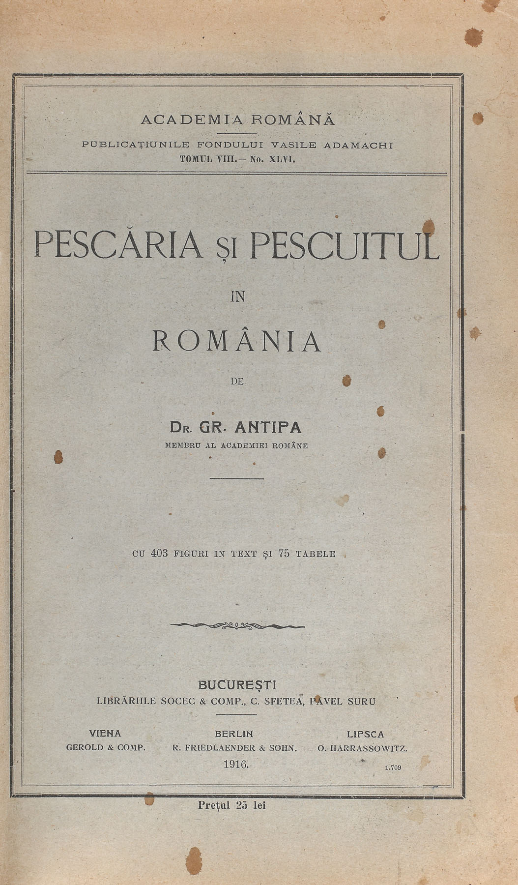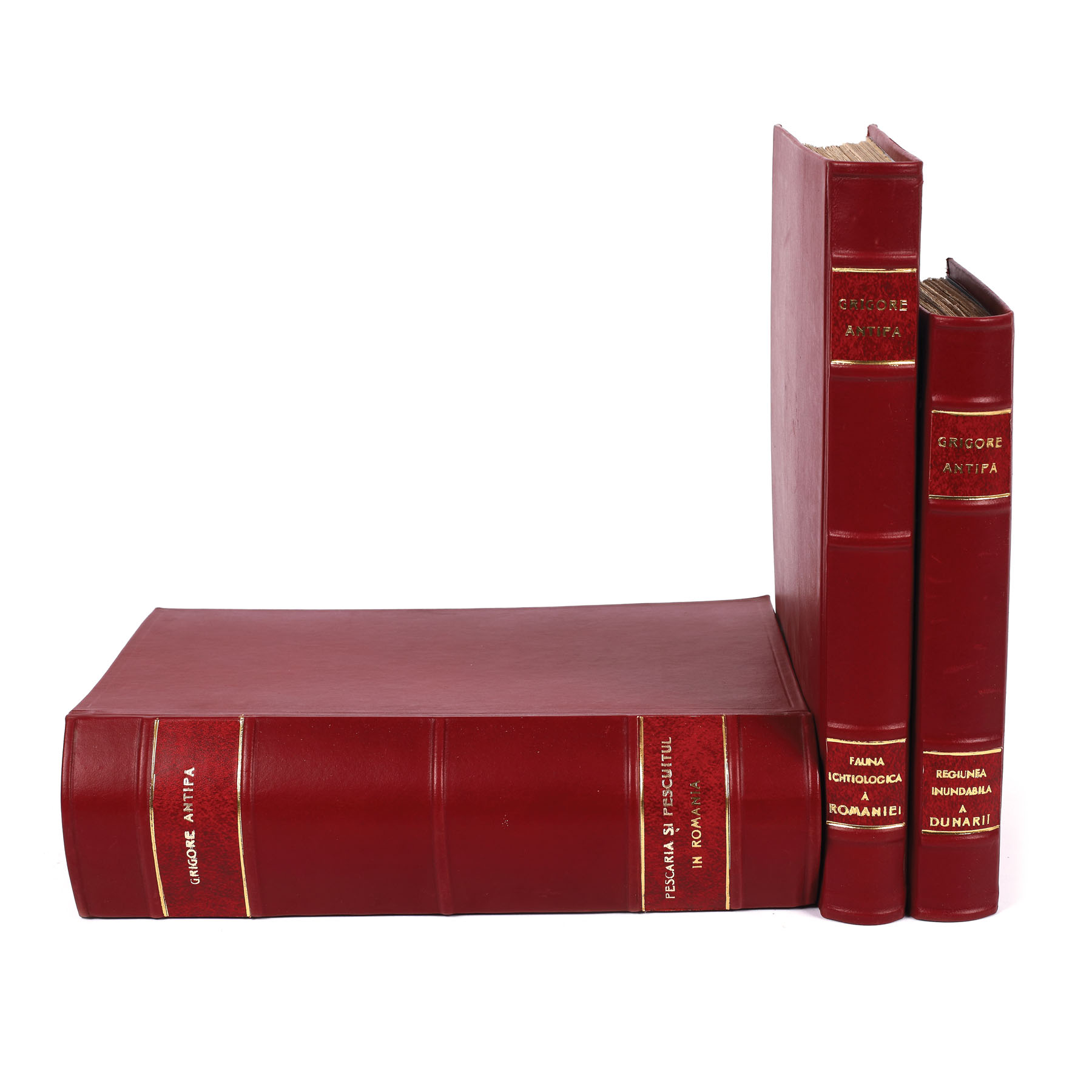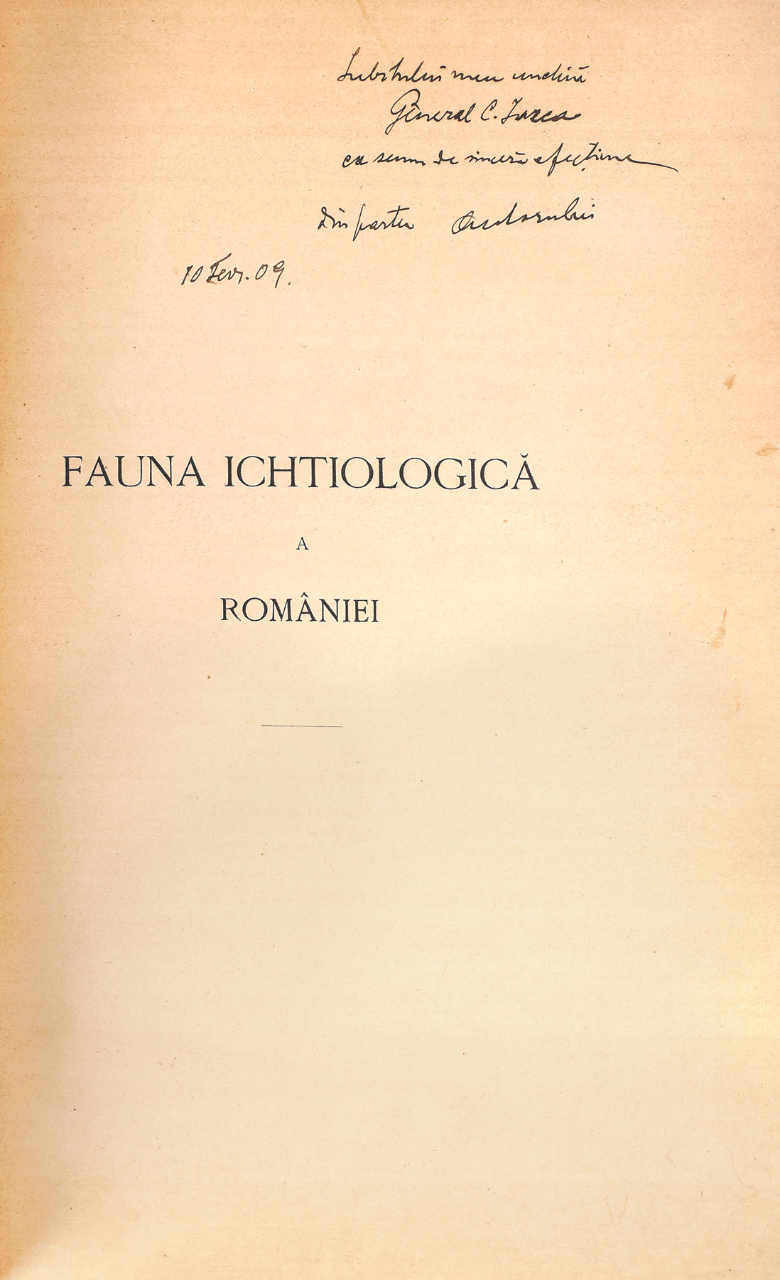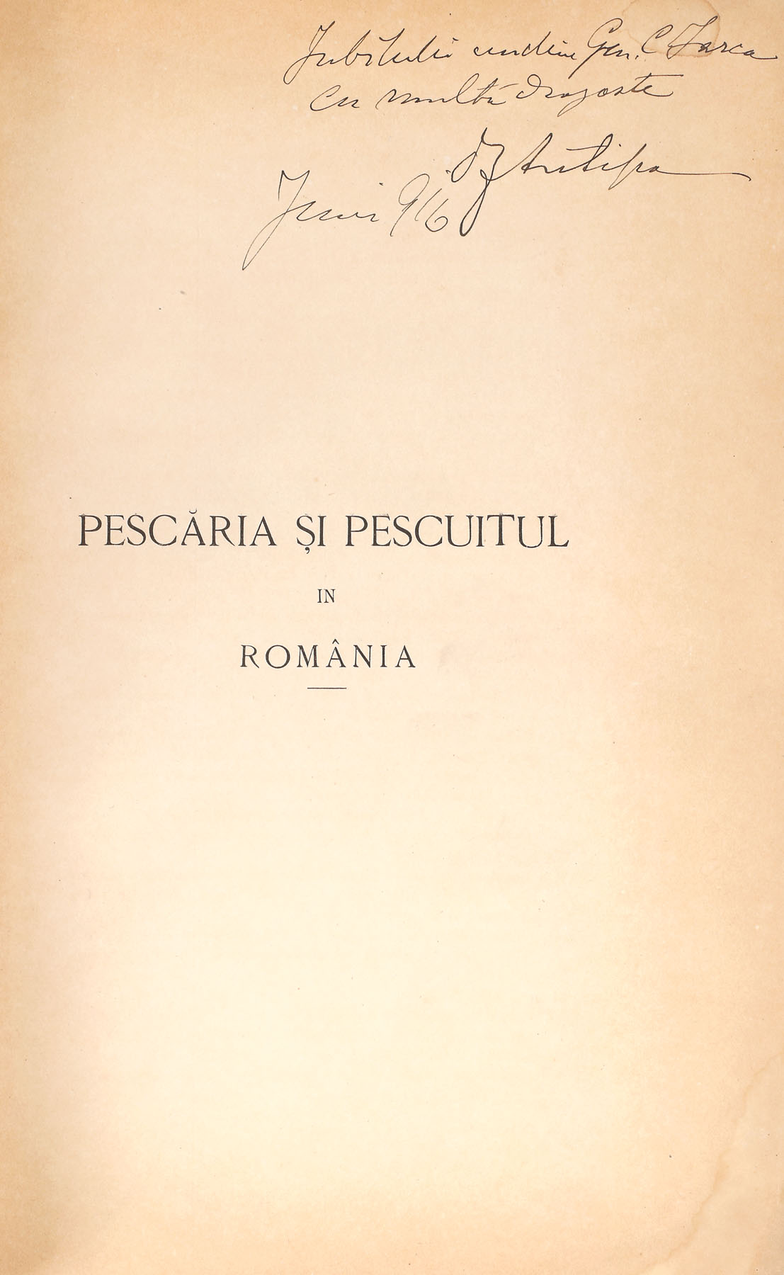 112. Lot format din trei volume: ”Fauna ichtiologică a României”, București, 1909, ”Regiunea inundabilă a Dunării”, București, 1910, și ”Pescăria și pescuitul în România”, București, 1916, de Grigore Antipa, cu dedicația și semnătura olografă a autorului către generalul Constantin Iarca