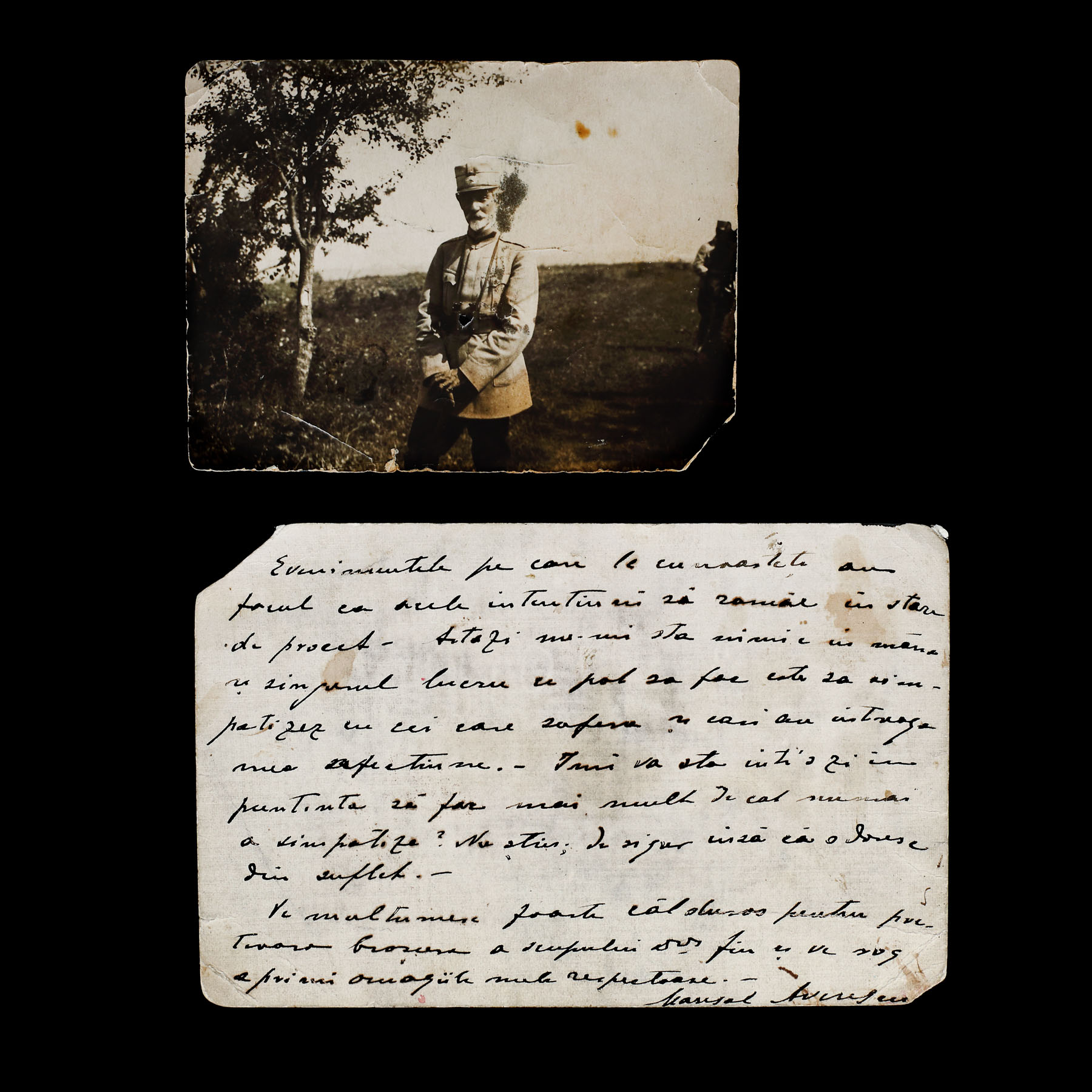 59. Lot format dintr-o fotografie ilustrându-l pe mareșalul Averescu pe front și o carte poștală trimisă de acesta, 4 martie 1932, cu semnătura olografă