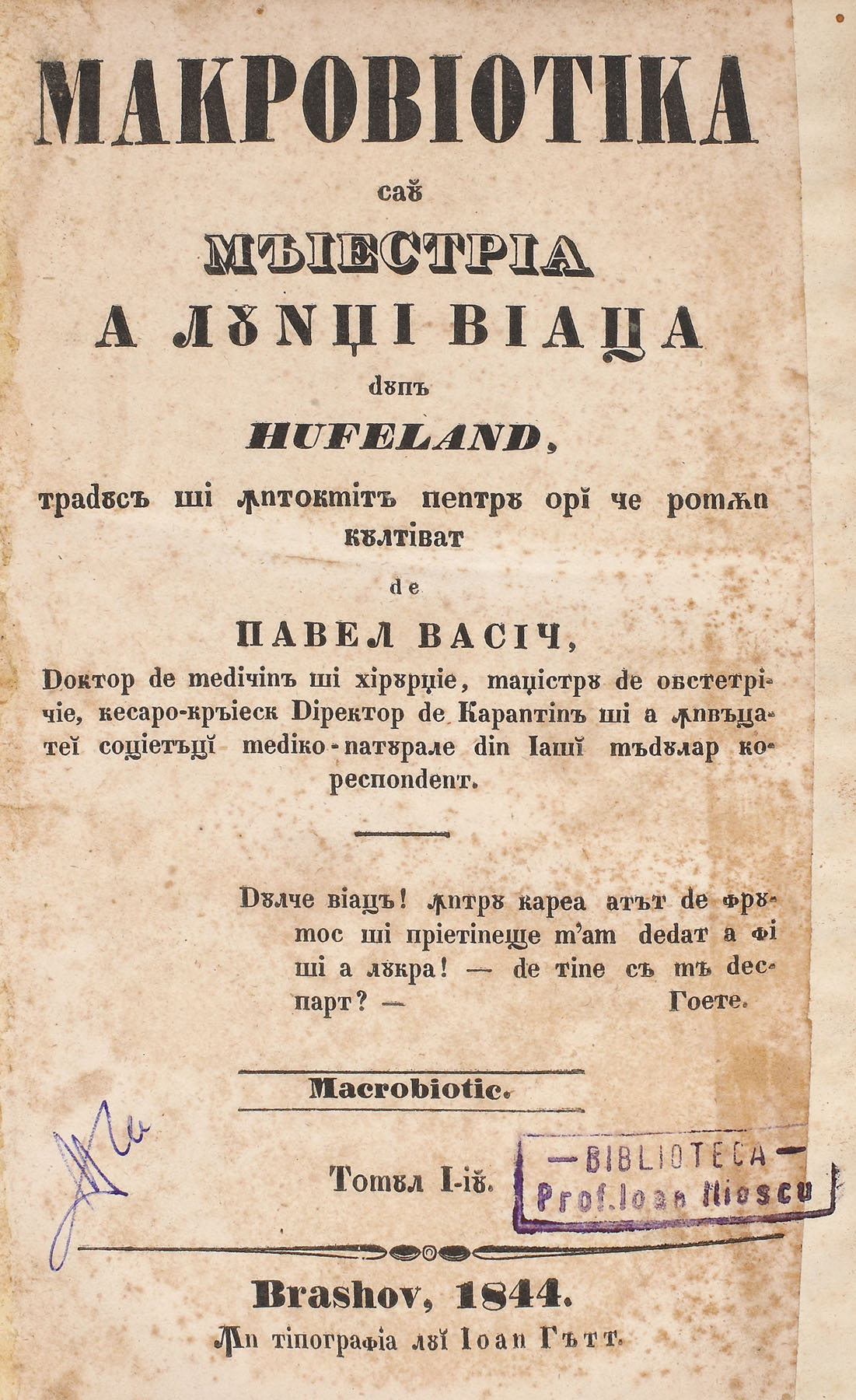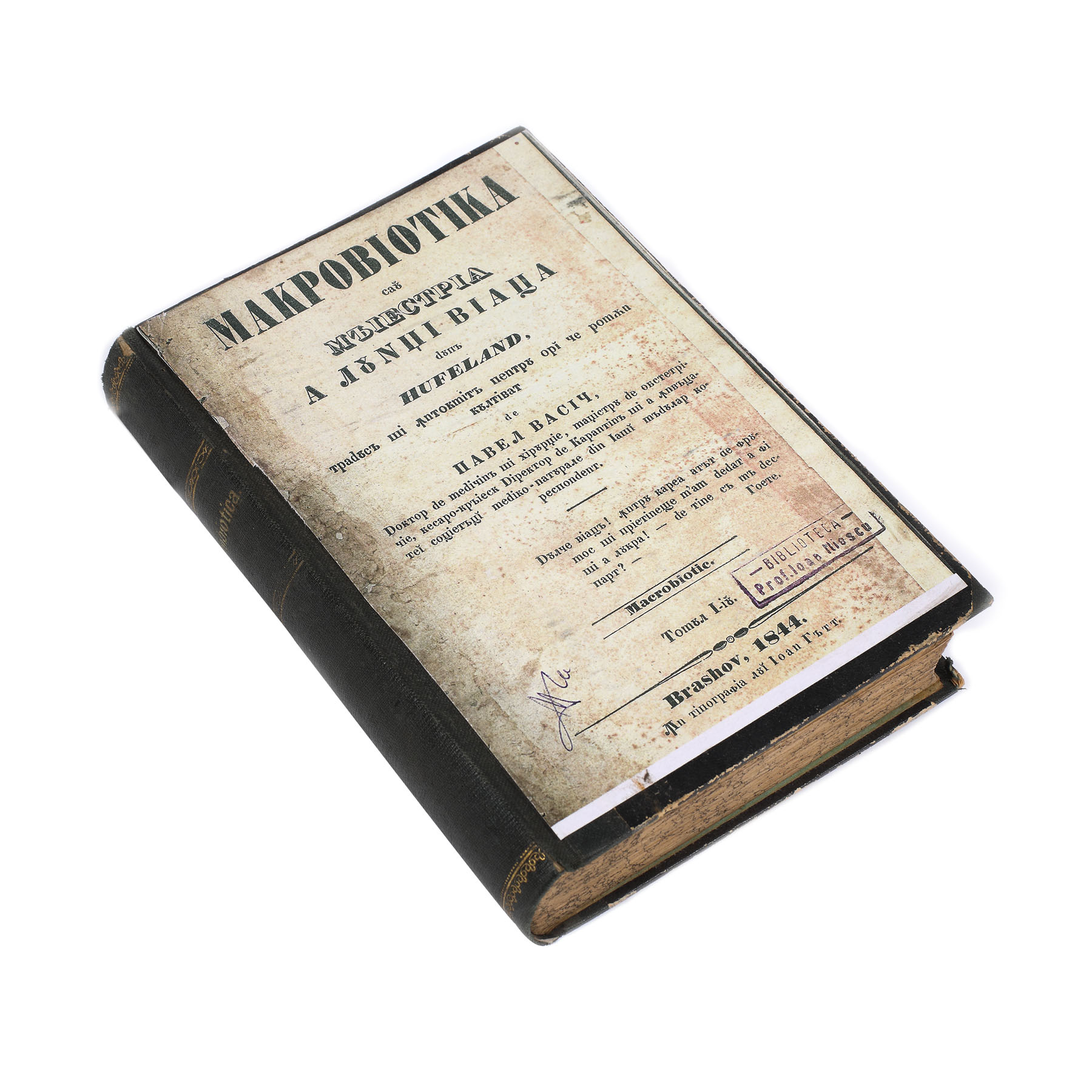 133. ”Macrobiotica sau măiestria de a lungi viața - după Hufeland”, tradusă de Pavel Vasici, ediție princeps, Brașov, 1844