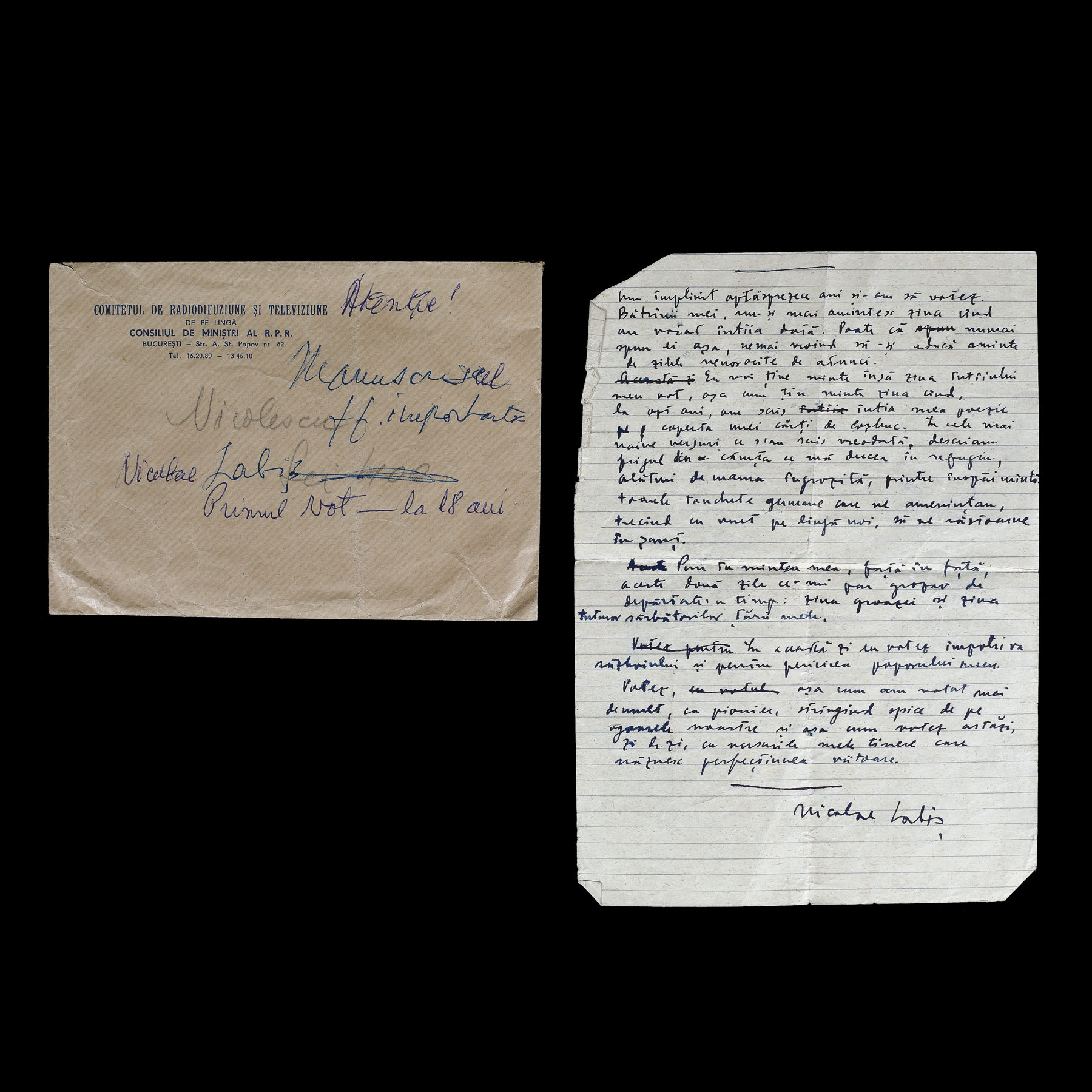 49A. Manuscris "Primul meu vot", de Nicolae Labiș, cu semnătura olografă a poetului, 1953, însoțit de plicul original