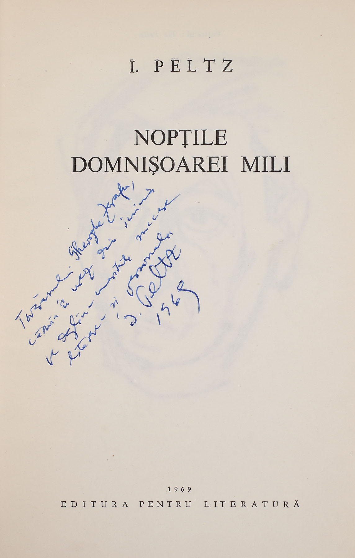 105. ”Nopțile domnișoarei Mili”, de Isac Peltz, București, 1969, cu dedicația olografă a autorului către epigramistul Gheorghe Zarafu