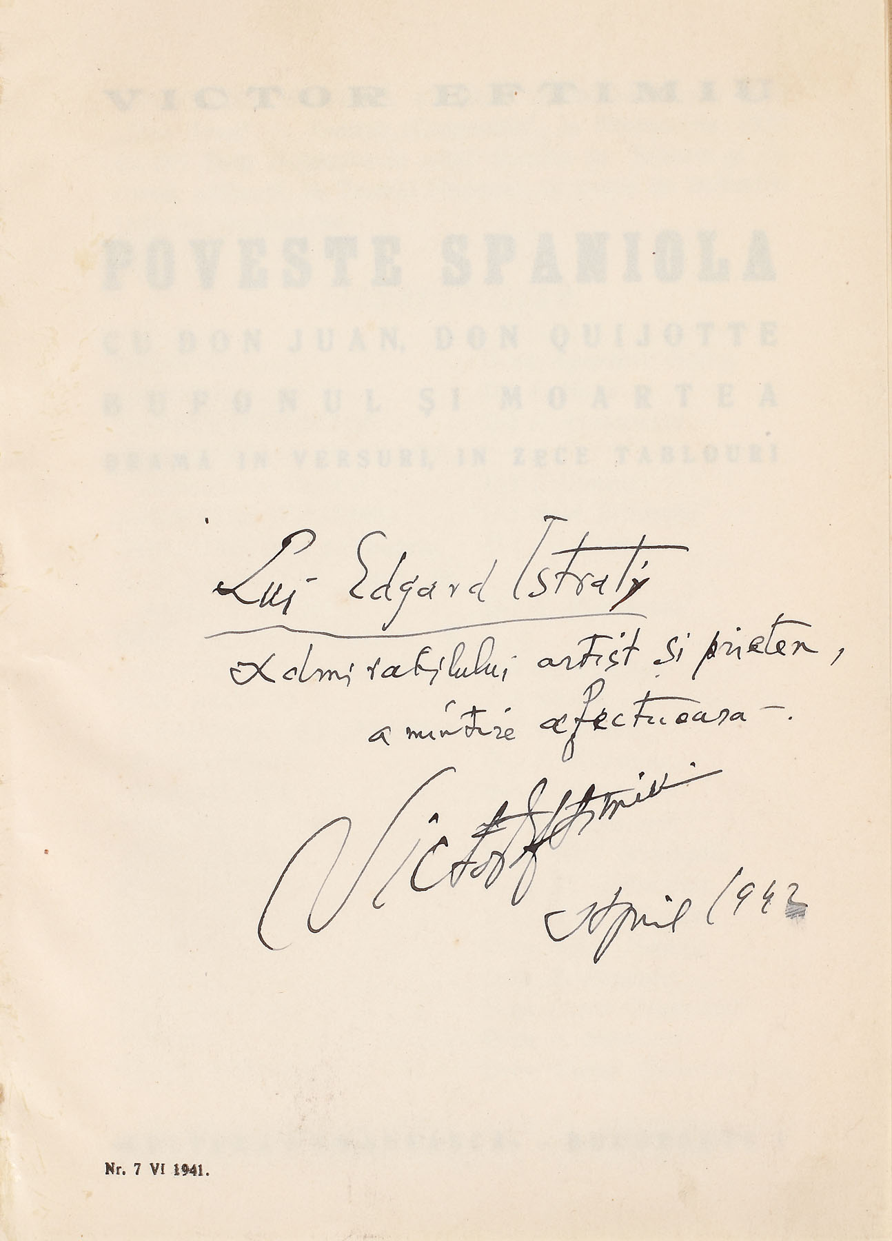 109. ”Poveste spaniolă”, de Victor Eftimiu, București, 1941, cu dedicația olografă a autorului către interpretul de operă și unul dintre fondatorii Operei Române, Edgard Istratty