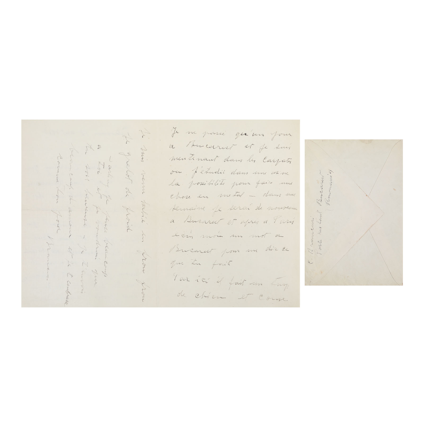 117A. Scrisoare de dragoste "Îți trimit multă dragoste și te sărut ca un nebun” (Je t'envoie beaucoup d'amour et je t'embrasse comme fou) trimisă de Constantin Brâncuși către Florence Meyer (Homolka), Petroșani, 19 august 1937, cu semnătura olografă și plicul original