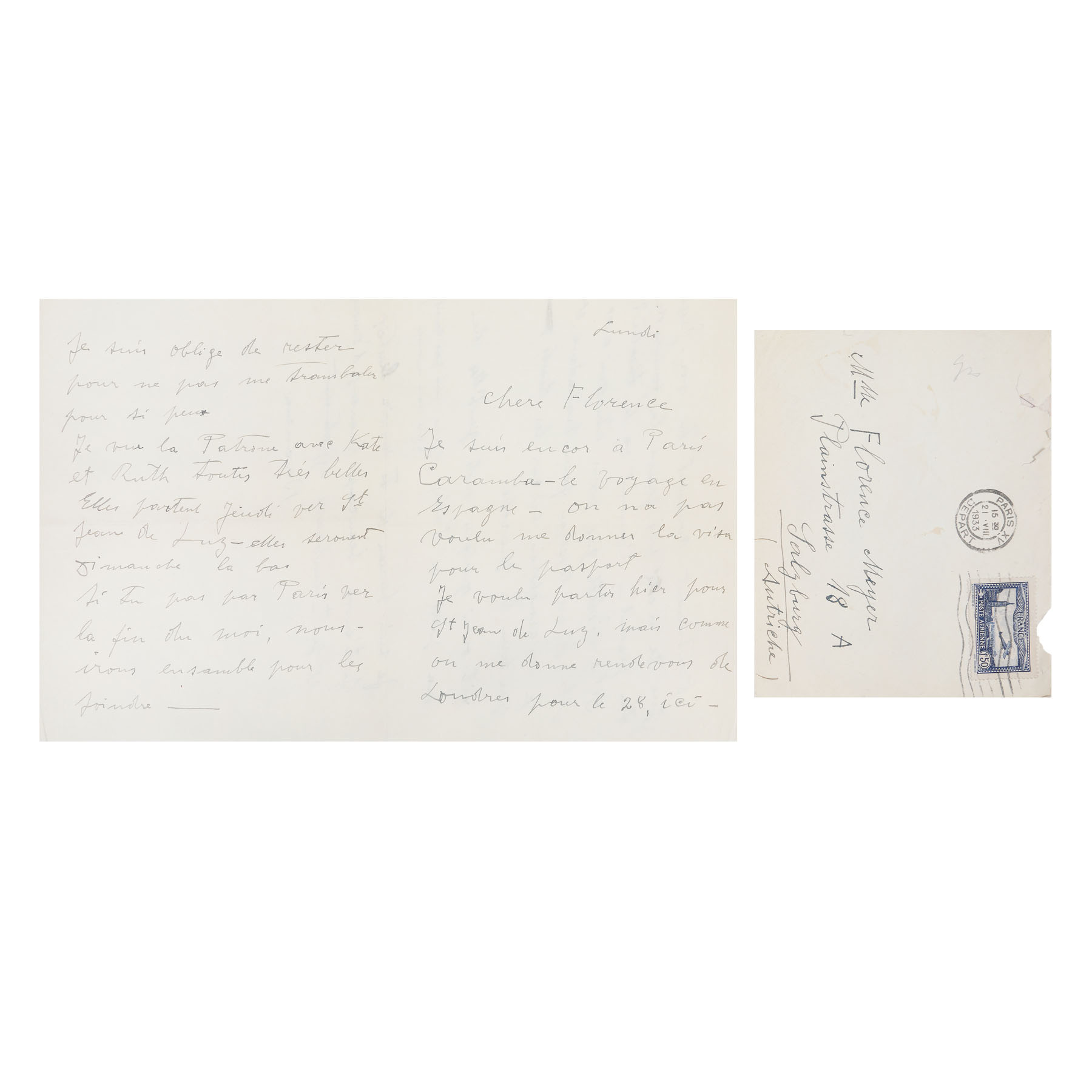 124A. Scrisoare de dragoste ”Sunt fericit că te voi revedea curând” (Je suis heureux de te revoir bientôt) trimisă de Constantin Brâncuși către Florence Meyer (Homolka), Paris, 21 august 1933, cu semnătură olografă și plicul original (2 file)