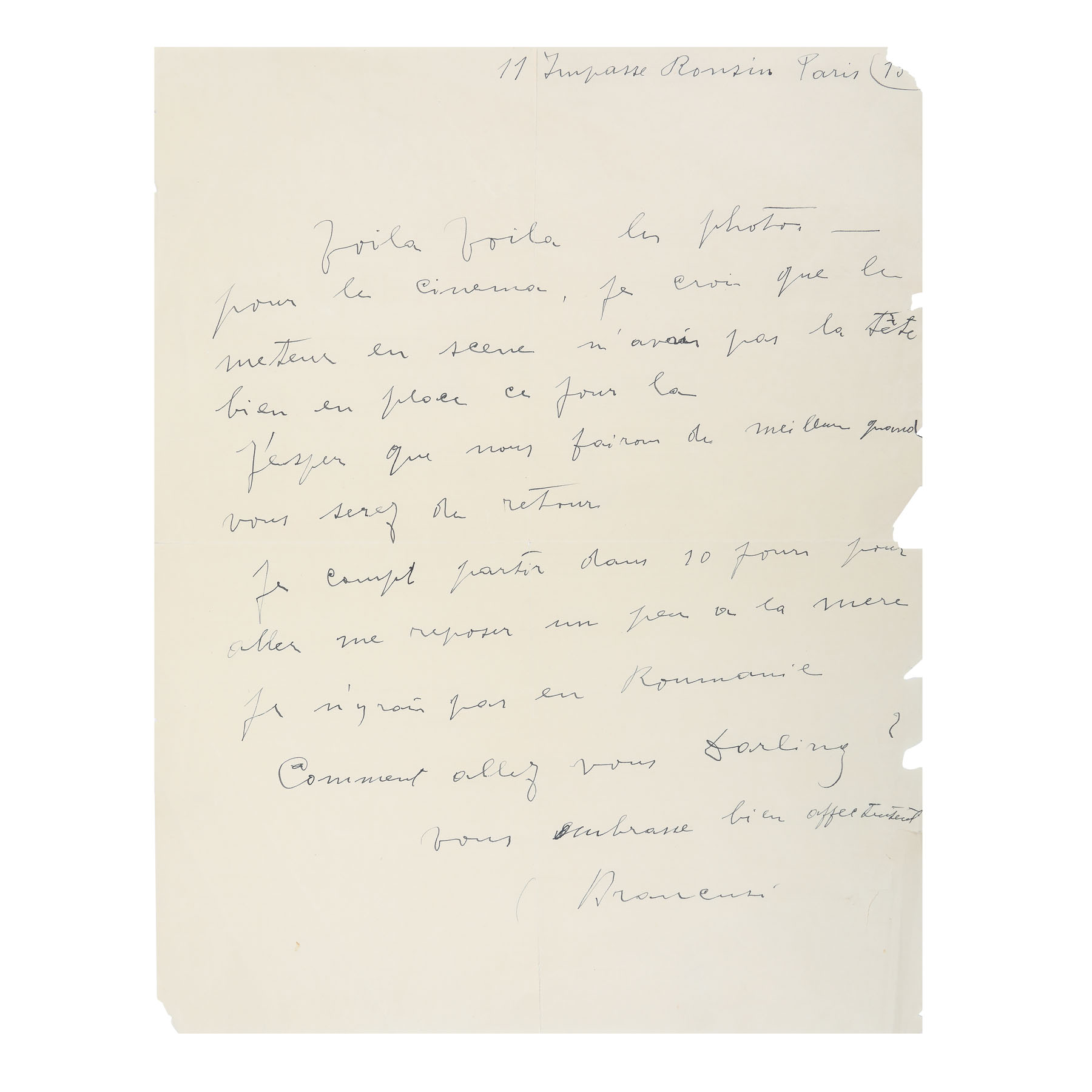 127A. Scrisoare de dragoste ”Vă îmbrățișez cu afecțiune” (Vous embrasse affectueusement) trimisă de Constantin Brâncuși către Florence Meyer (Homolka), Paris, cu semnătura olografă