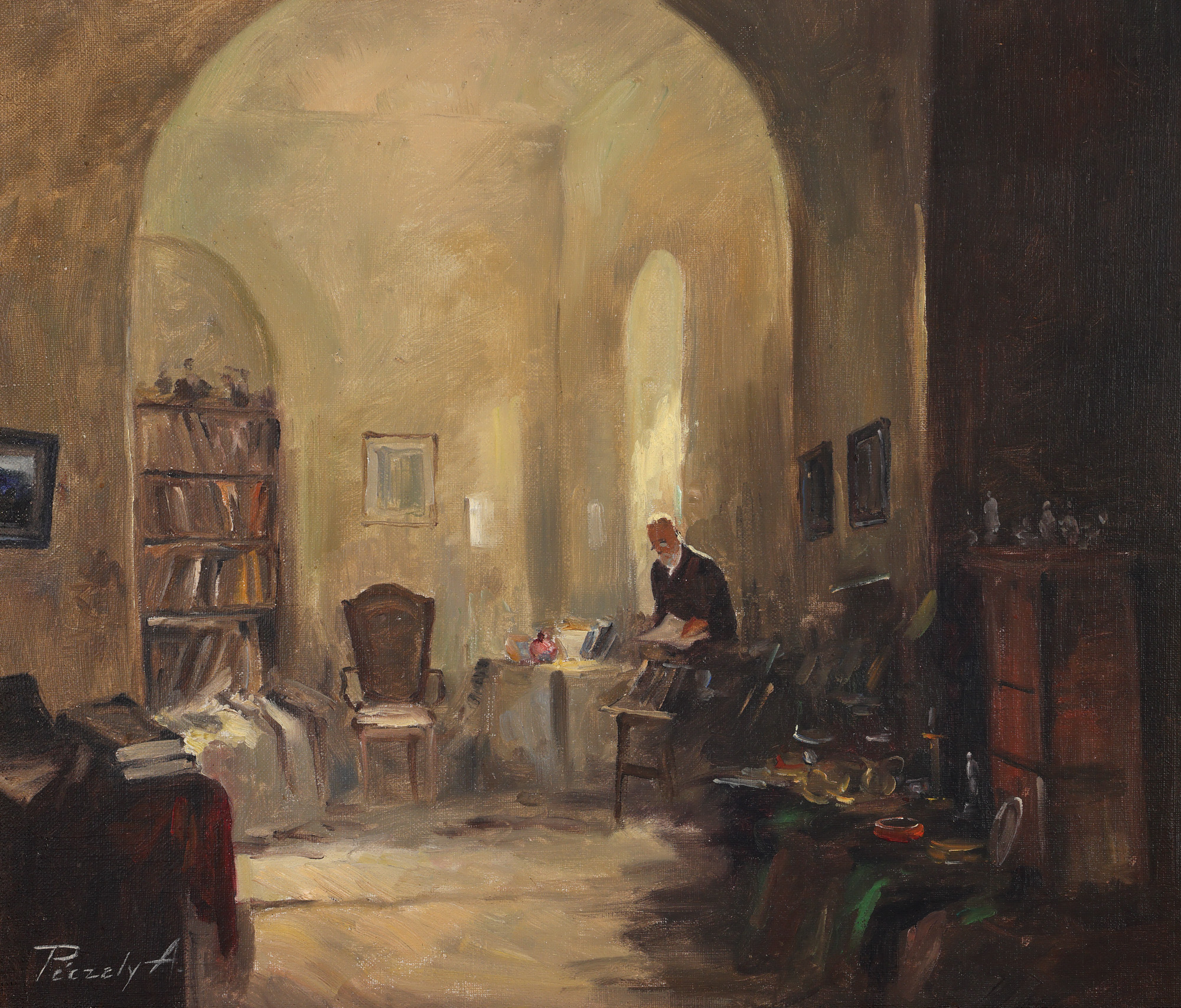 semnat stânga jos, cu alb, ”Peczely A.”