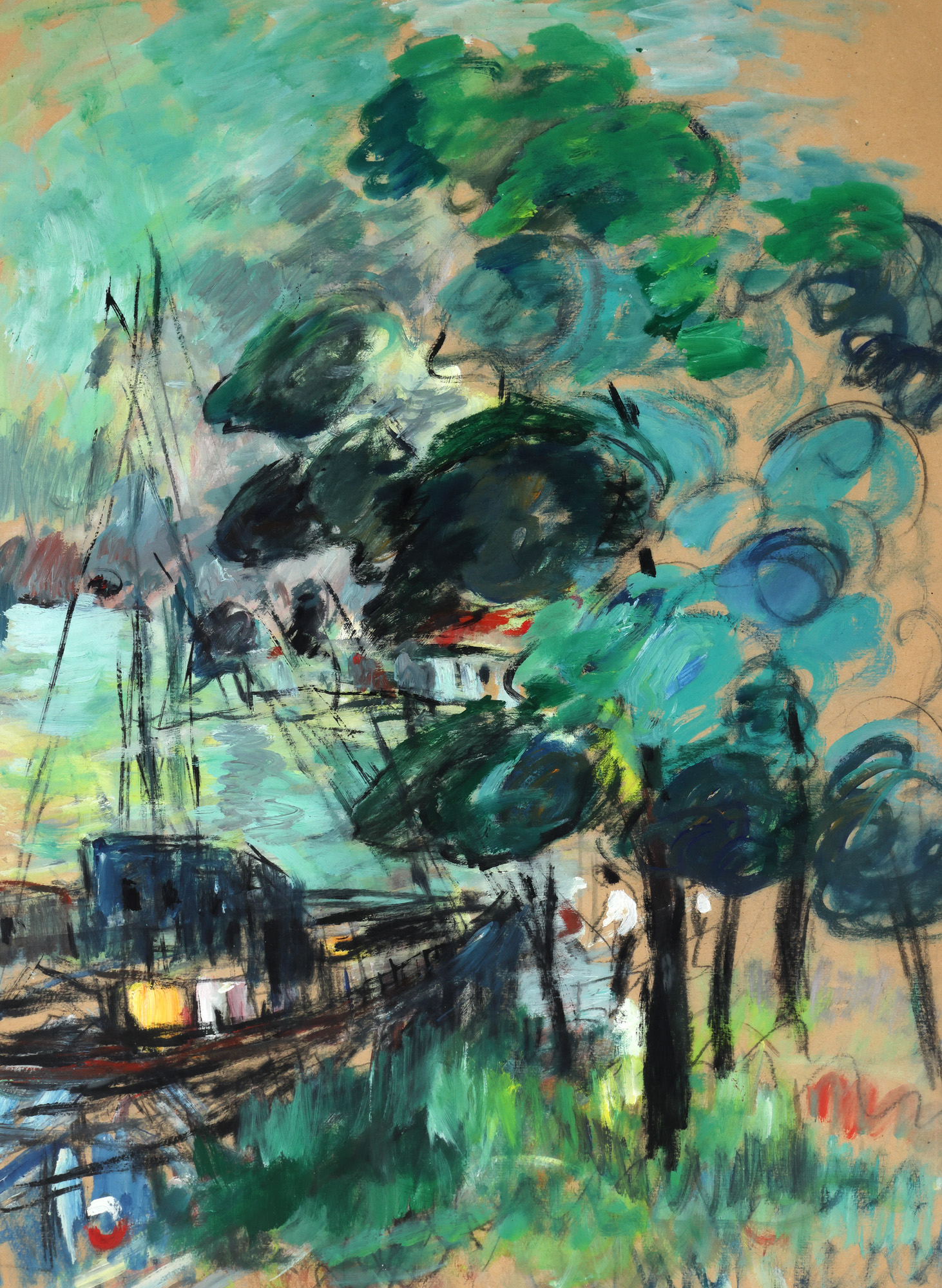 guașă și ulei pe hârtie lipită pe carton