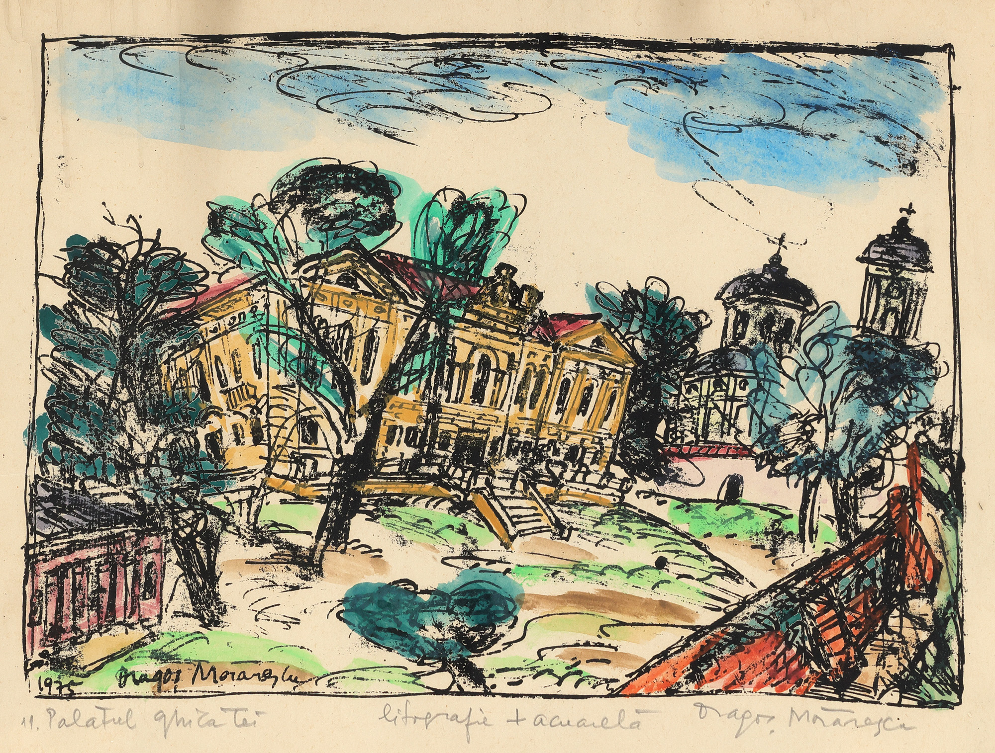 semnat și datat stânga jos, în placă, ”Dragoș Morărescu, 1975”; semnat, notat și intitulat central jos în creion, ”Dragoș Morărescu, litografie și acuarelă, Palatul Ghica Tei”