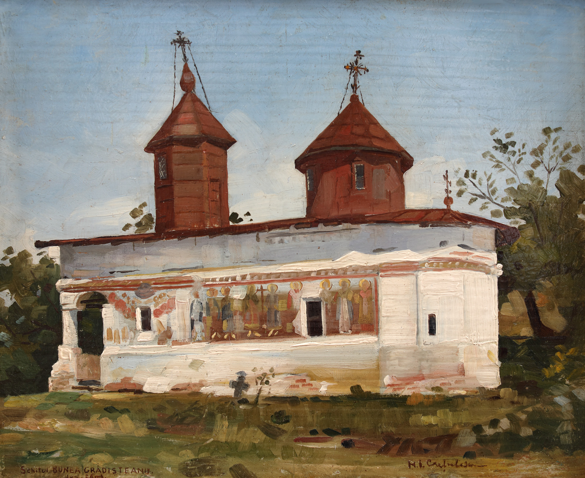 semnat dreapta jos, cu brun, ”H.I. Crețulescu”; intitulat stânga jos, cu brun, ”Schitul BUNEA GRĂDIȘTEANU”