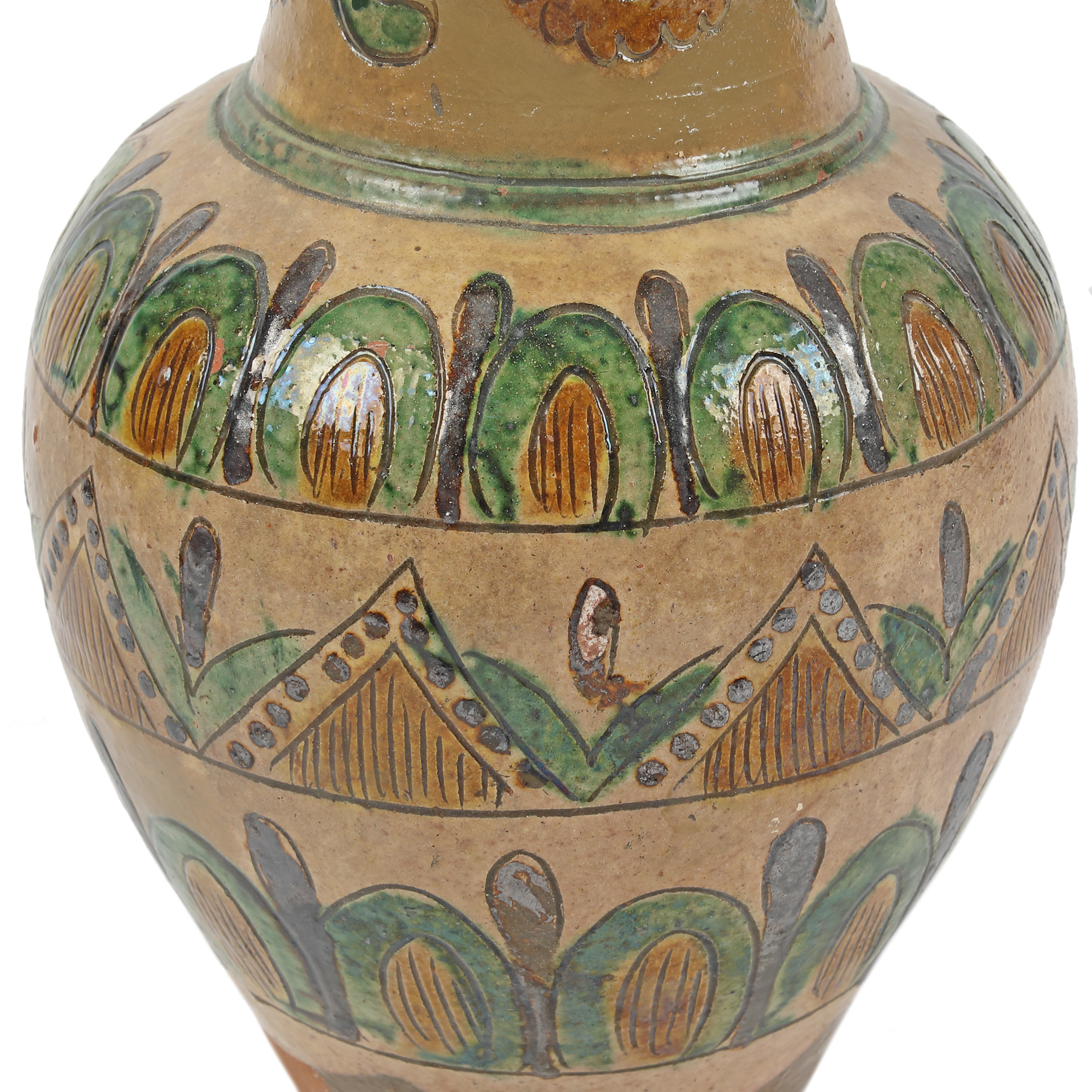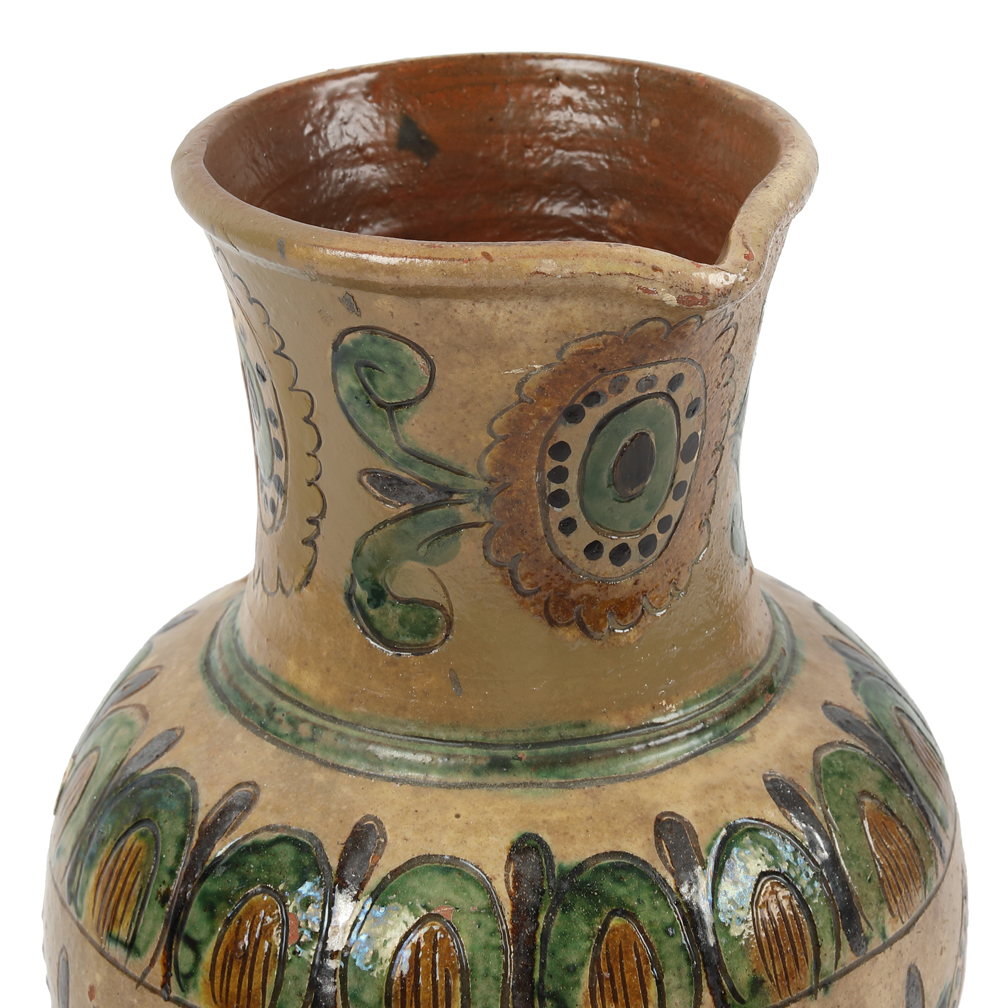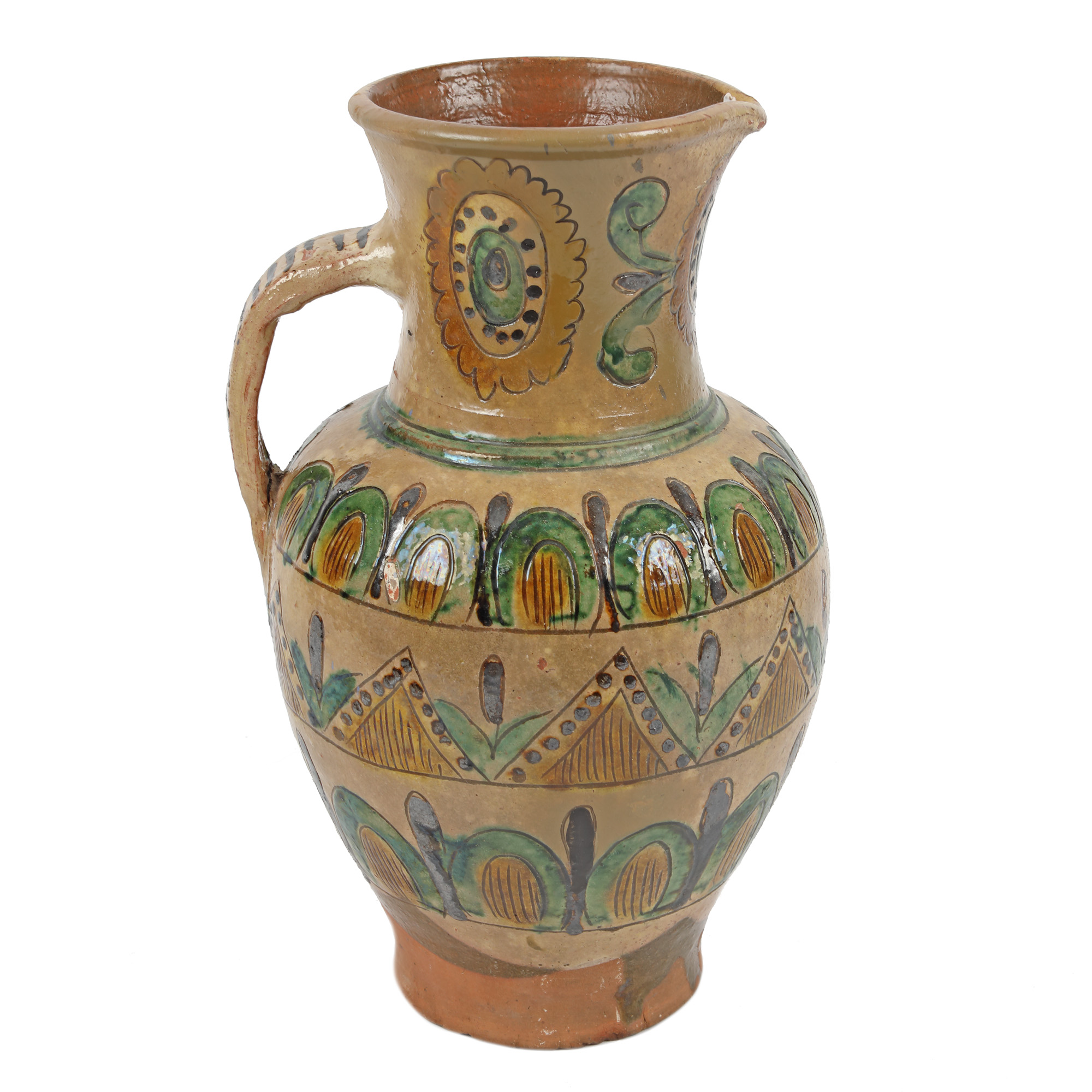 135. Cană pentru vin Kuty, decorată cu motive florale după model huțul (influențând mai târziu familia de mari ceramiști Colibaba), sfârșitul sec. XIX