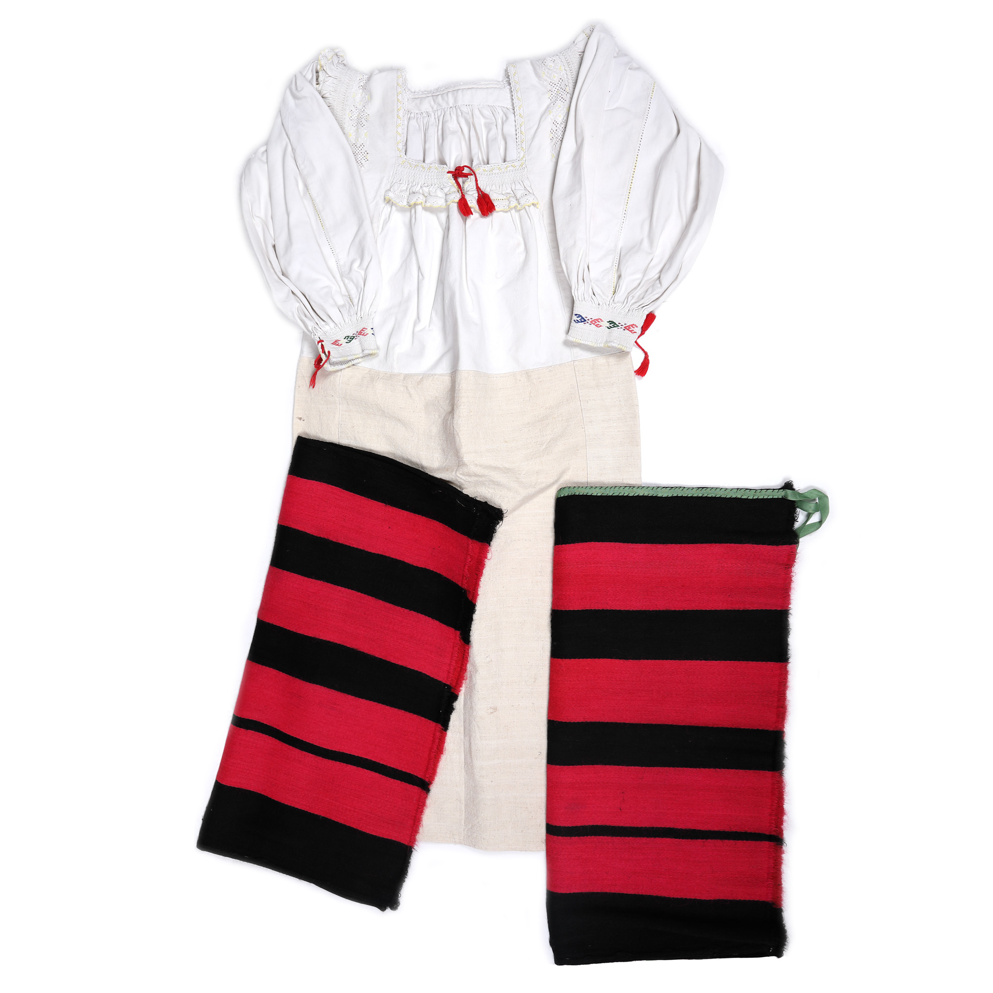 72. Costum popular alcătuit din cămașă cu poale atașate și două șorțuri late din lână, Maramureș, cca. 1930-1940