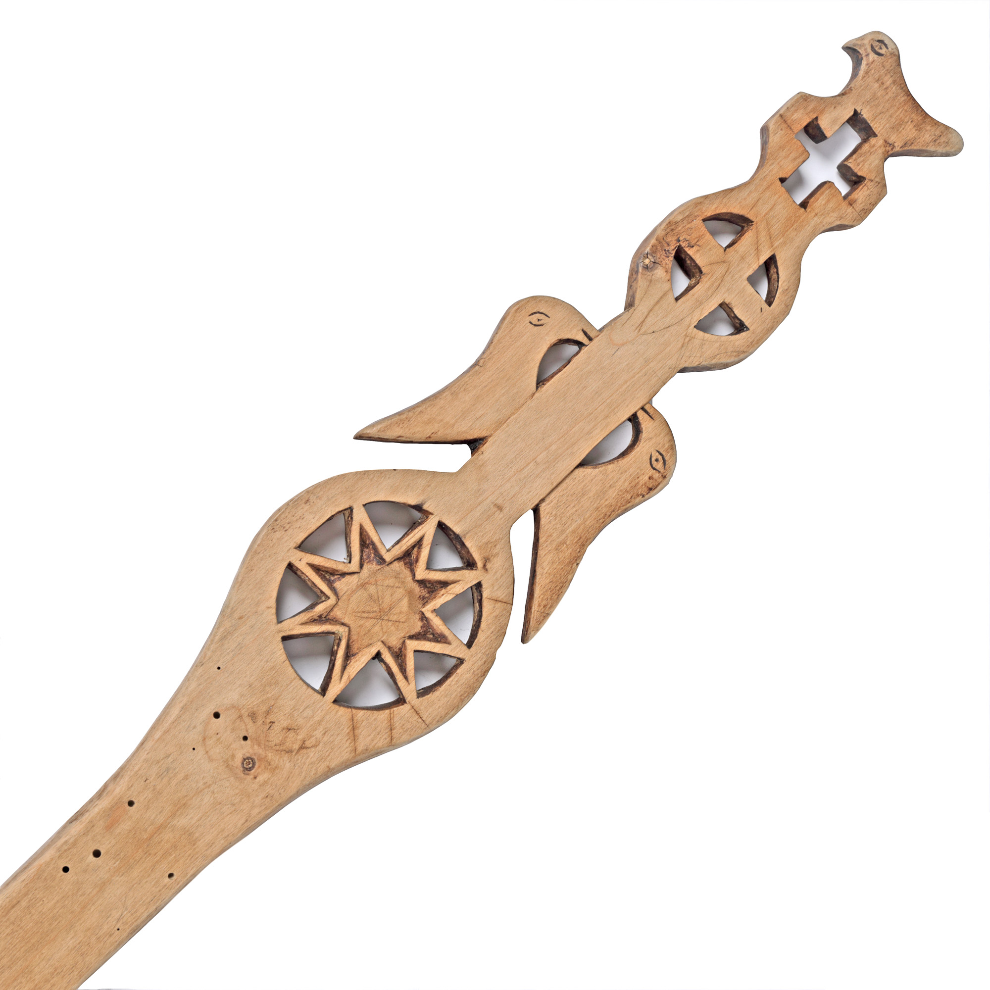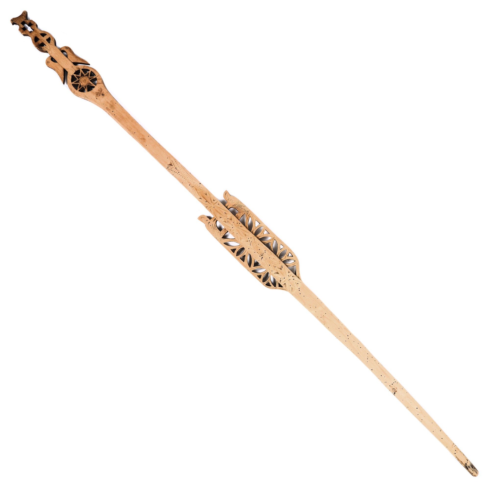 118. Furcă de tors din lemn, decorată cu motive crucii, Transilvania, prima jumătate a sec. XX