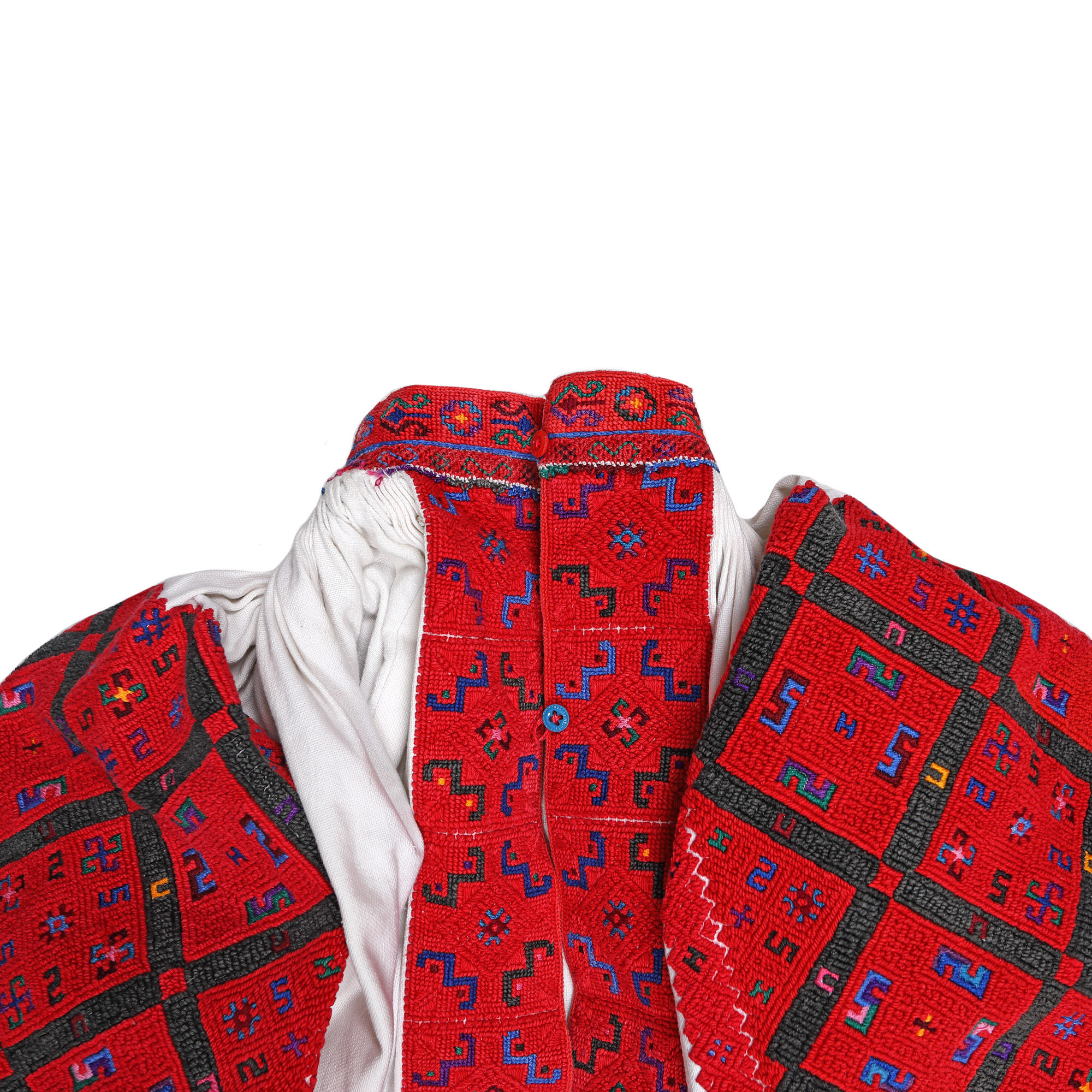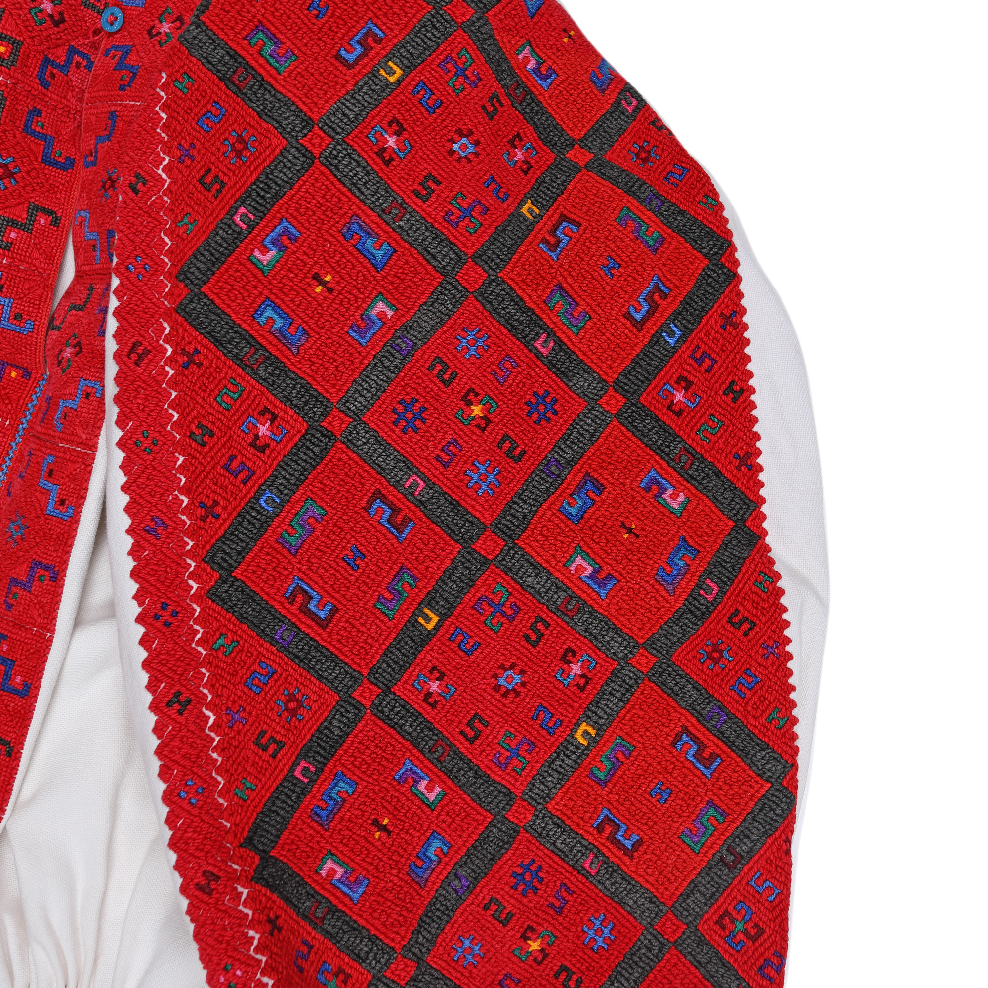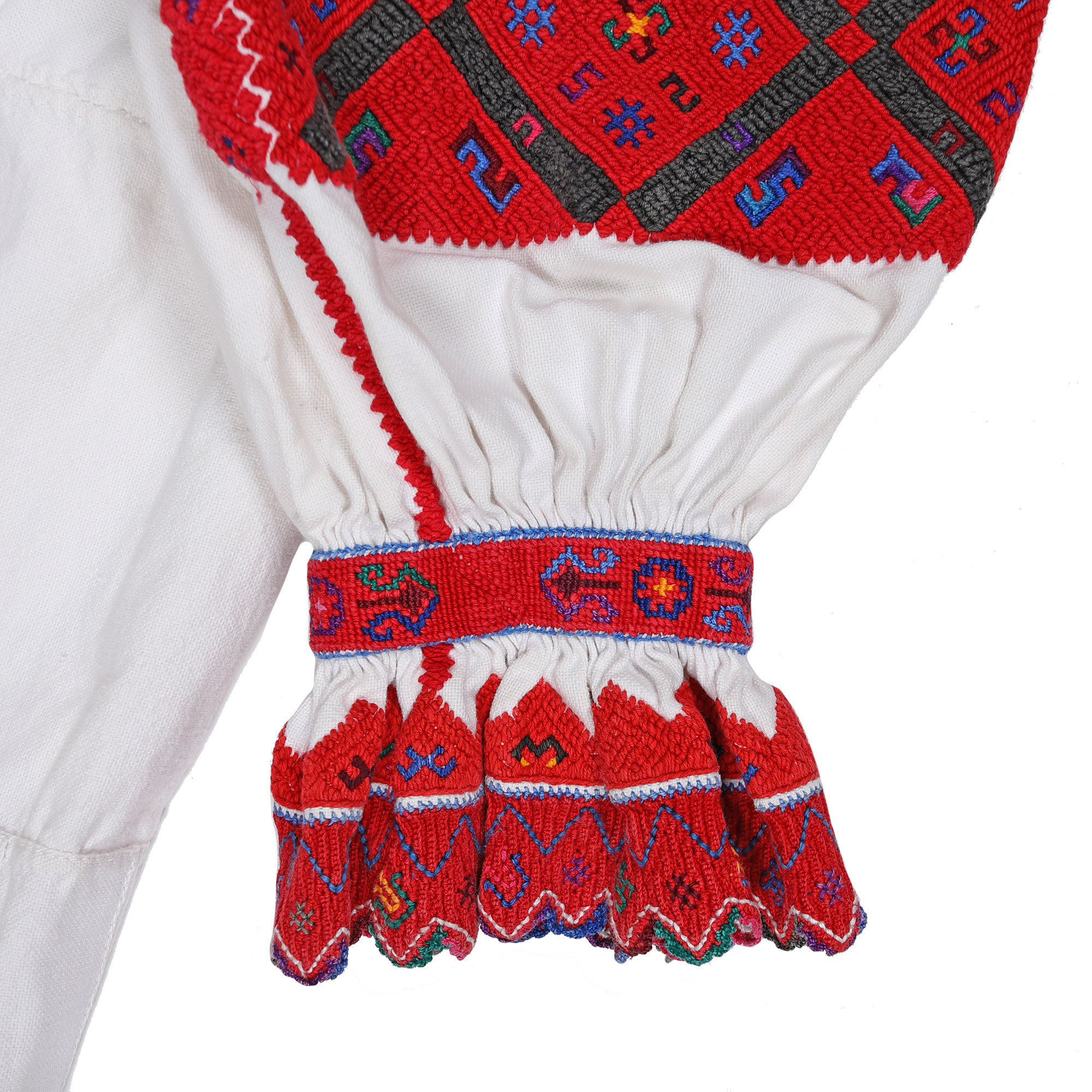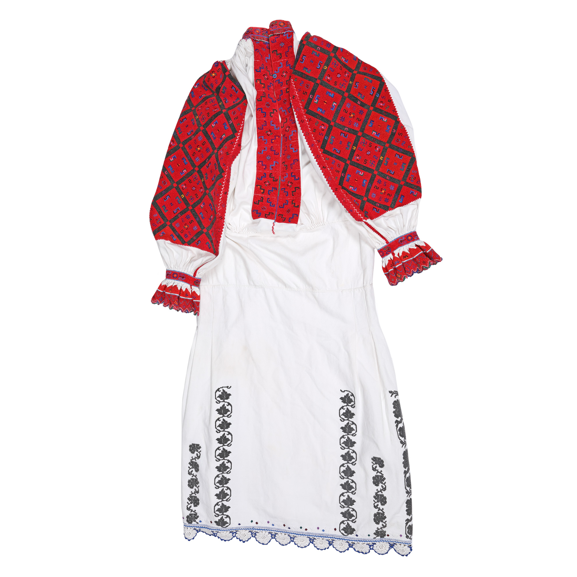 104. Inedită cămașă cu poale, minuțios brodată cu simboluri de fertilitate, solare și de protecție, Ținutul Pădurenilor, Hunedoara, prima jumătate a sec. XX, provine din colecția Iuliei Gorneanu