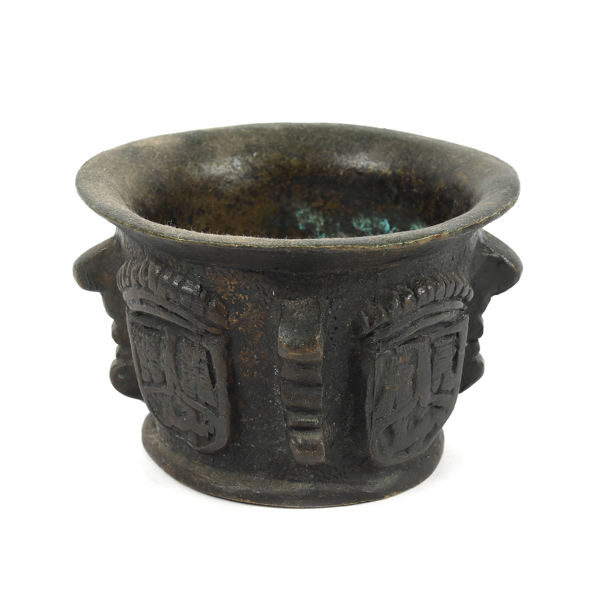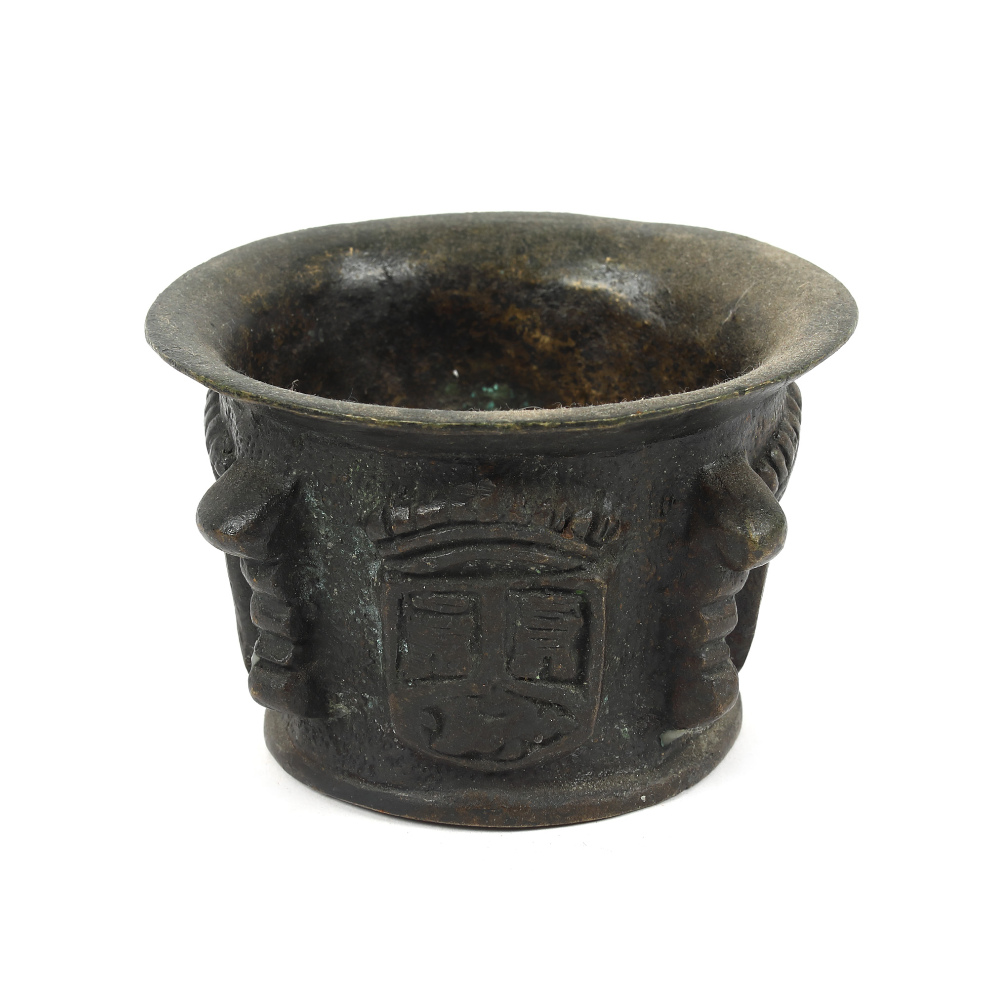 51. Mojar de farmacie din bronz, decorat cu stemă urbană transilvăneană, începutul sec. XVIII