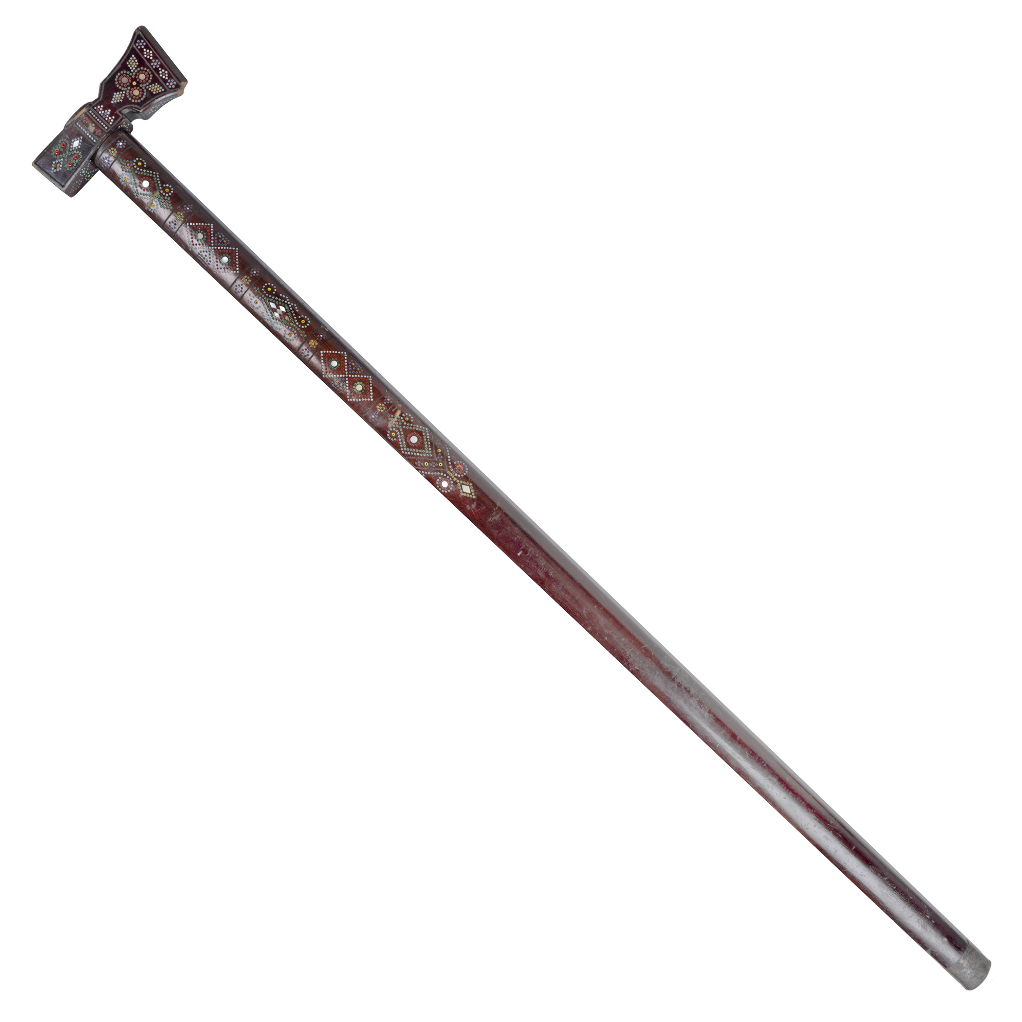 113. Topor decorativ din lemn, incizat și pictat cu motive florale și ”coarnele berbecului”, prima jumătate a sec. XX