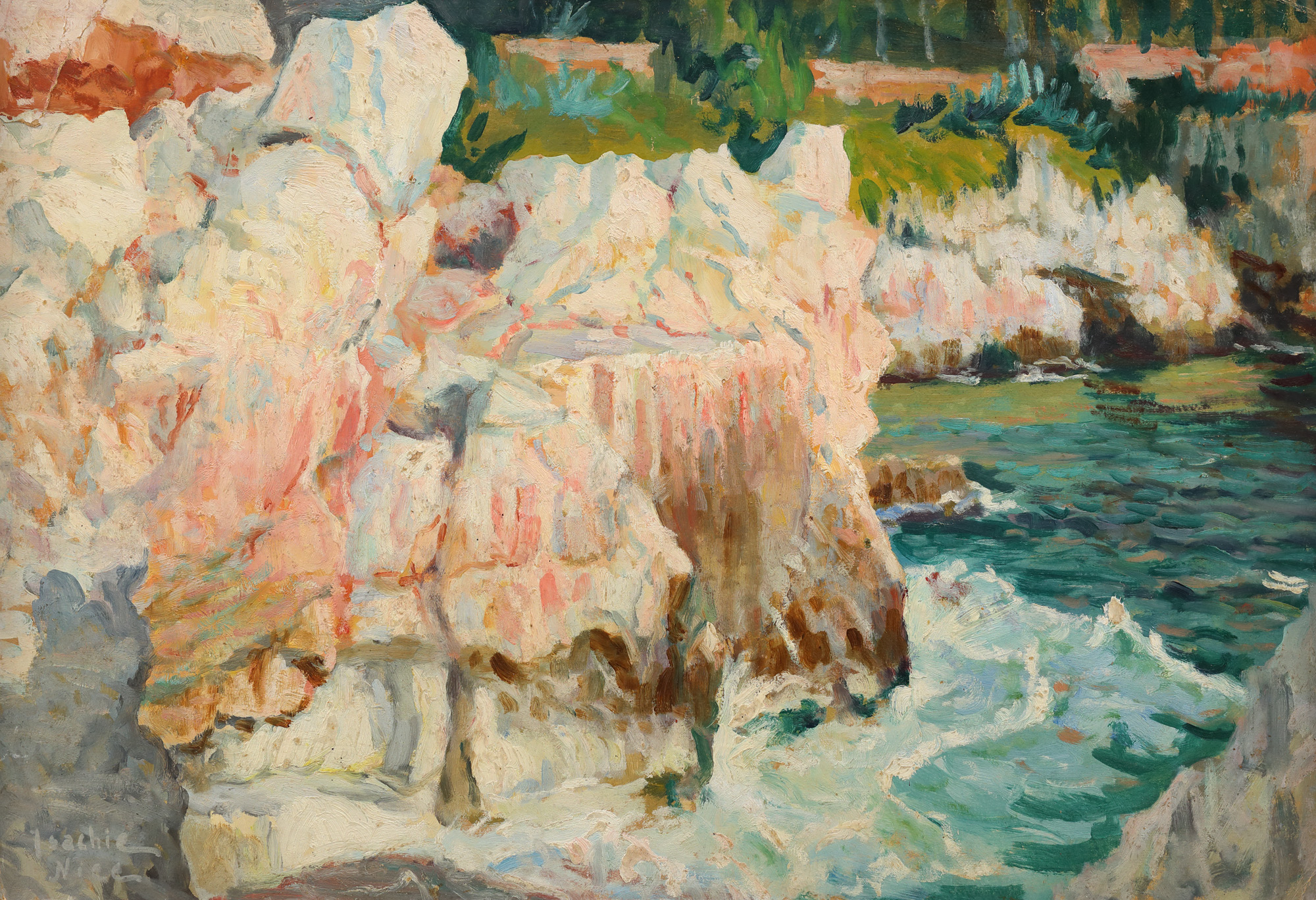 semnat și localizat stânga jos, cu alb, ”Isachie, Nice”