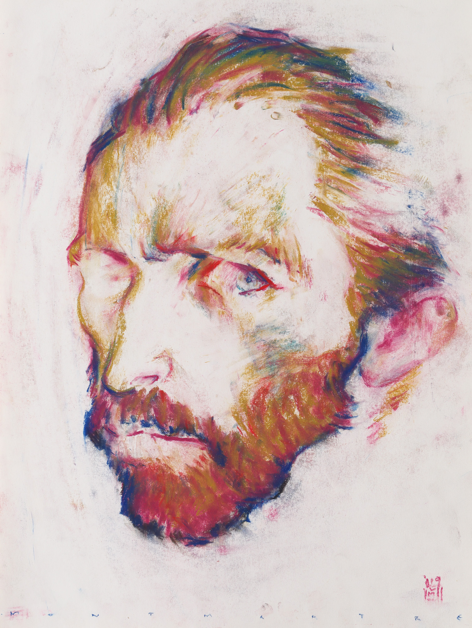 semnat și datat dreapta jos, cu roșu, în monogramă, "MM, (2)019"; semnat, datat, intitulat și localizat, pe verso, ”MANUEL MĂNĂSTIREANU, 2019, ”Thinking of Van Gogh”, Montmartre/Paris”