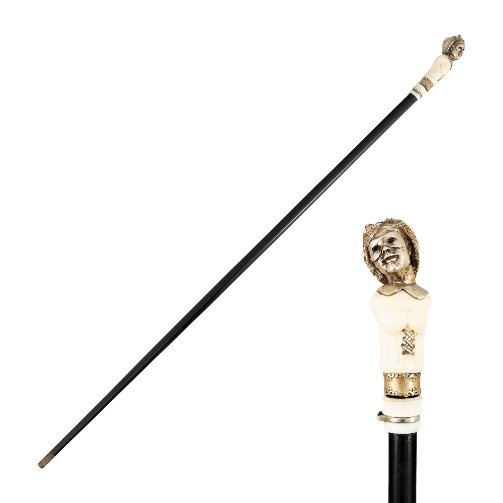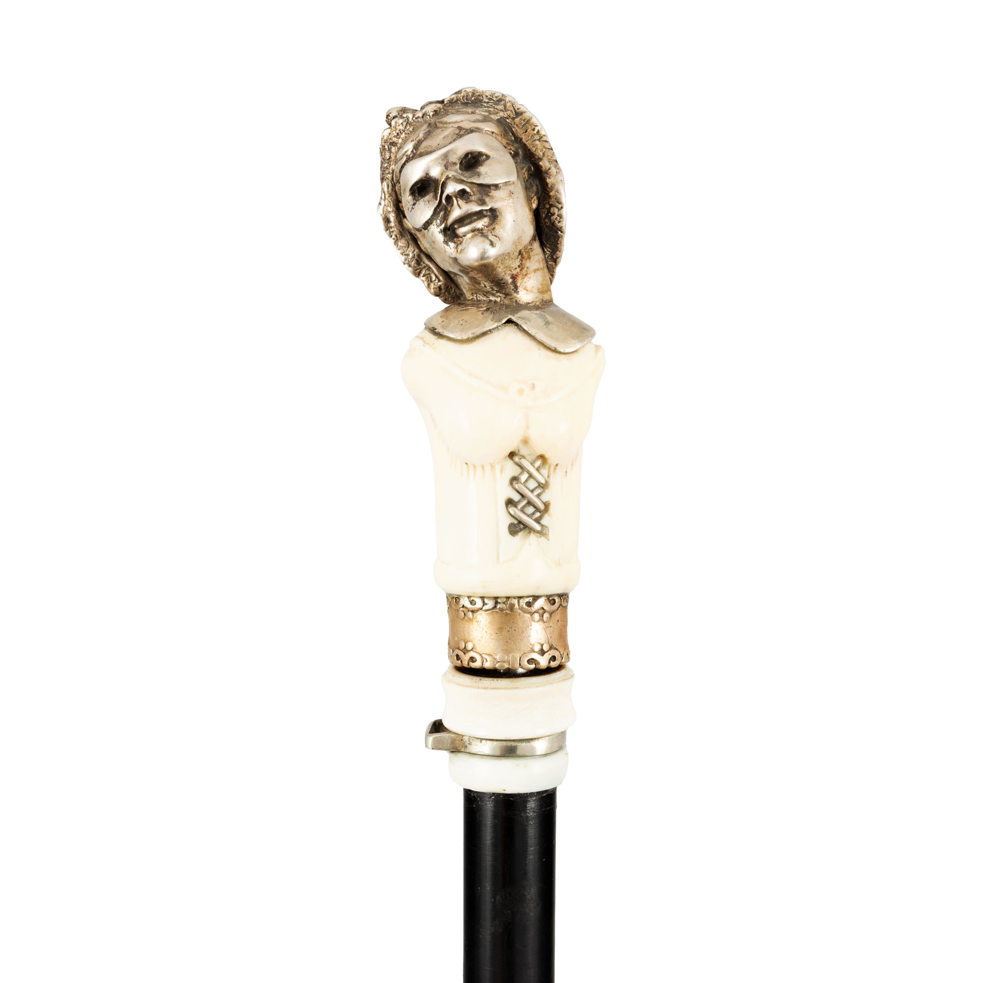 81. Baston cu stilet, din lemn ebenizat, decorat cu mâner din fildeș și argint în formă de arlechin, cca. 1900