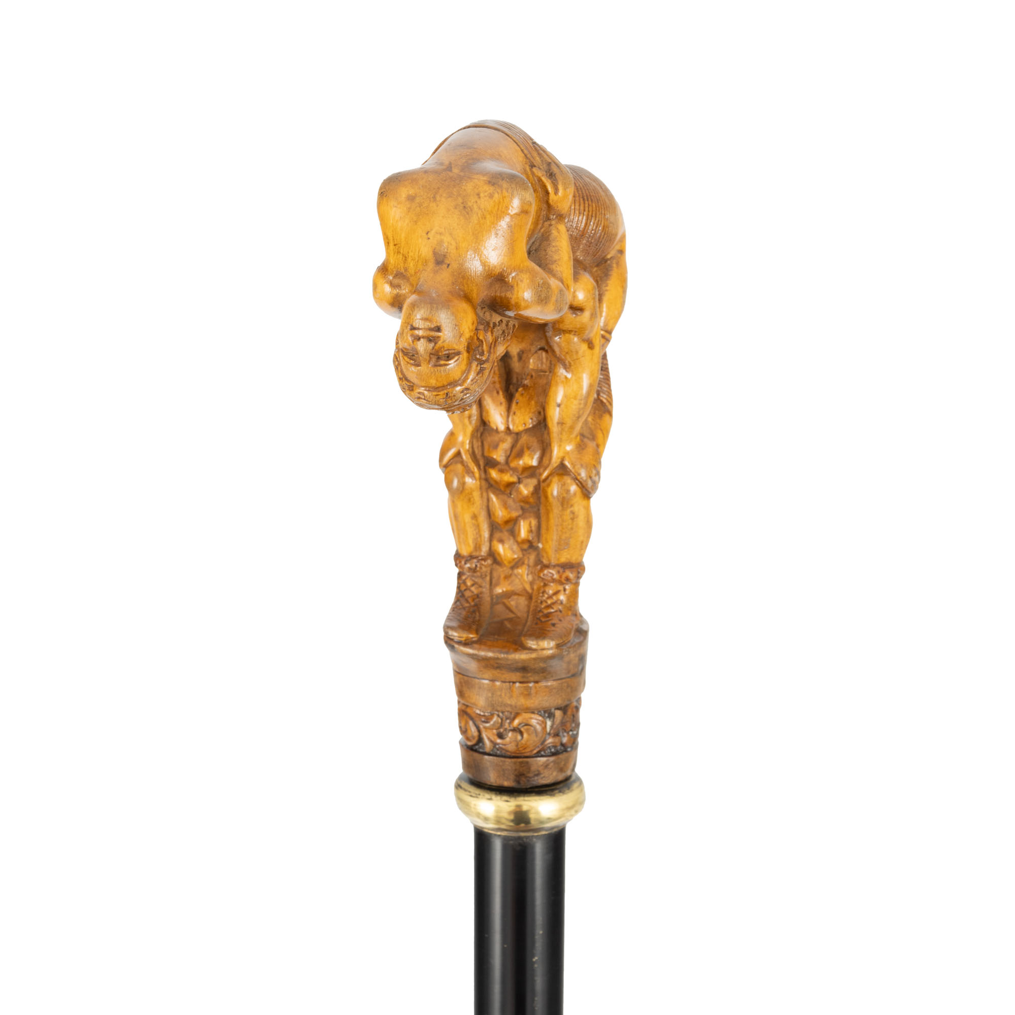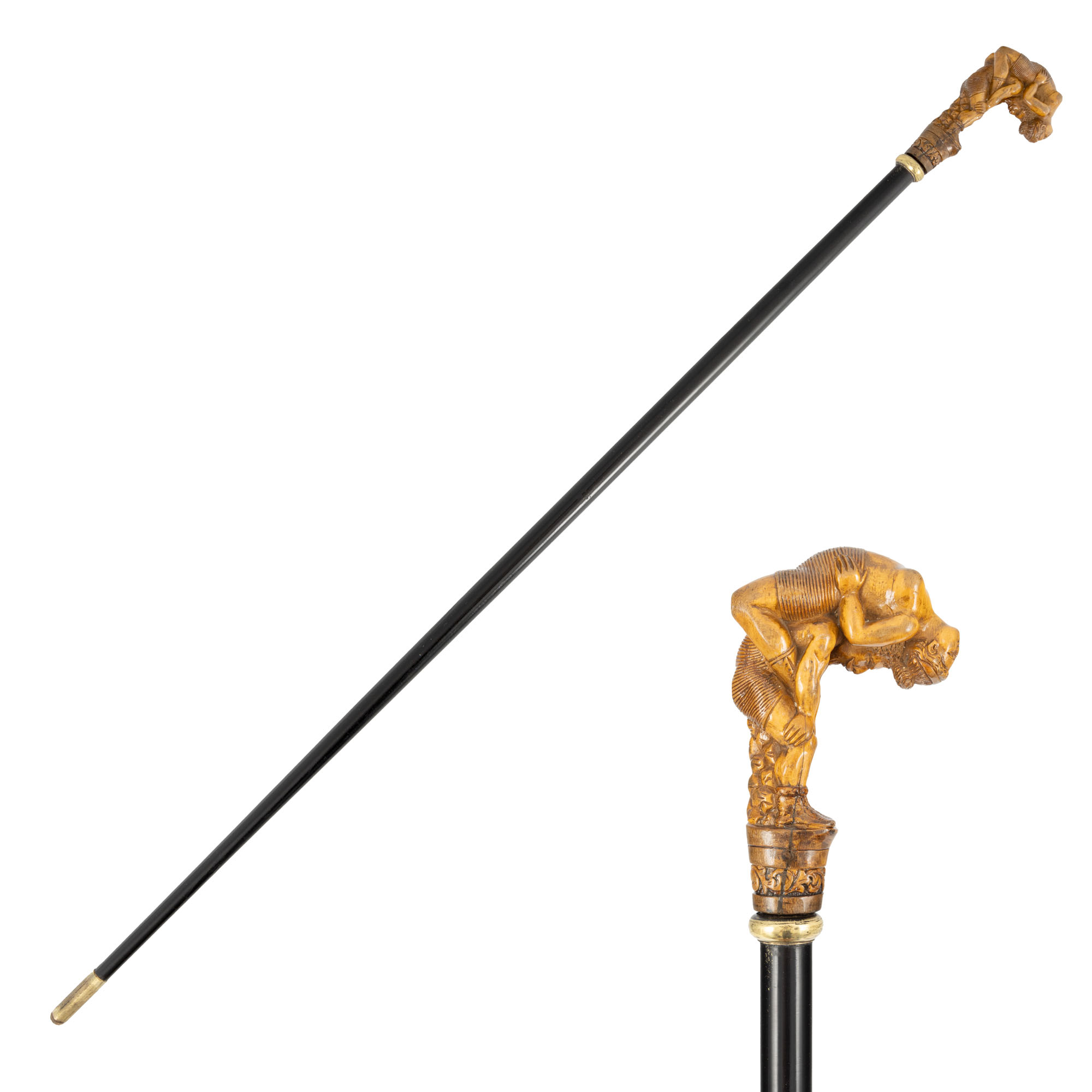 80. Baston cu stilet, din lemn ebenizat, decorat cu mâner din lemn exotic, reptezentând acrobați