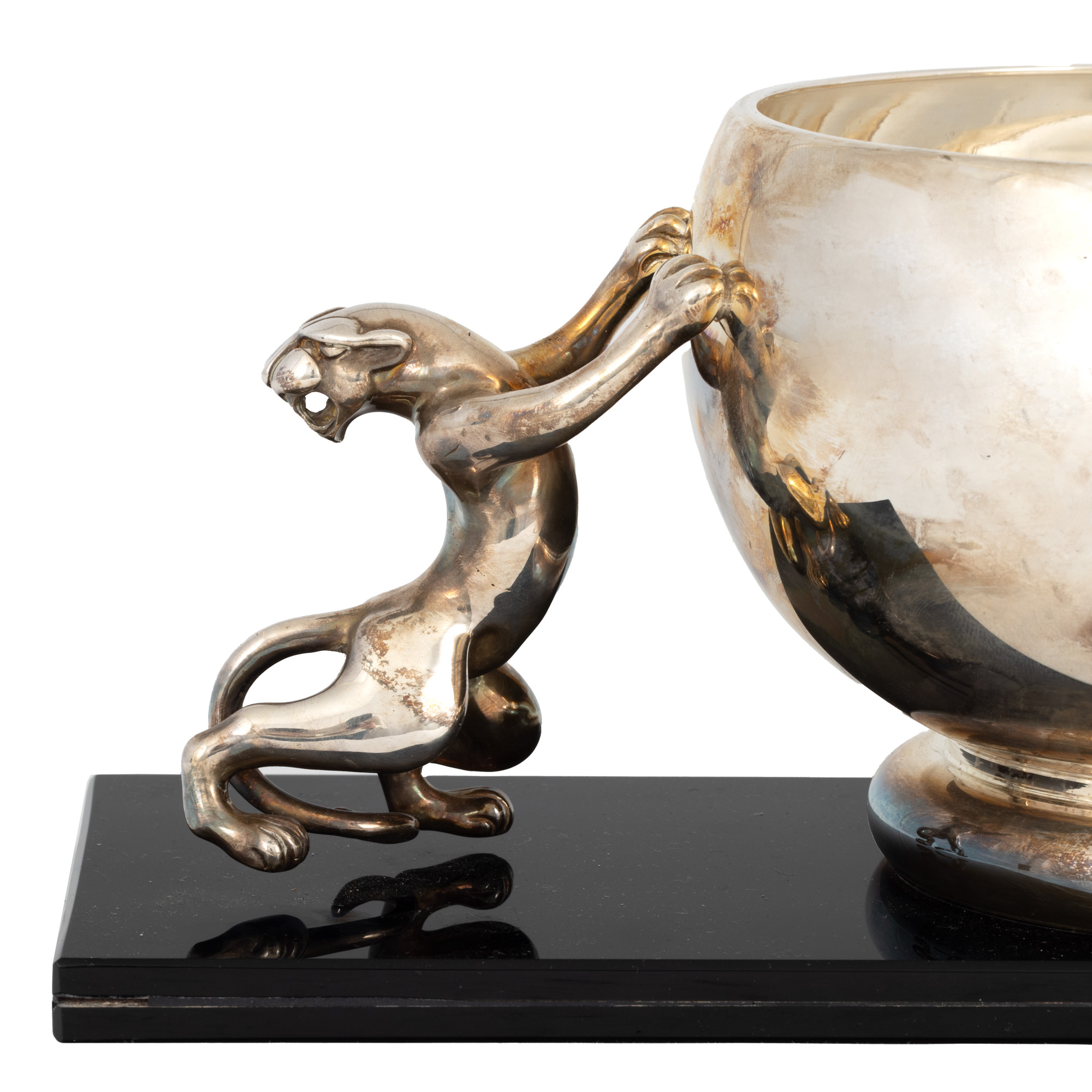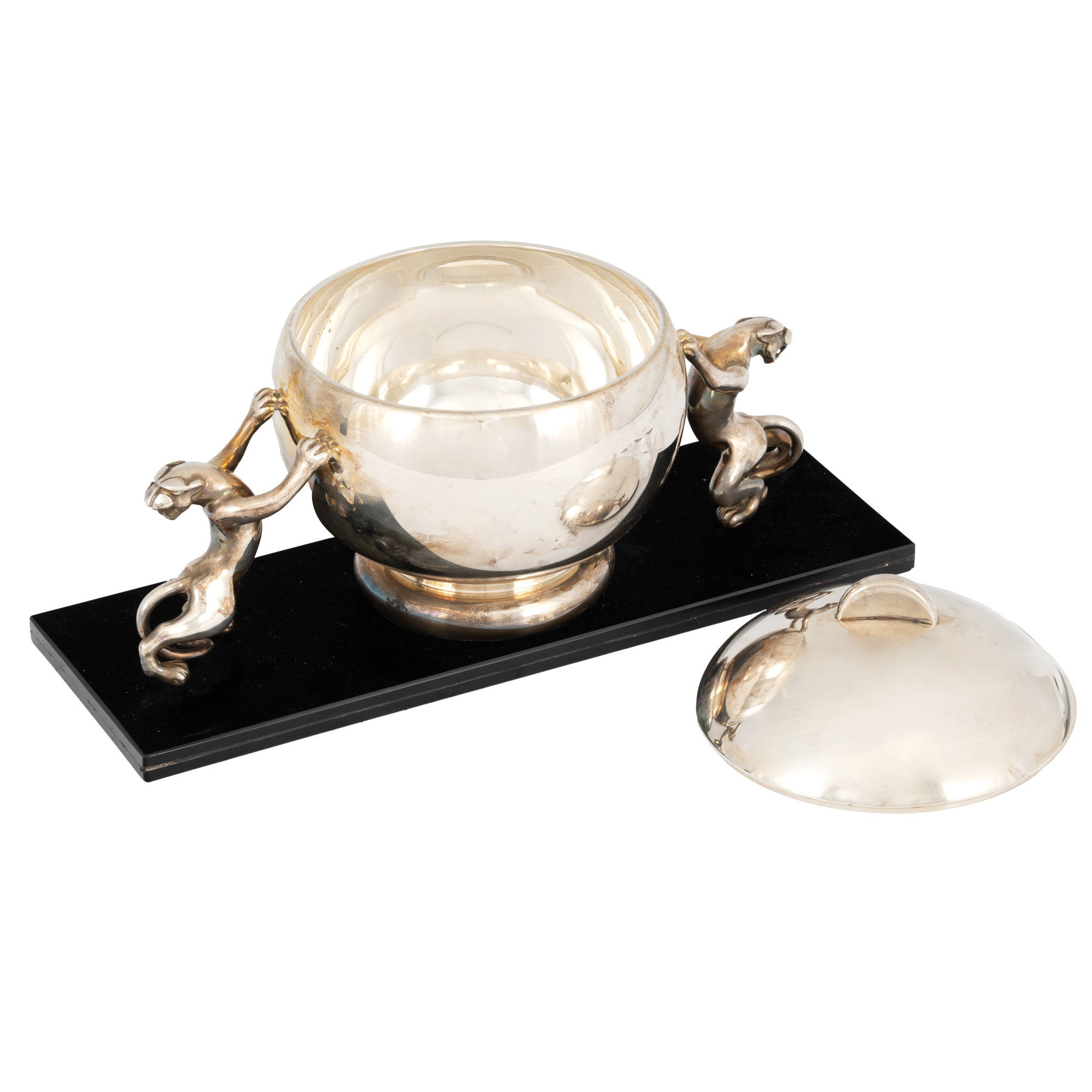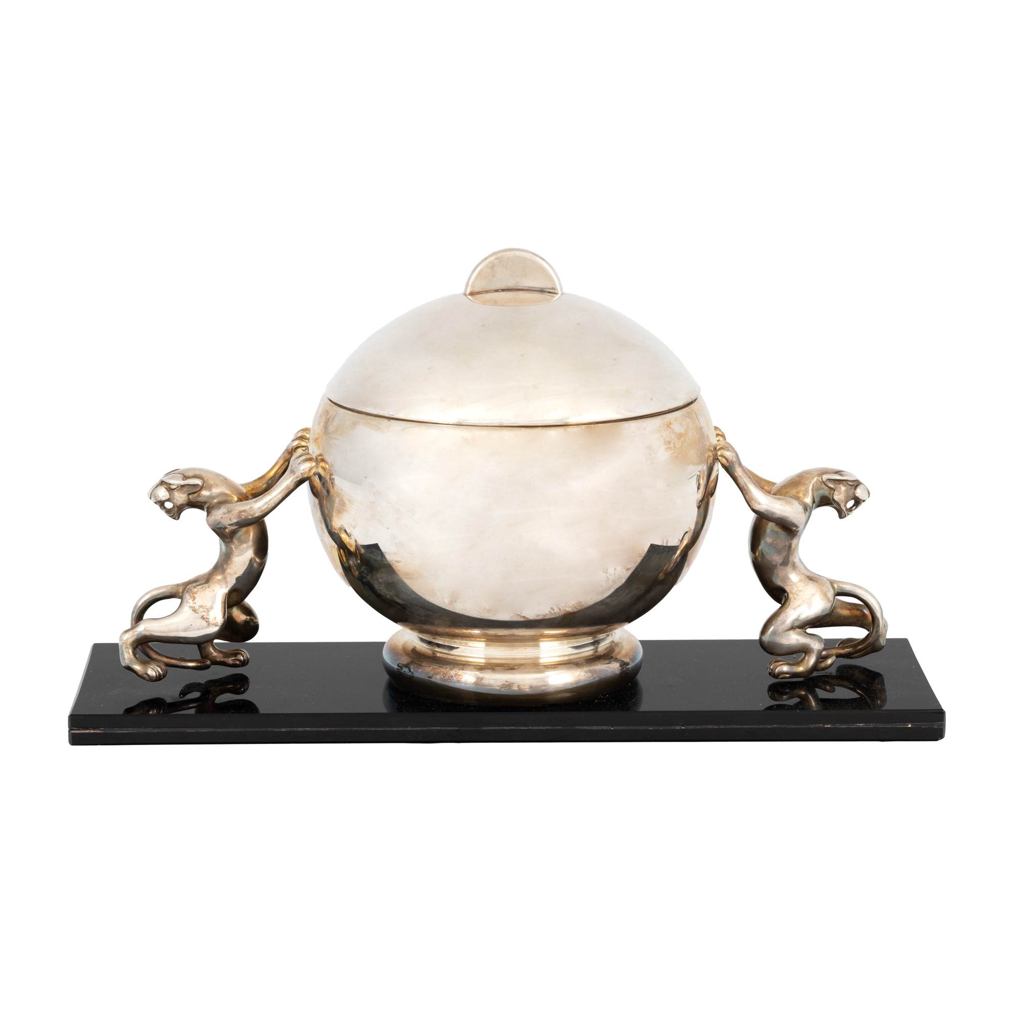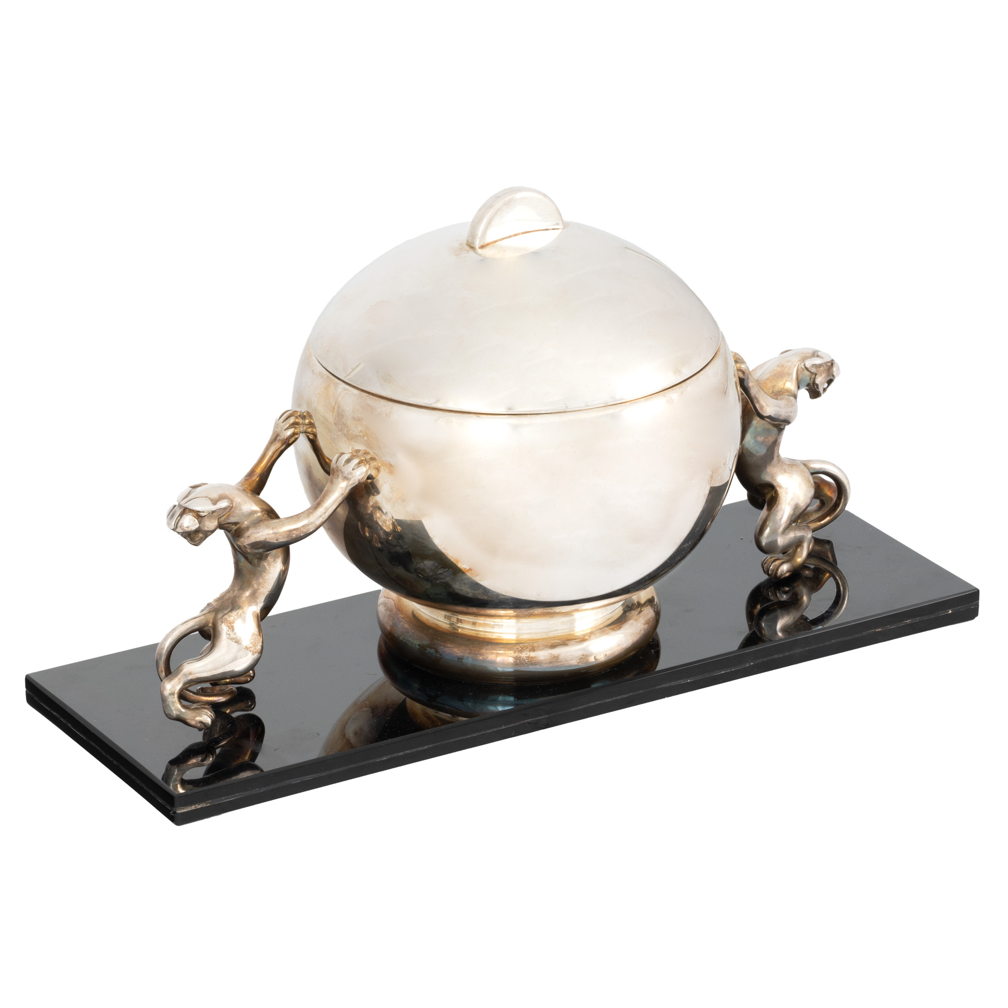 104. Bombonieră Art Deco din argint, ornată cu două feline, cca. 1930