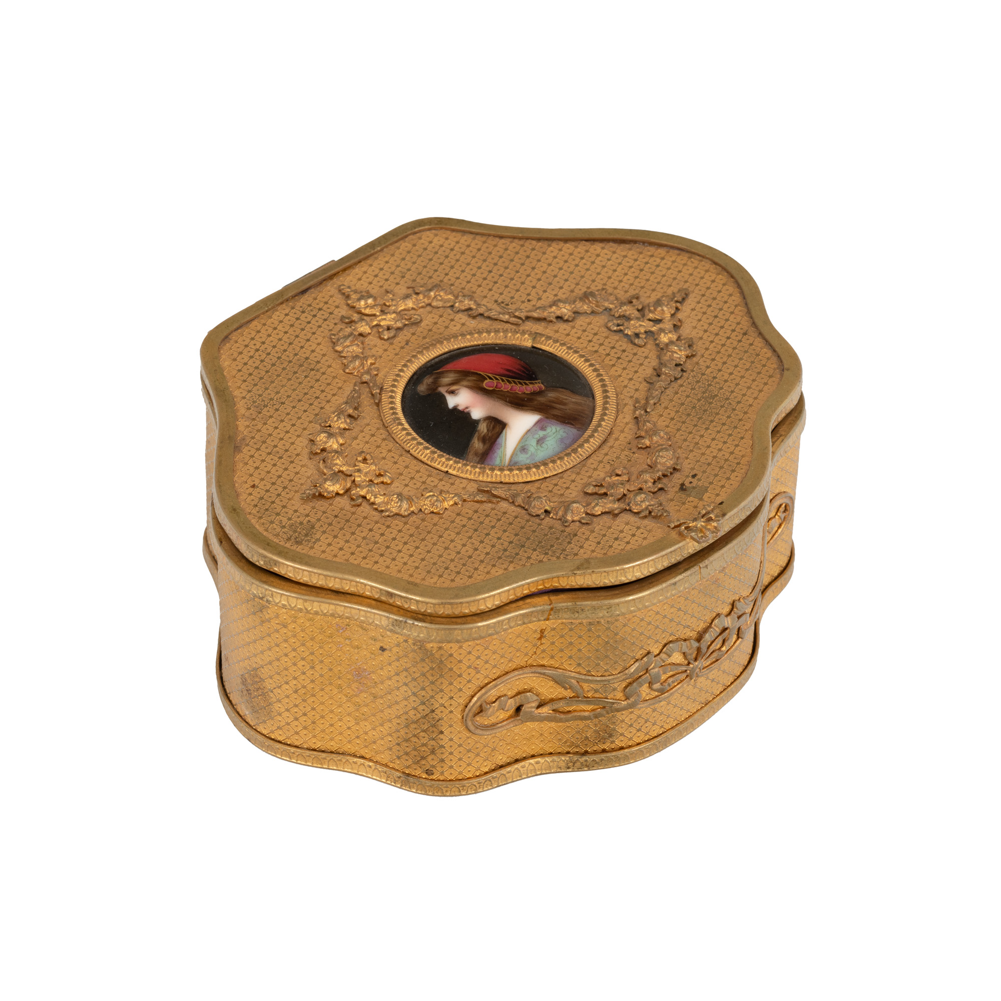 101. Casetă în manieră Louis XVI, pentru bijuterii, din bronz aurit, ornată cu medalion din porțelan pictat, cca. 1900