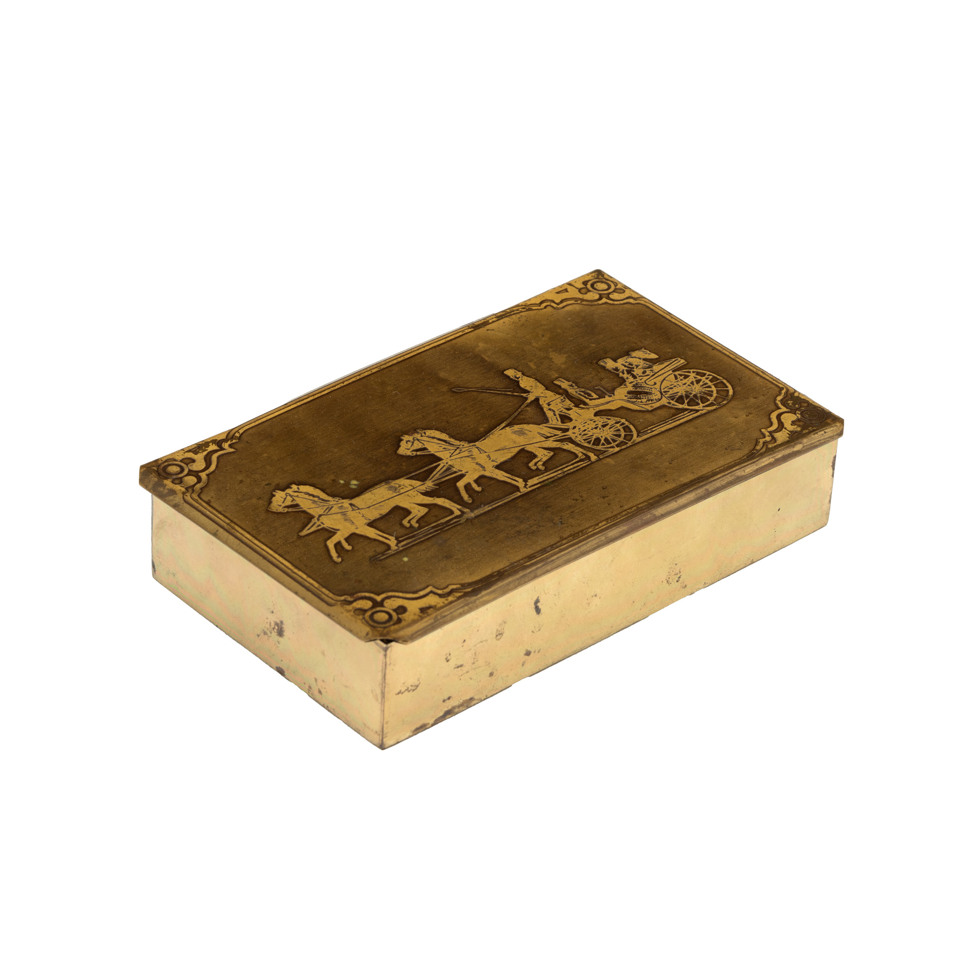 100. Casetă pentru cărți de joc, din alamă aurită, decorată cu trăsură model Victoria, cca. 1900