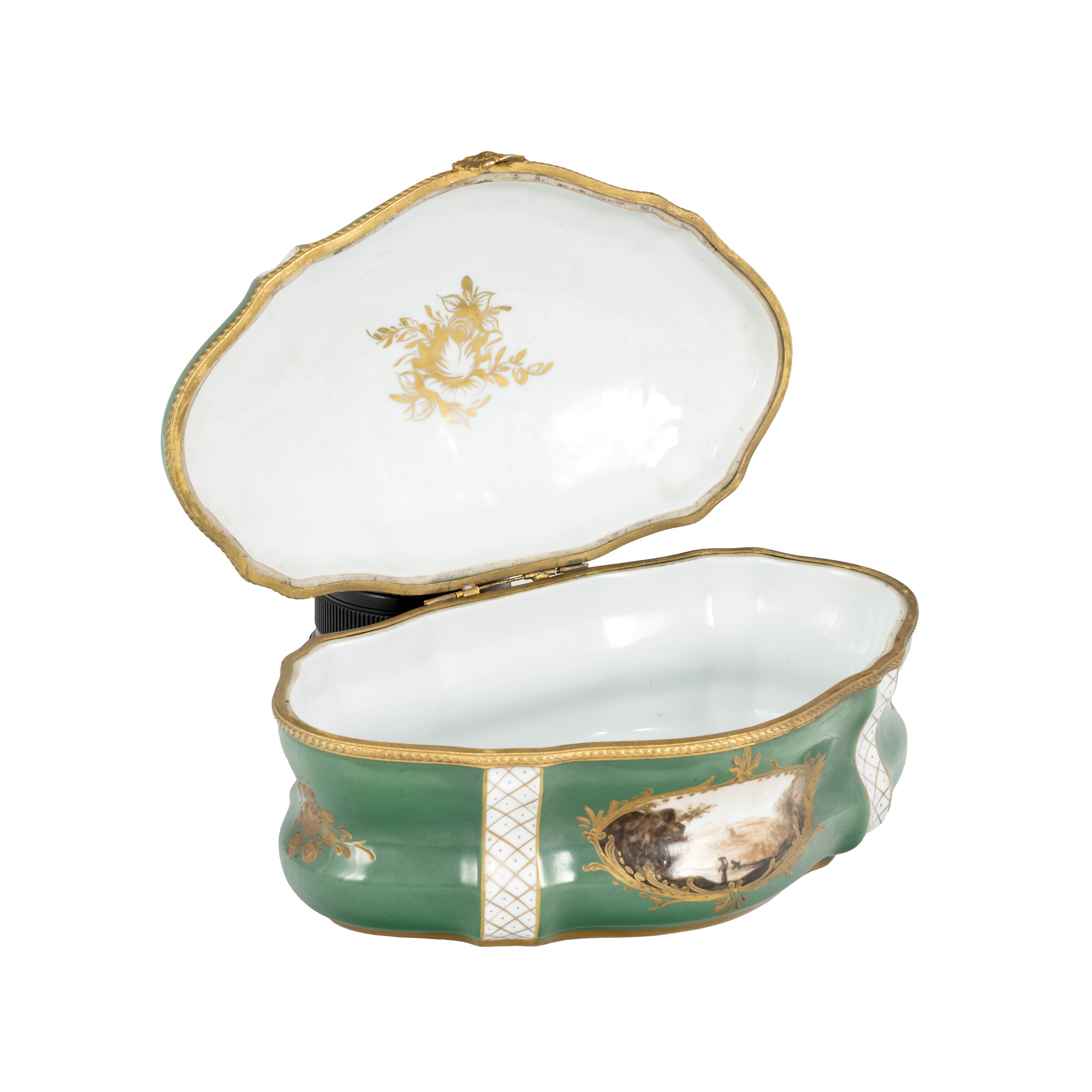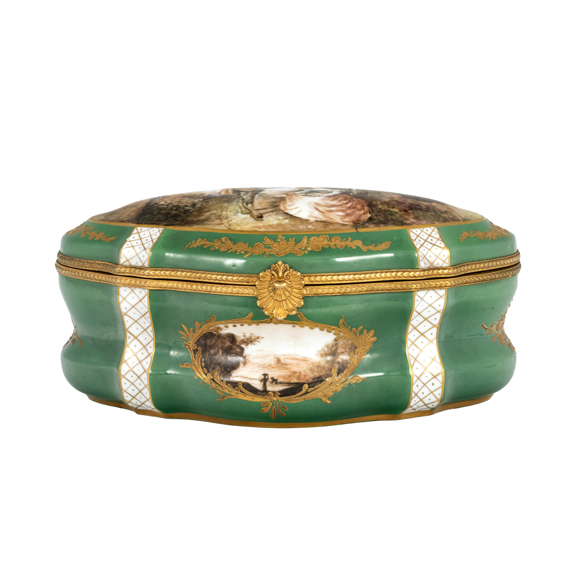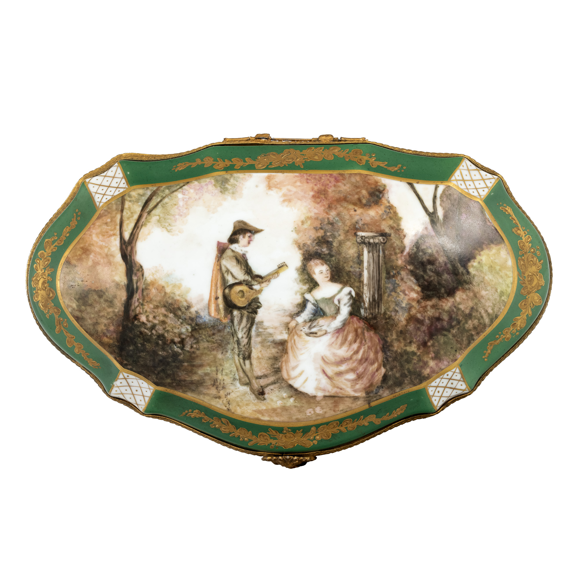 55. Casetă Sèvres din porțelan, decorată cu scenă idilică și montură din bronz doré, sfârșitul sec. XIX