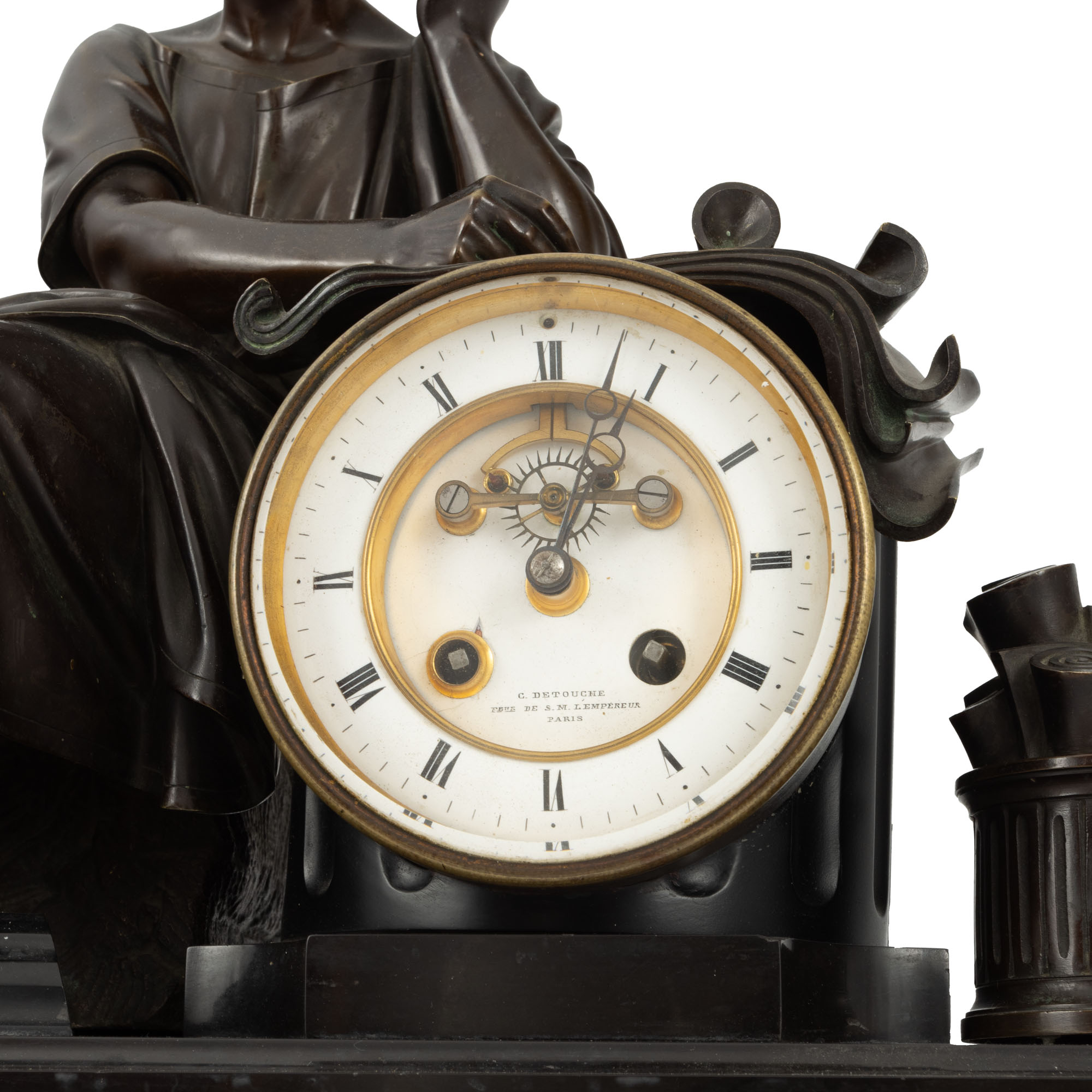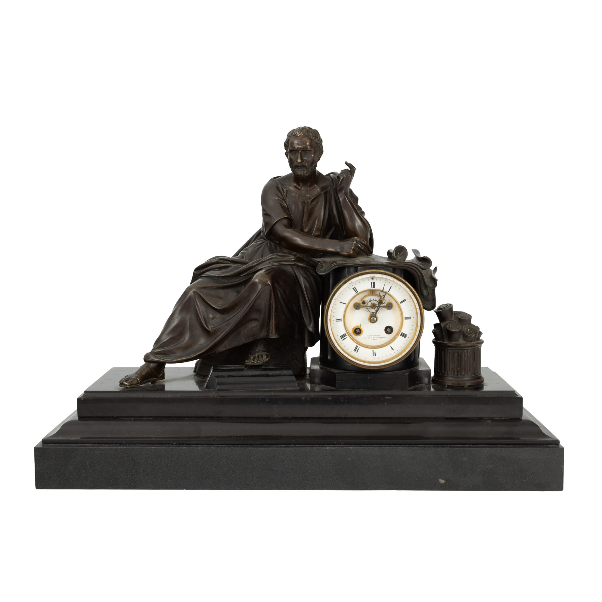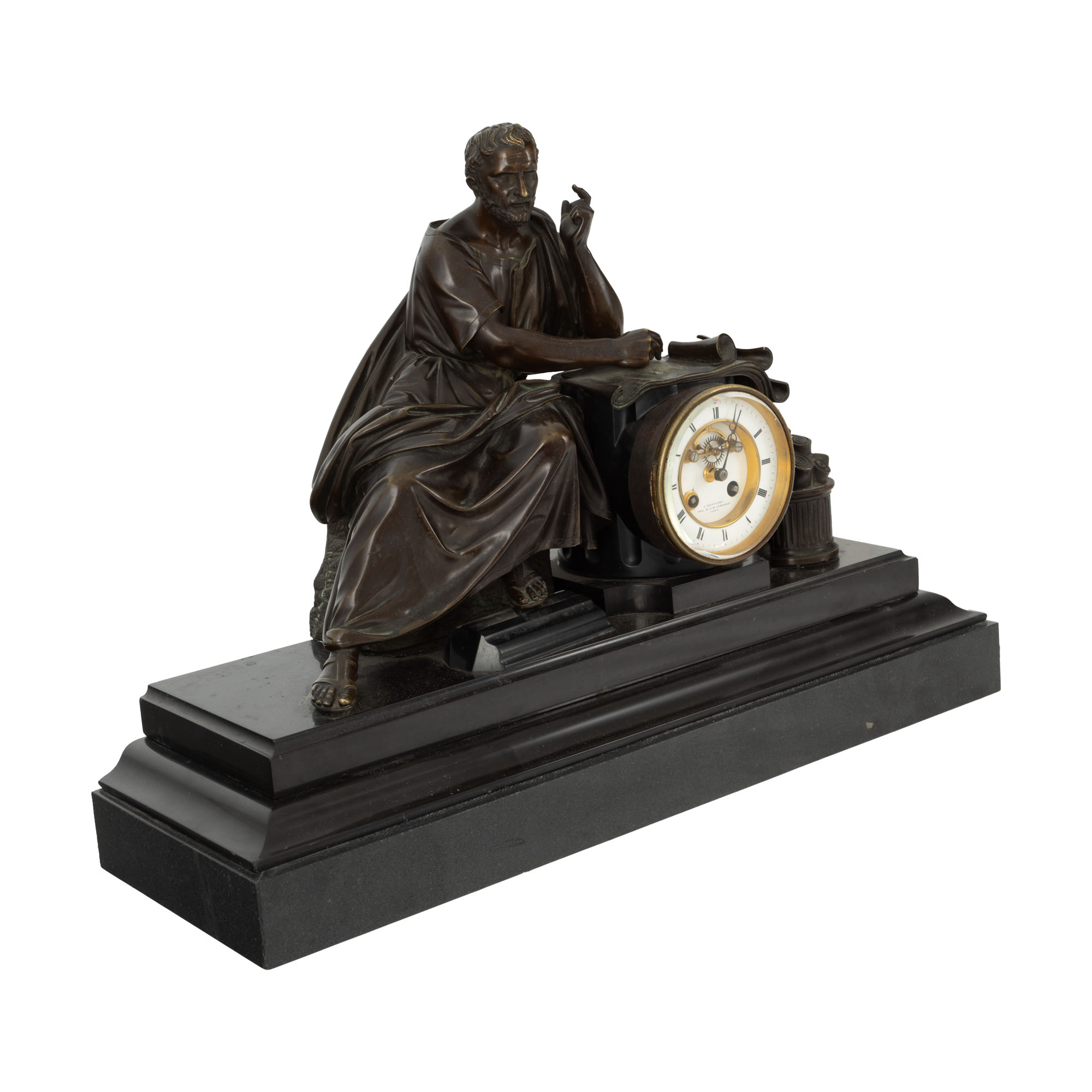 106. Ceas de șemineu în manieră Neo-Clasică, din bronz și marmură, decorat cu un filozof (probabil Platon), sfârșitul sec. XIX