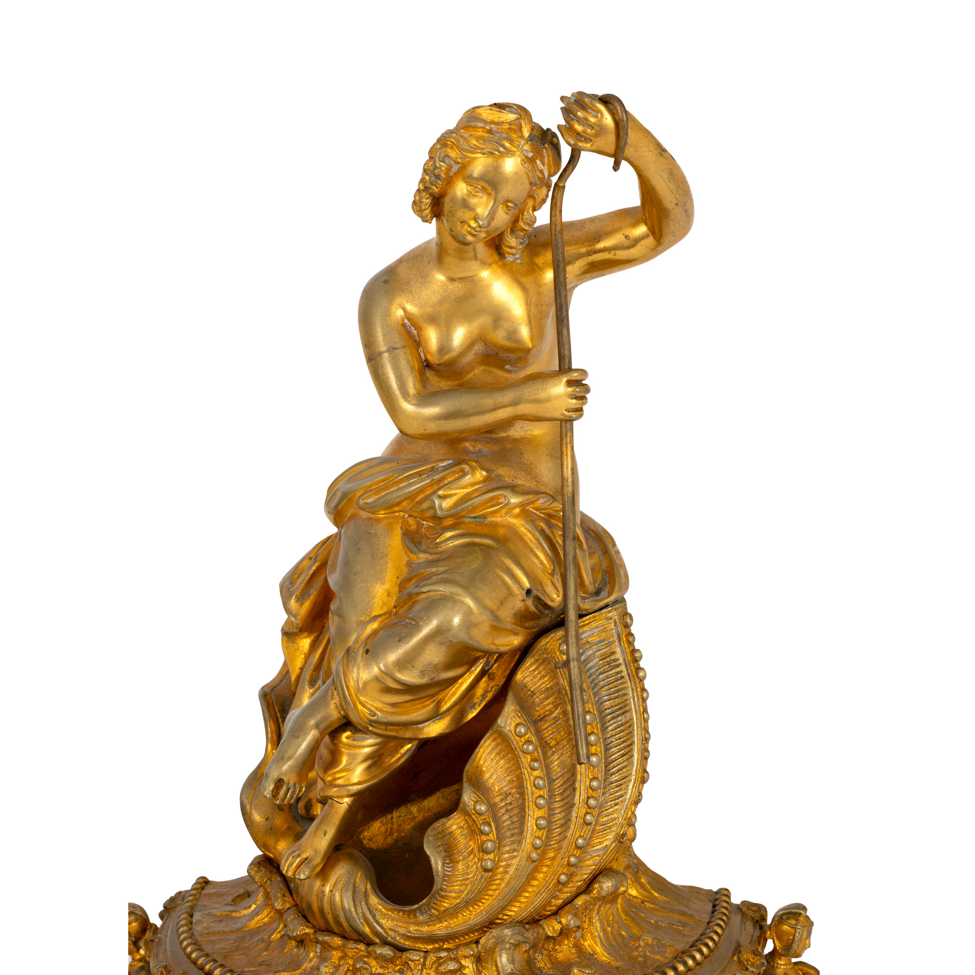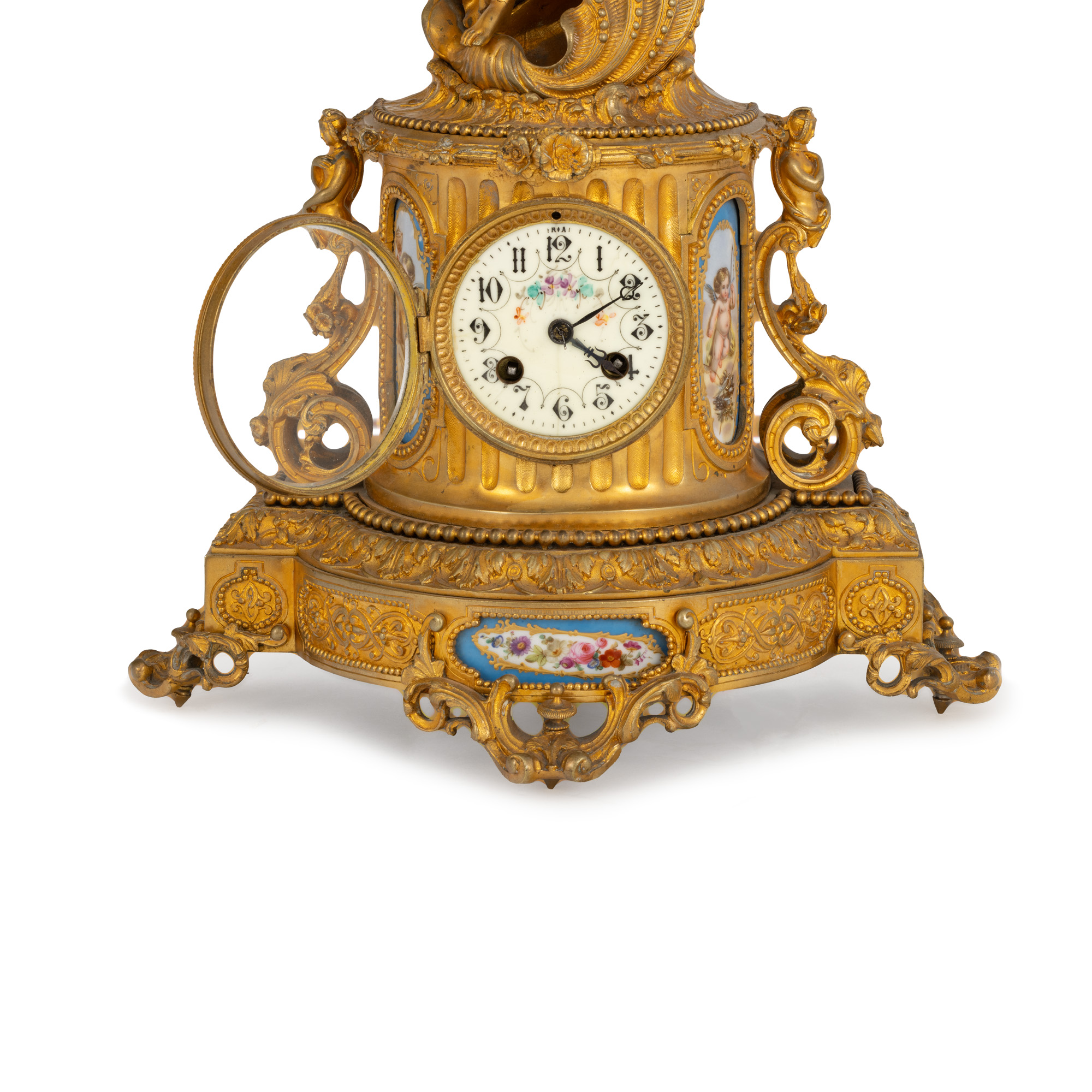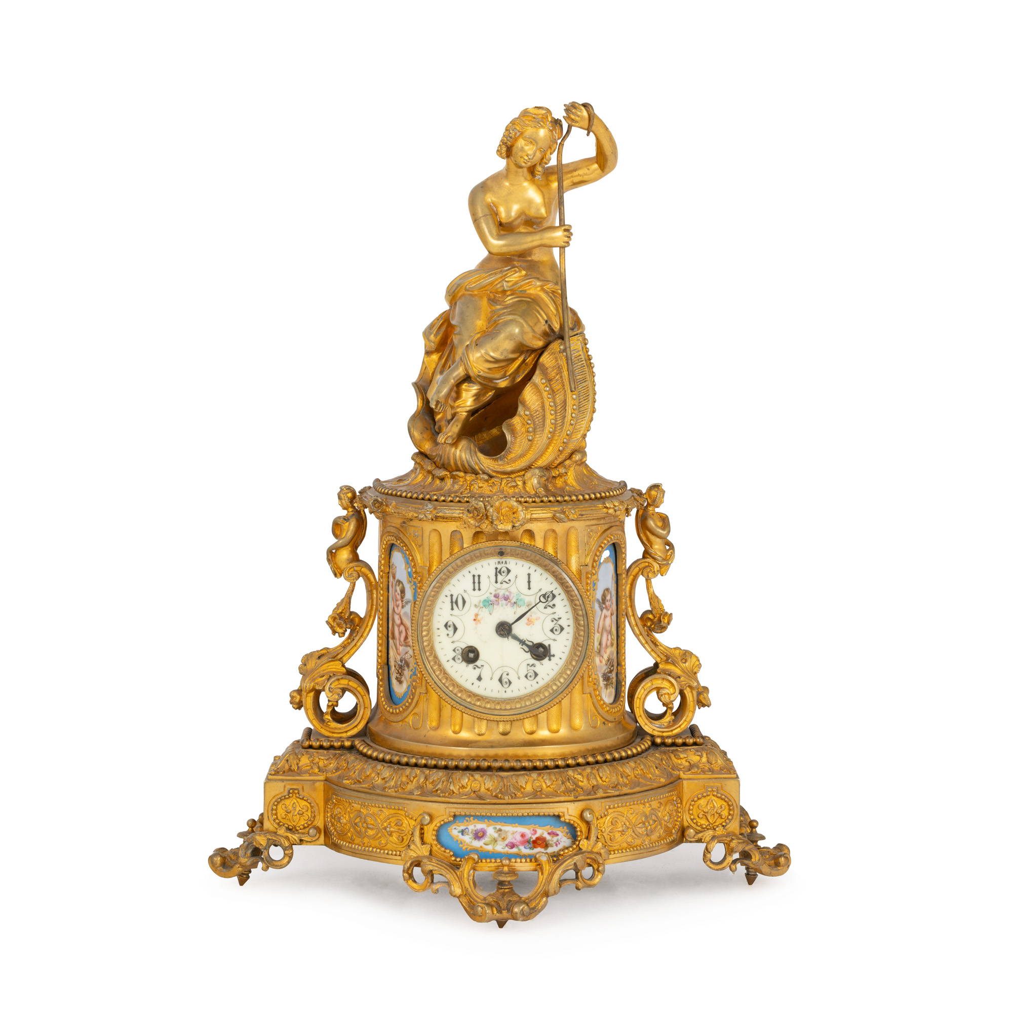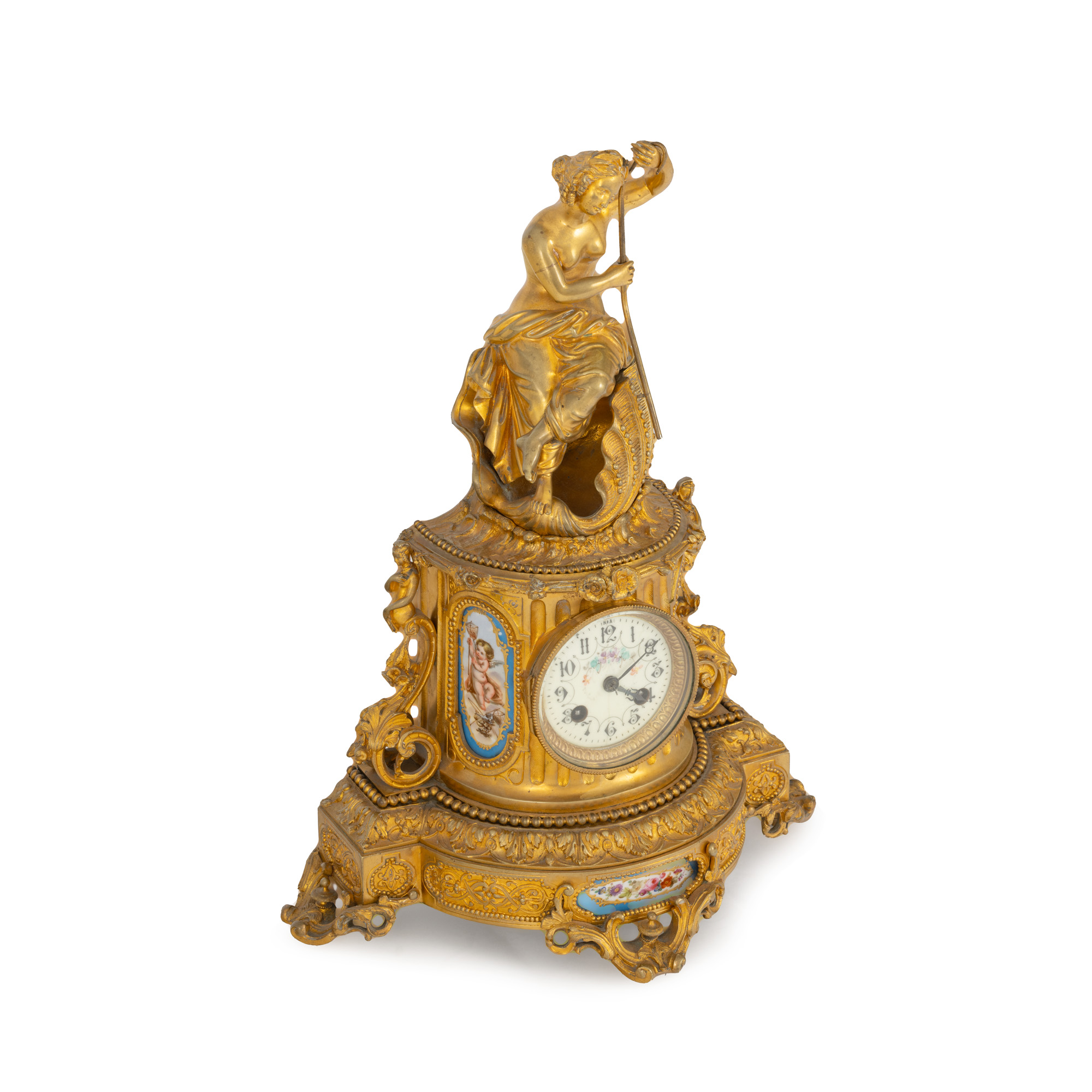 45. Ceas în manieră Louis XV, din bronz doré, decorat cu nereidă și panouri din porțelan pictat cu putti și motive florale, sfârșitul sec. XIX