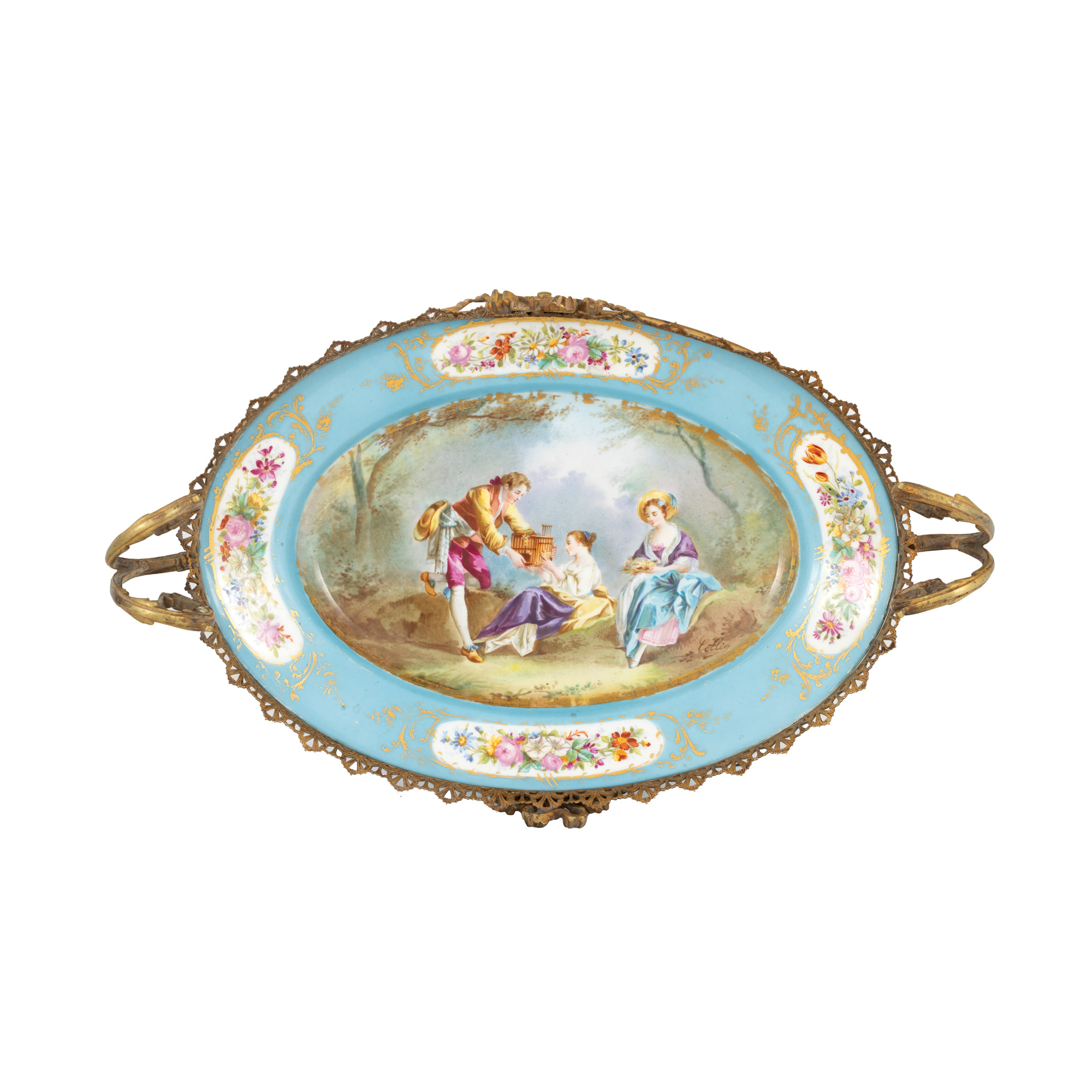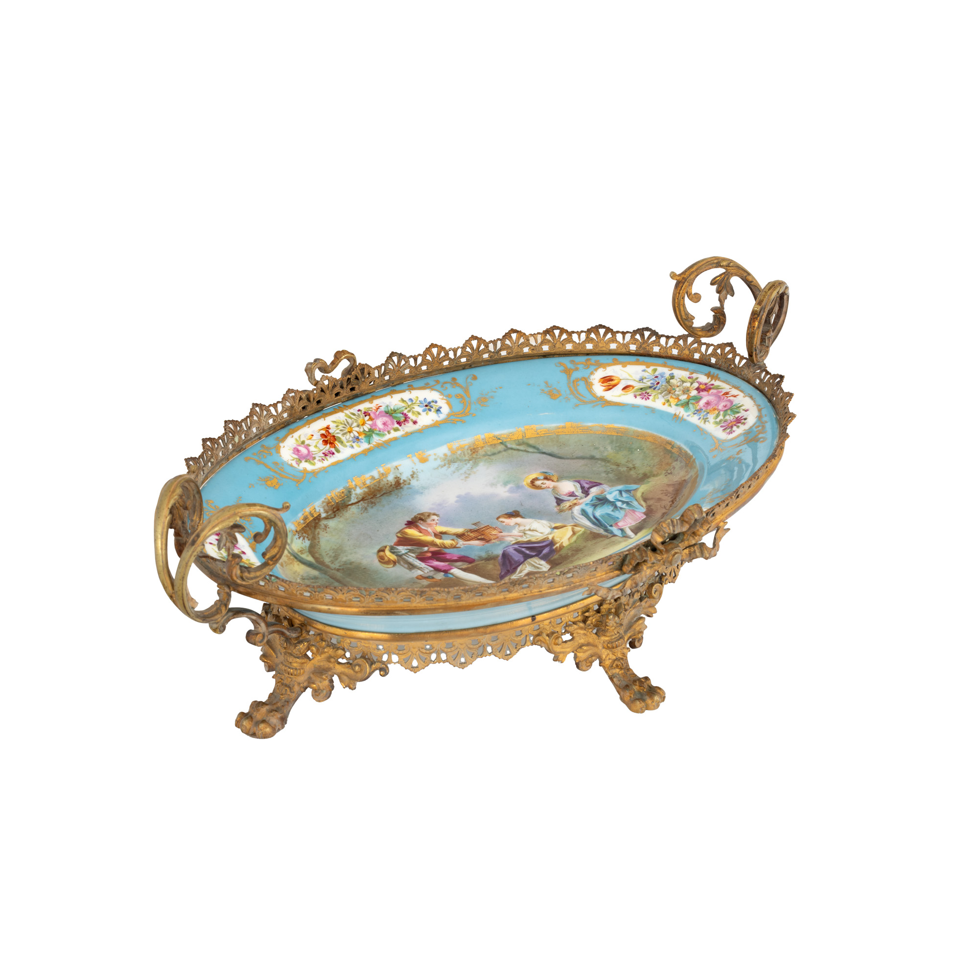 114. Fructieră Sèvres din porțelan, decorată cu scenă idilică și montură din bronz doré, cca. 1880