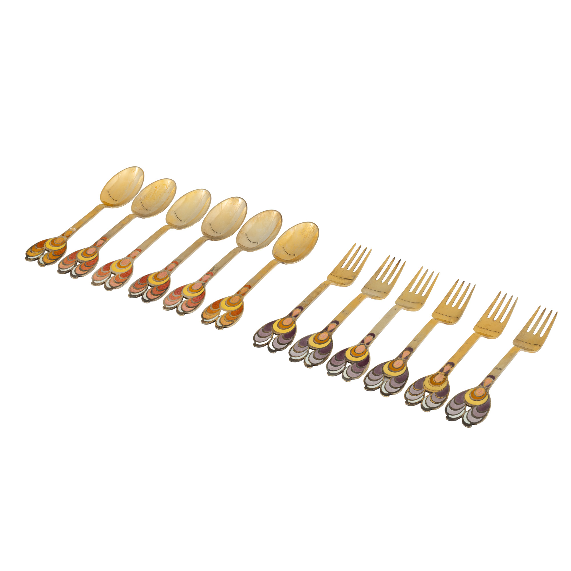 2. ”Herald” - set de tacâmuri din argint aurit, manieră Art Nouveau scandinav, format din șase lingurițe și șase furculițe, decorate cu email, design Bjørn Wiinblad pentru Anton Michelsen, cca. 1972