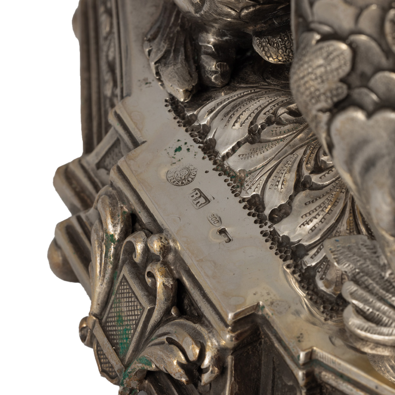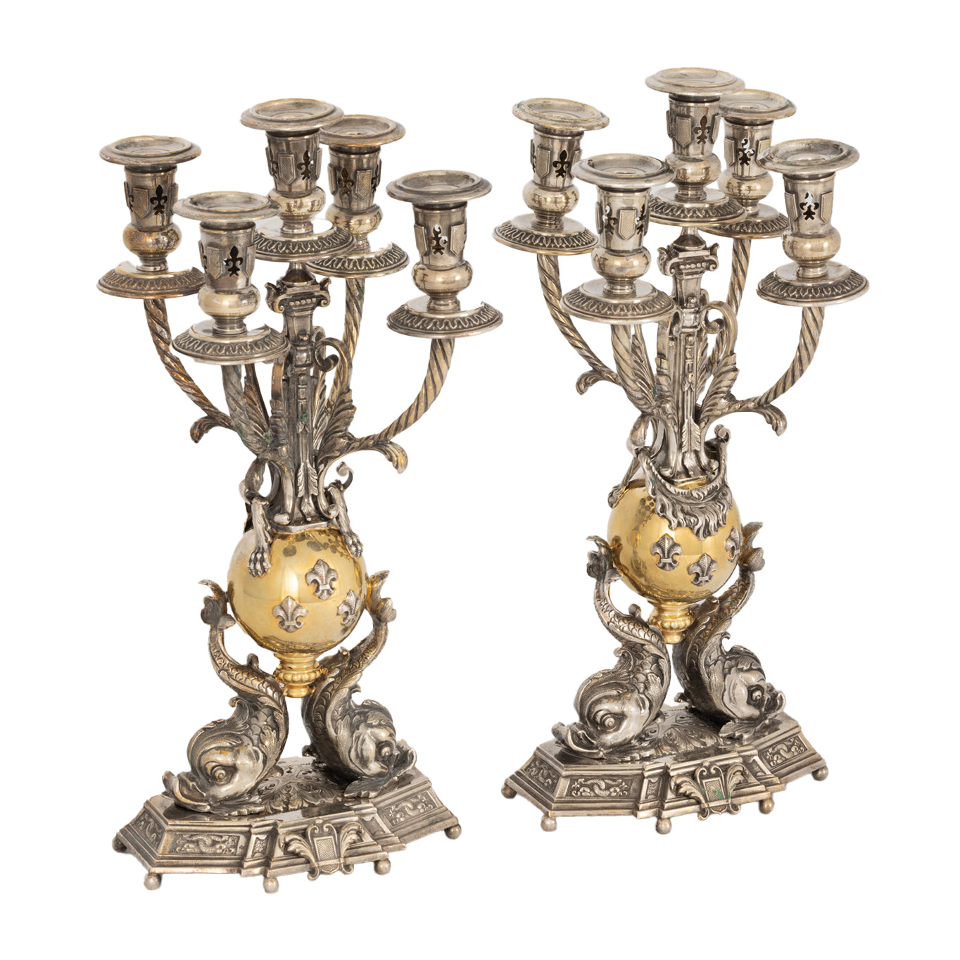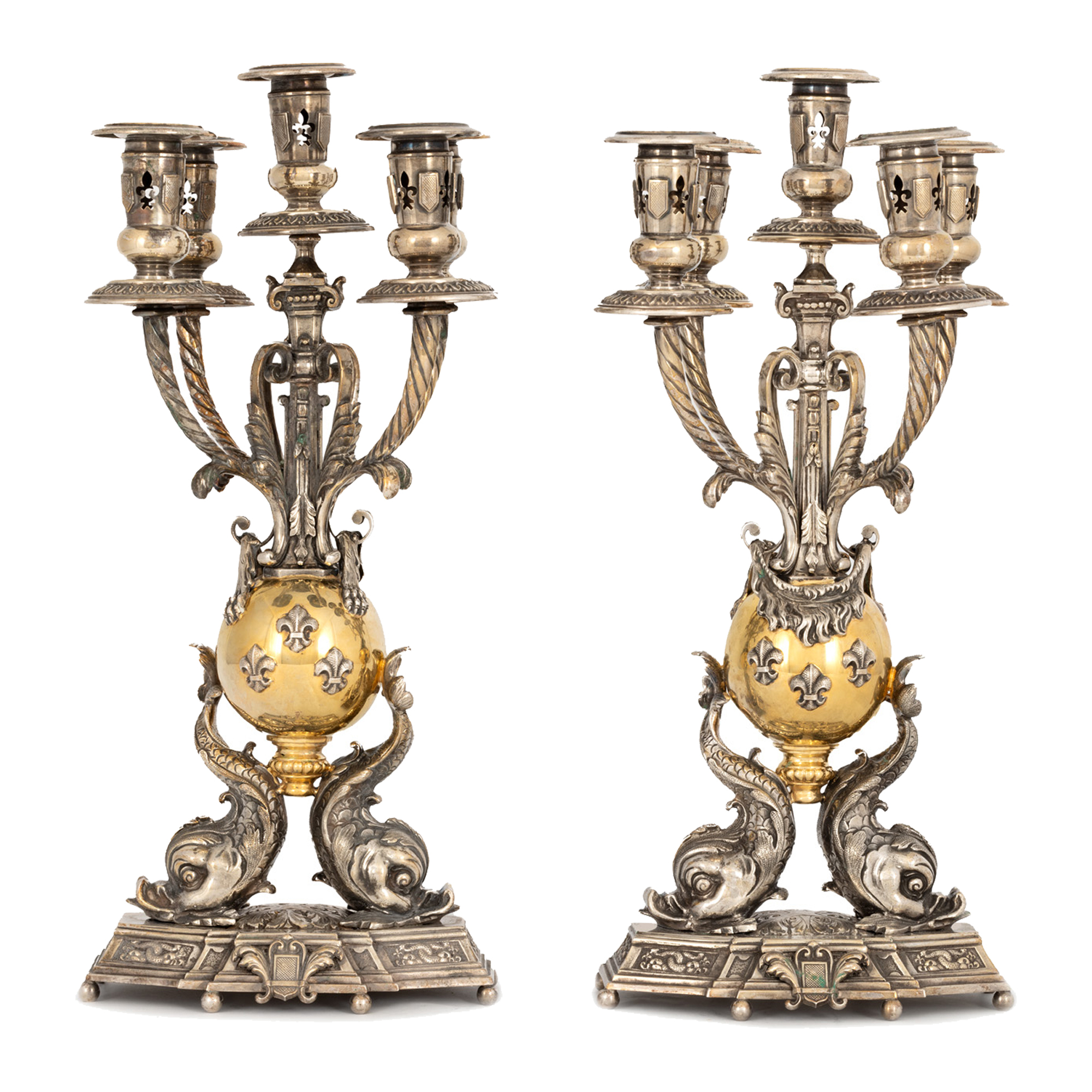 56. Monumentală pereche de sfeșnice Brandimarte, din argint parțial aurit, ornată cu elemente marine și fleur-de-lis [mijlocul sec. XX]