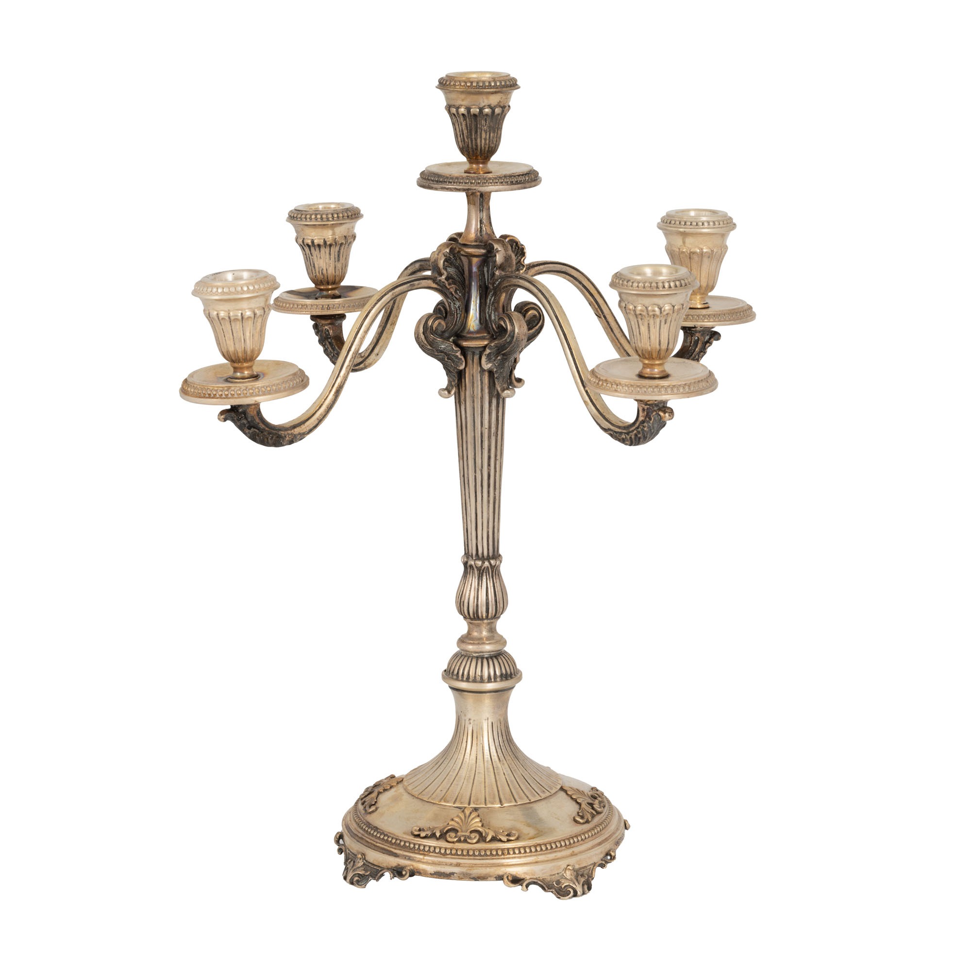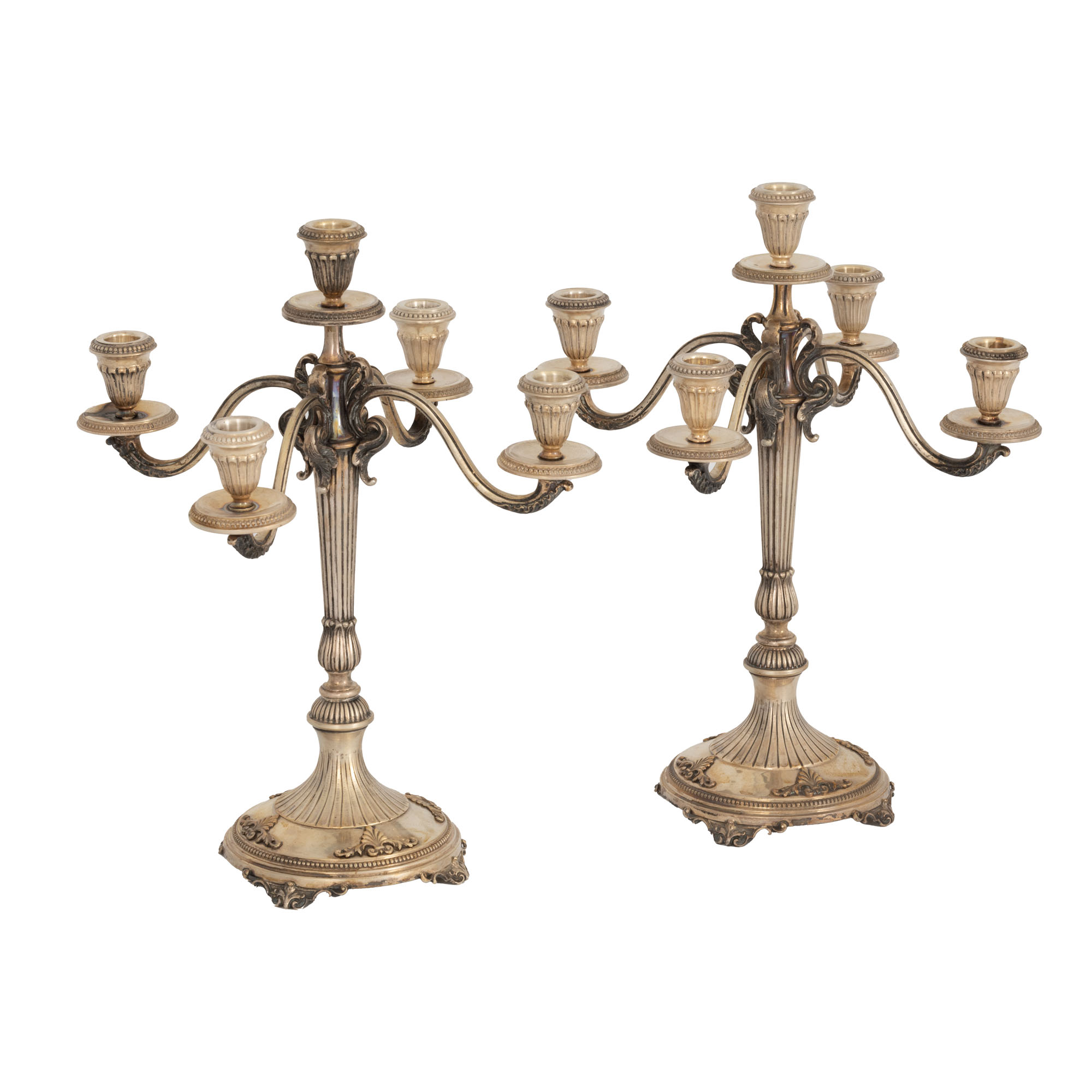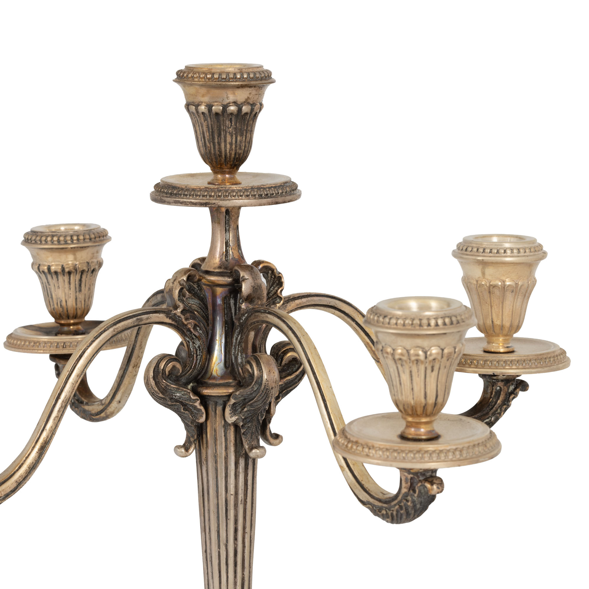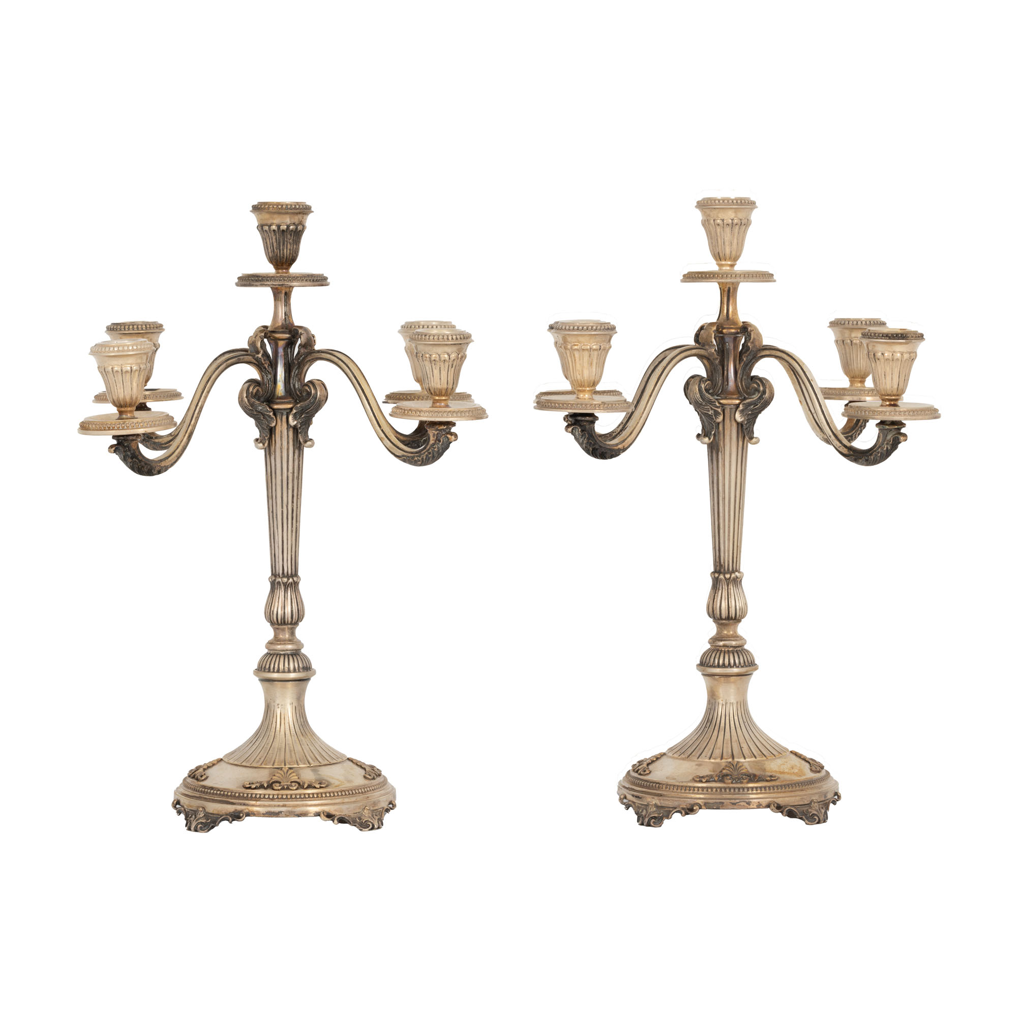 103. Pereche de sfeșnice în manieră Louis XVI, din argint, cu cinci lumini, sfârșitul sec. XIX