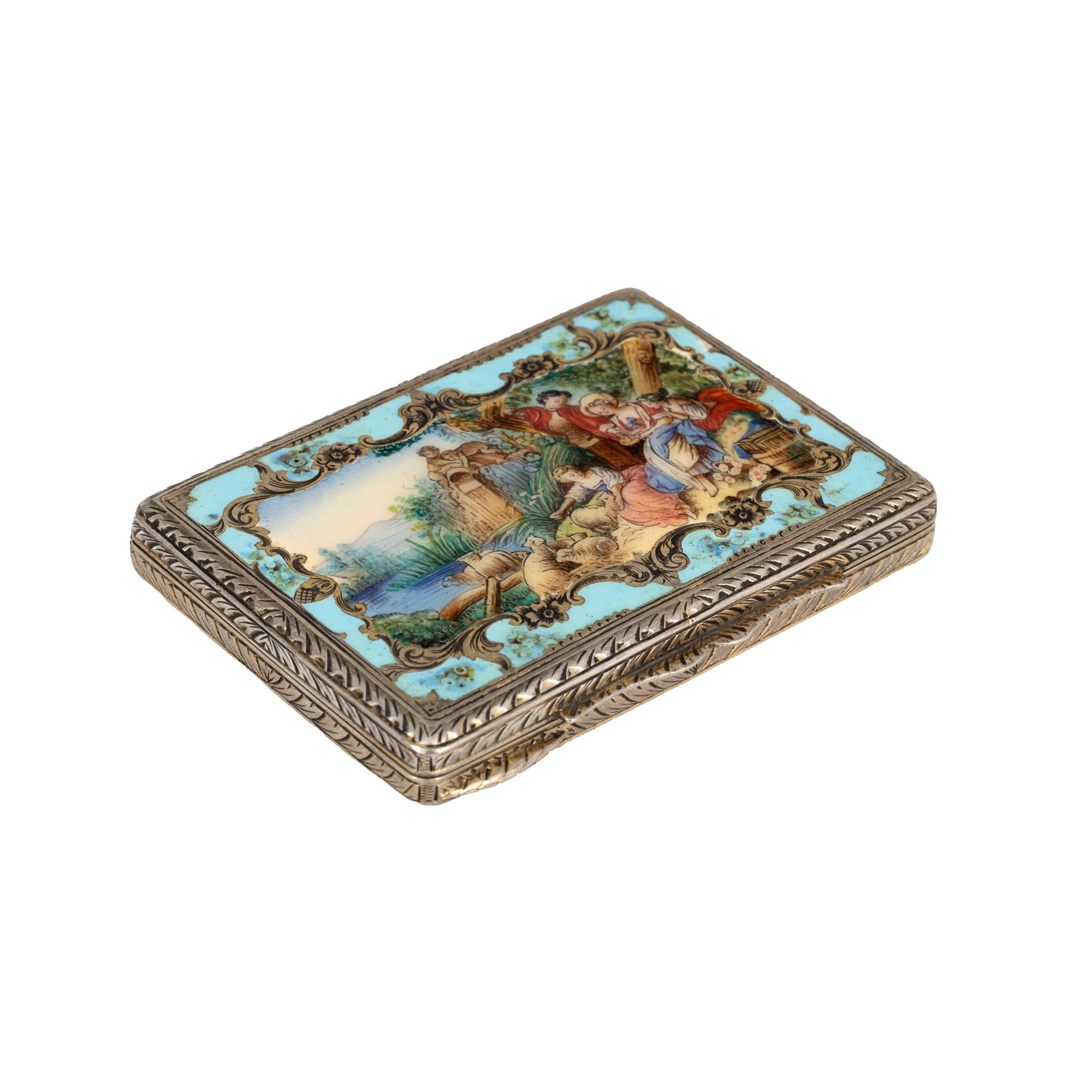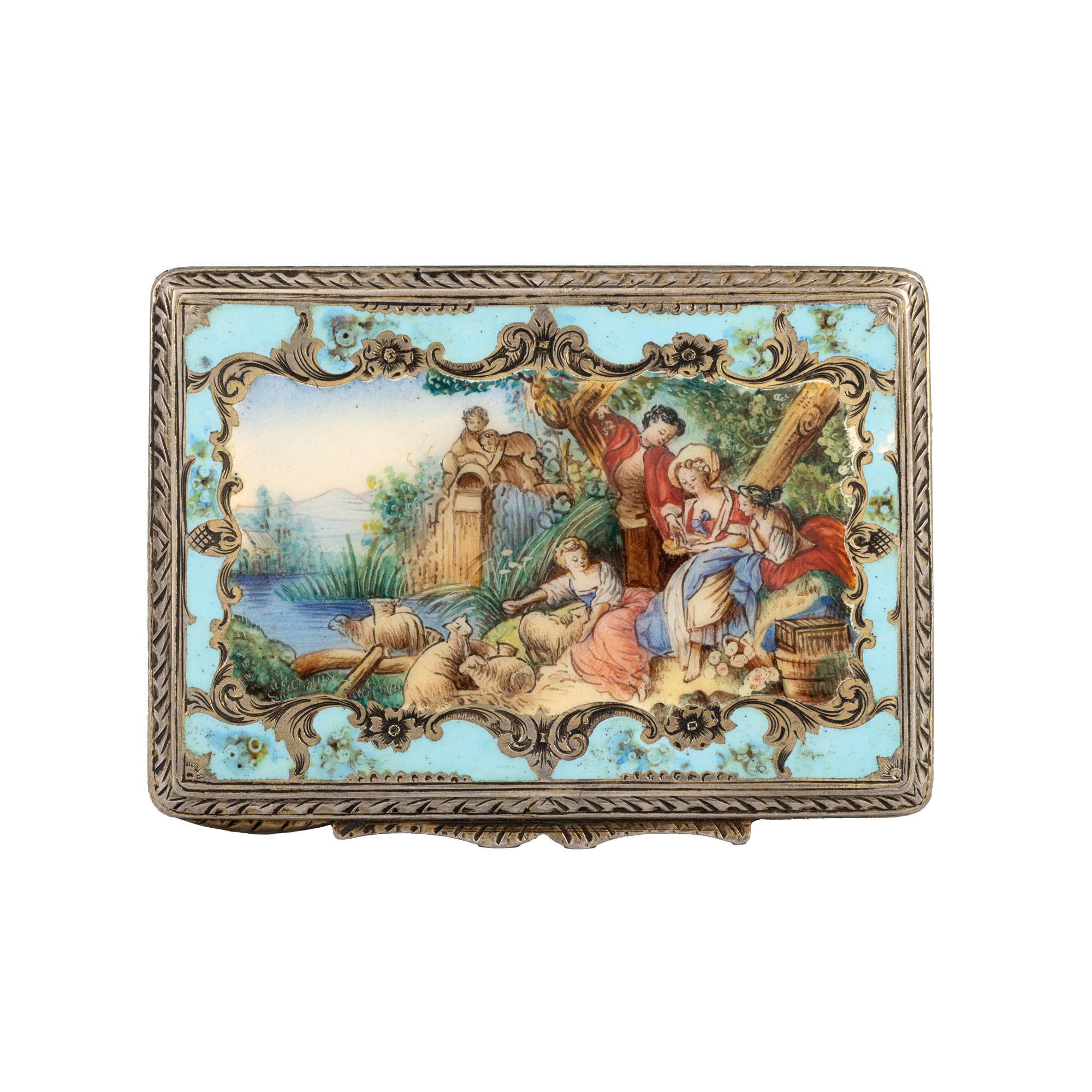 94. Pudrieră din argint, decorată cu scenă idilică, în email, cca. 1935