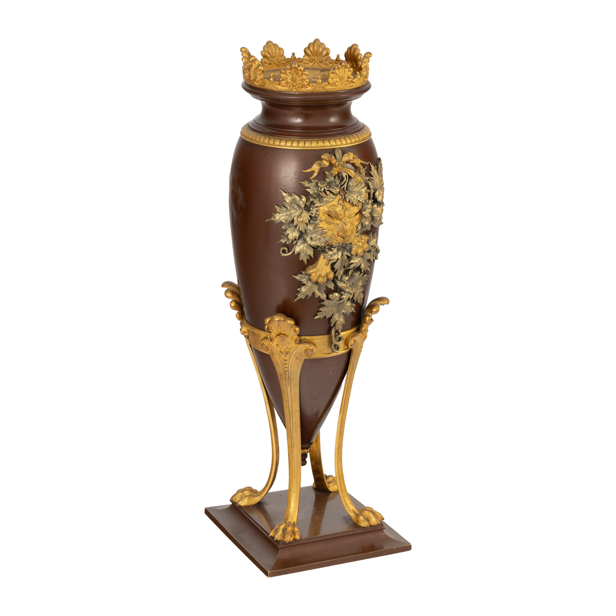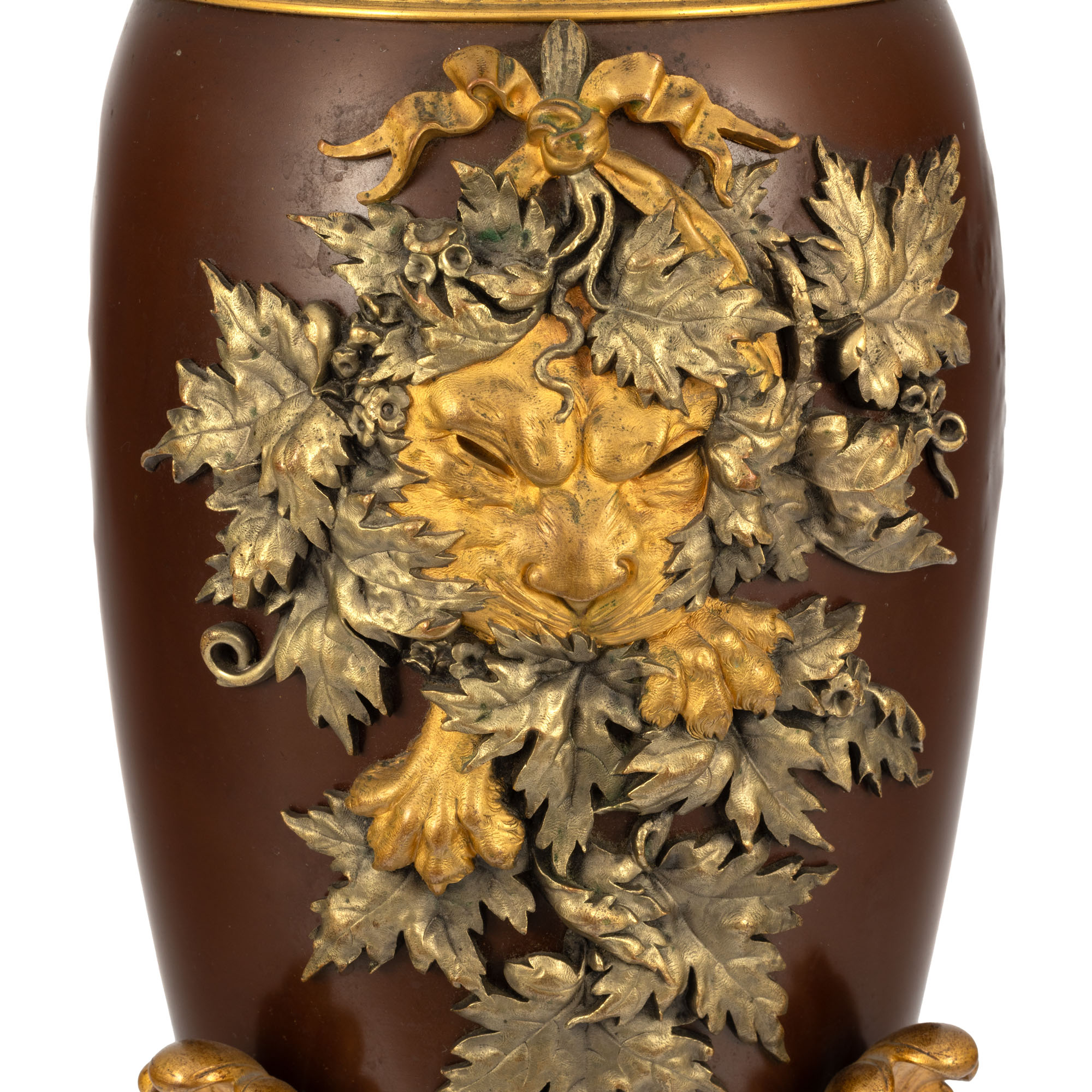 109. Vas decorativ din bronz policrom, ornat cu protomă de leu, autor Georges Servant, mijlocul sec. XIX
