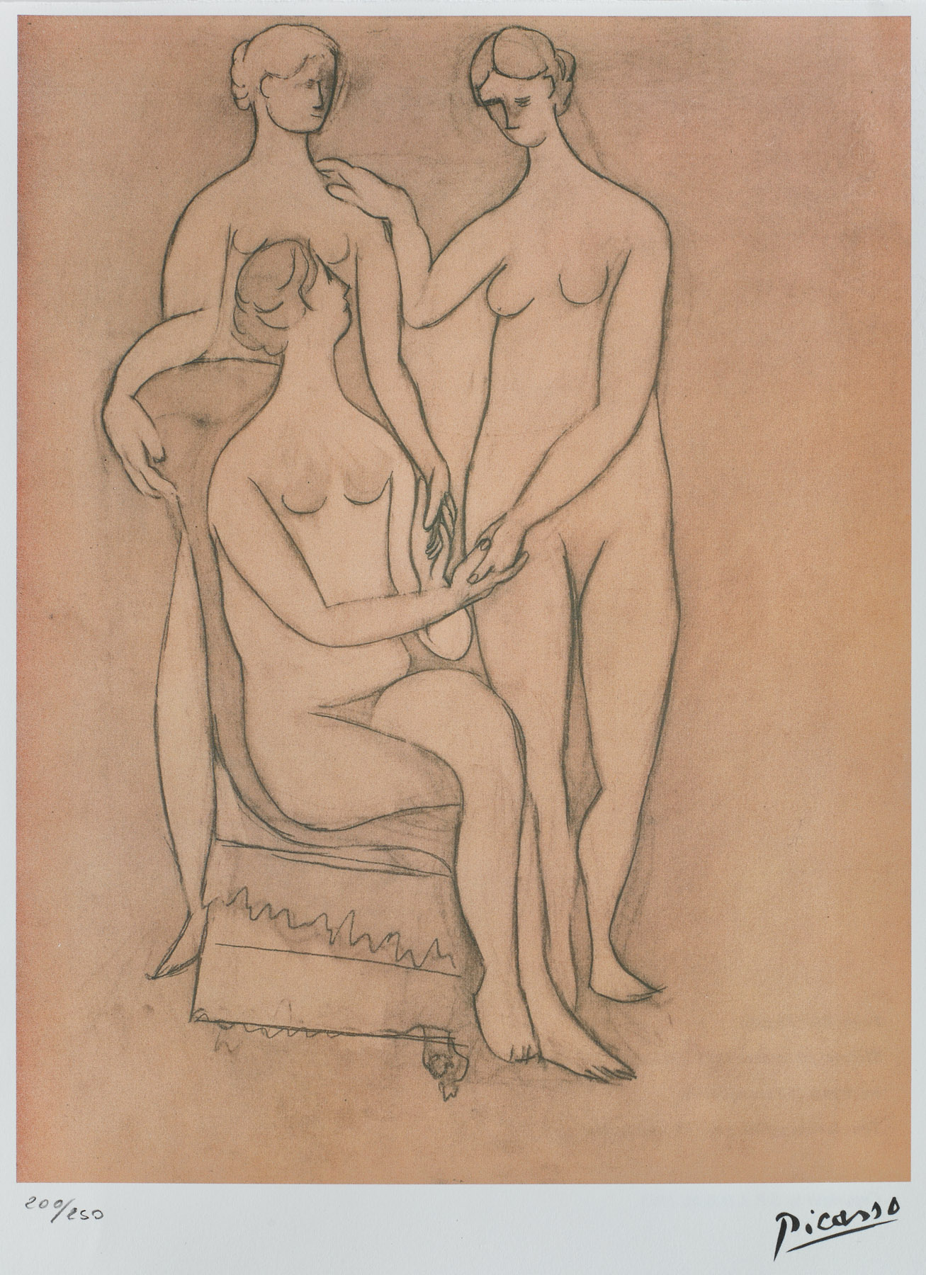 semnat, gravat, dreapta jos, sub cadru, ”Picasso”; numerotat stânga jos, sub cadru, în creion, ”200/250”; stânga jos ștampila editurii, ”SPADEM., Paris”