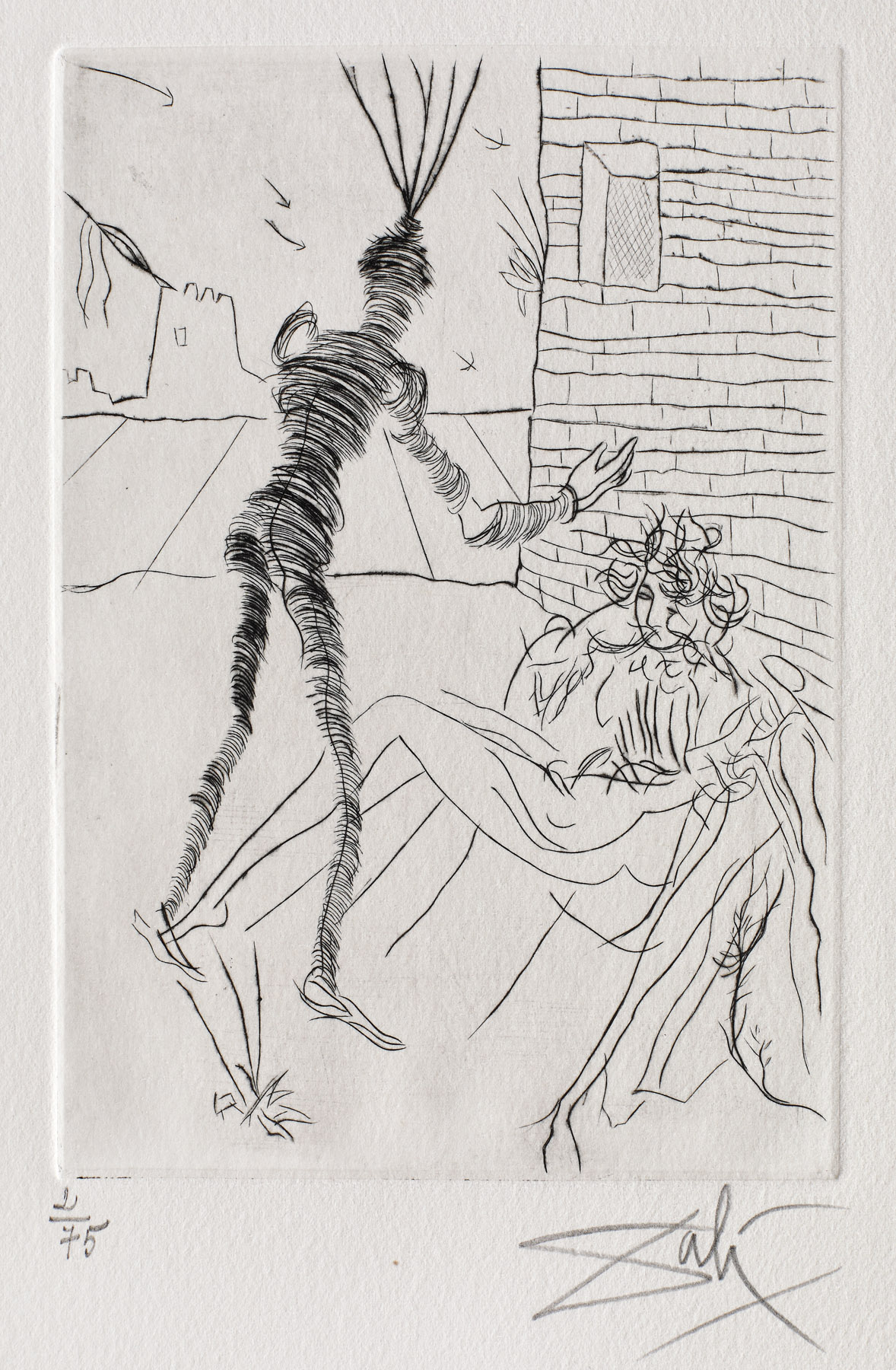 semnat dreapta jos, sub cadru, în creion, ”Dali”; numerotat stânga jos, sub cadru, în creion, ”2/75”