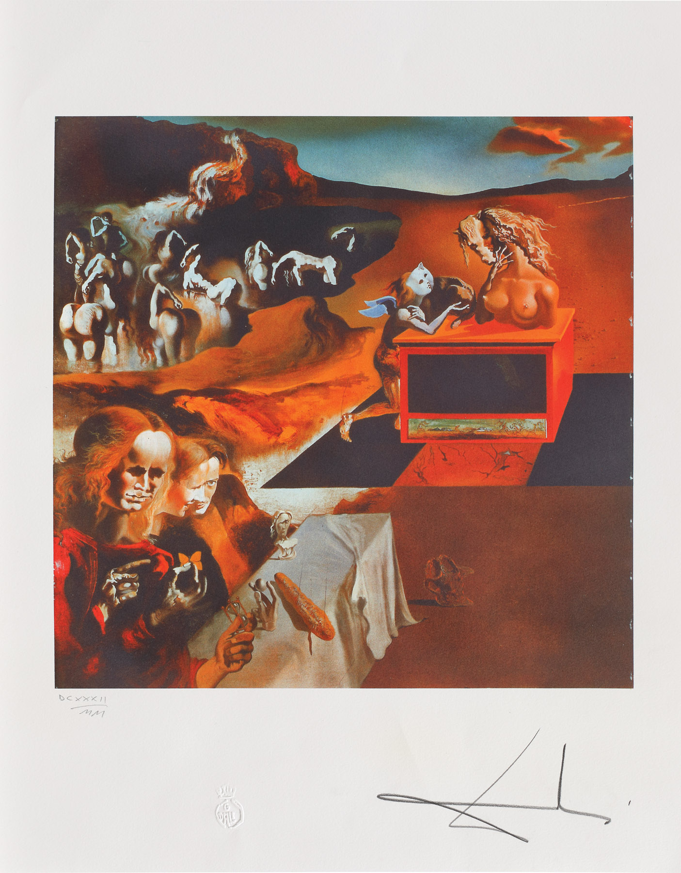 semnat, dreapta jos, sub cadru, "Dali"; numerotat stânga jos, sub cadru, în creion, "DCXXXII/MM"; central jos, sub cadru, ştampila editurii, "G. Dali"