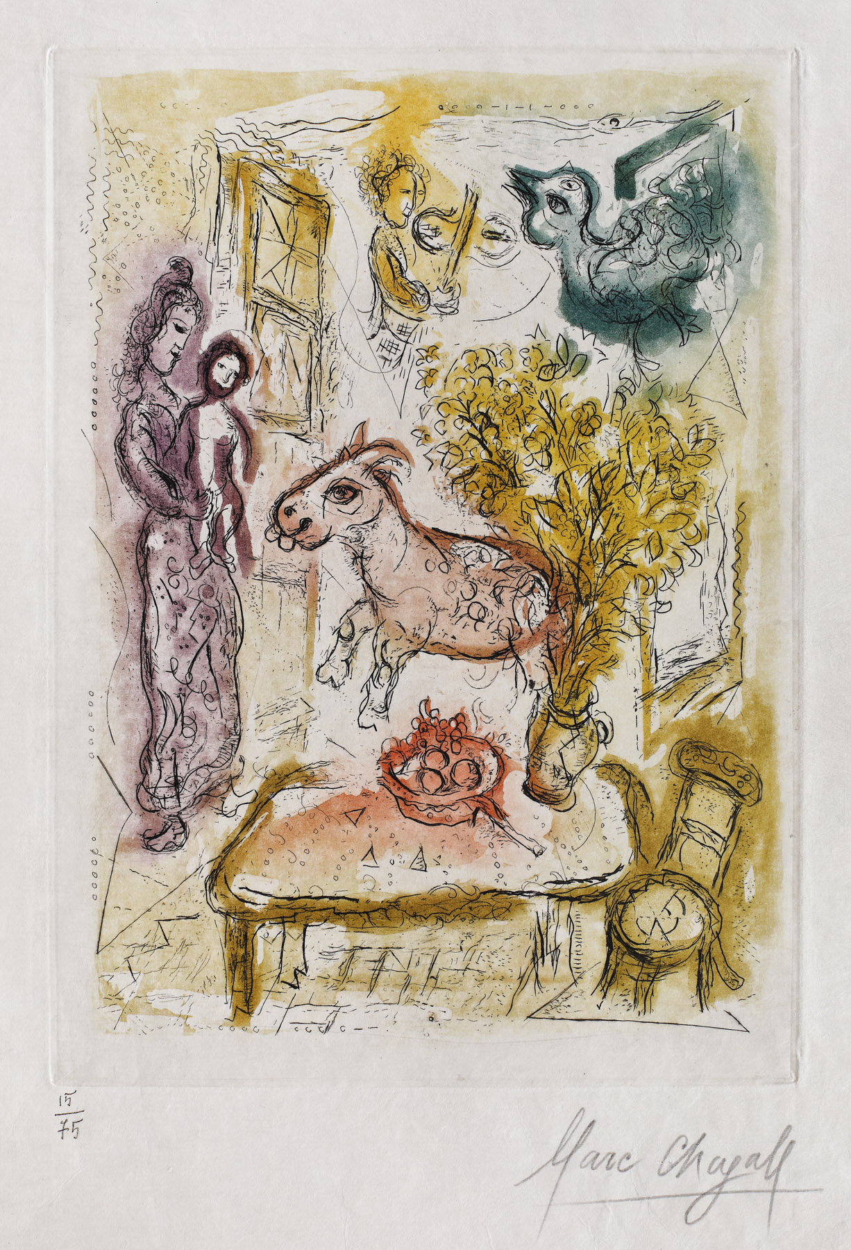 semnat dreapta jos, sub cadru, în creion, ”Marc Chagall”; numerotat stânga jos, sub cadru, în creion, ”15/75”