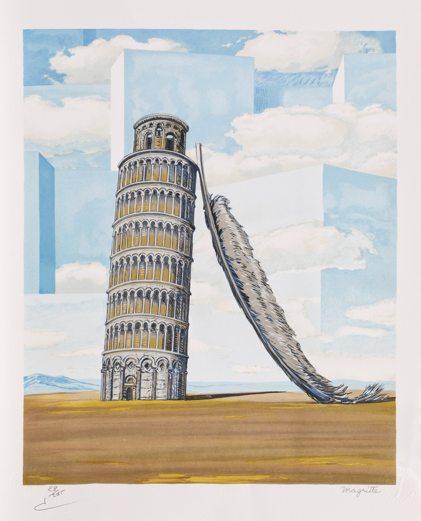 semnat, gravat, dreapta jos, sub cadru, "magritte"; numerotat stânga jos, sub cadru, în creion, "28/275"; dreapta jos, ştampilă de atelier, "Magritte SUCCESION"; stânga jos, ştampilă asociaţiei care deţine drepturile de autor, "CHERSCOVICI A.D.A.G.P, PARIS, 2011"