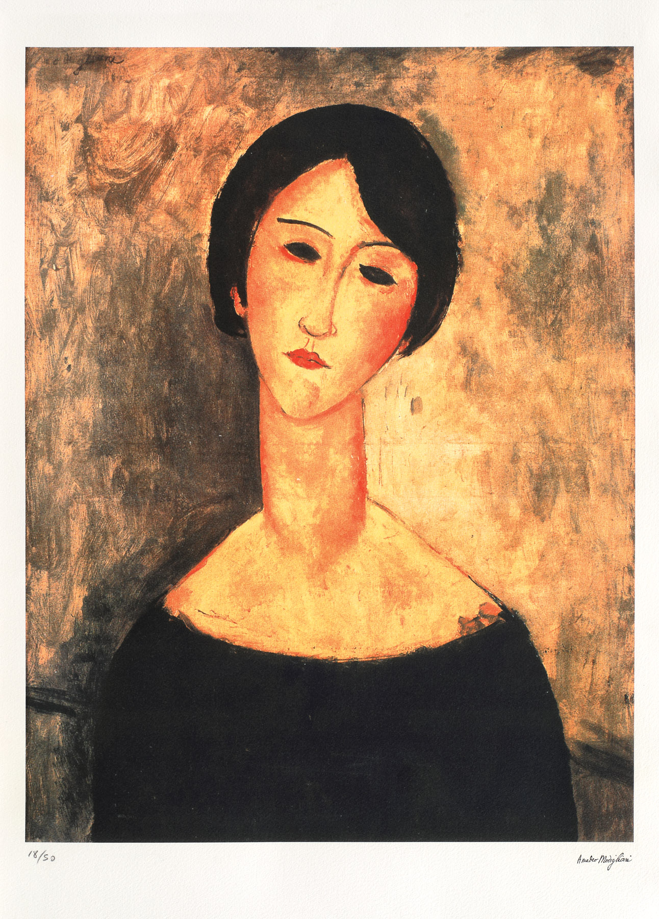 semnat, gravat, dreapta jos, sub cadru, "Amdeo Modigliani"; numerotat stânga jos, în creion, sub cadru, "18/50"; dreapta jos, ștampila editurii, "GEORGES ISRAEL EDITEUR"