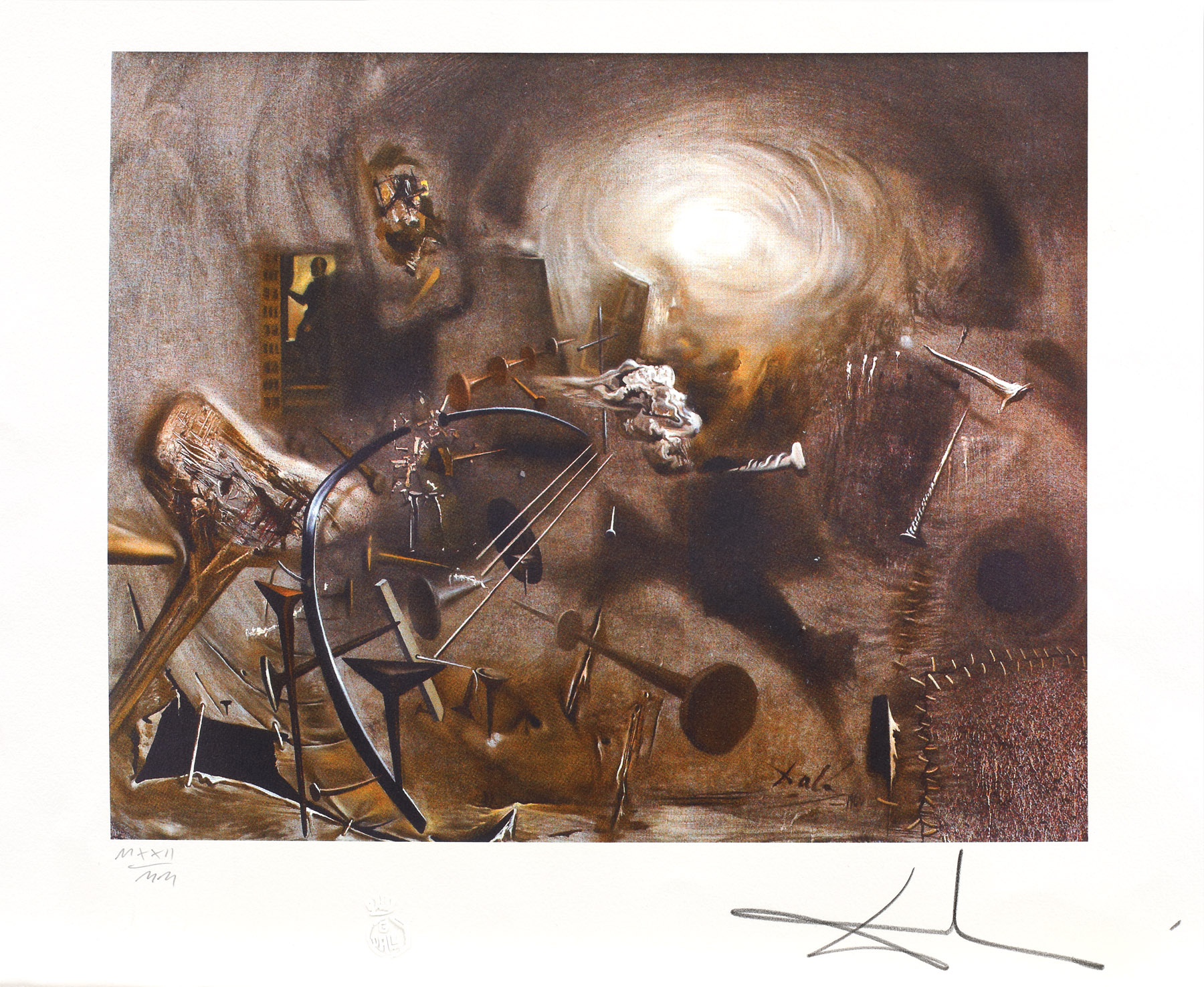 semnat, gravat, dreapta jos, în placă, "Dali"; semnat, dreapta jos, sub cadru, "Dali"; numerotat stânga jos, sub cadru, în creion, "MXXII/MM"