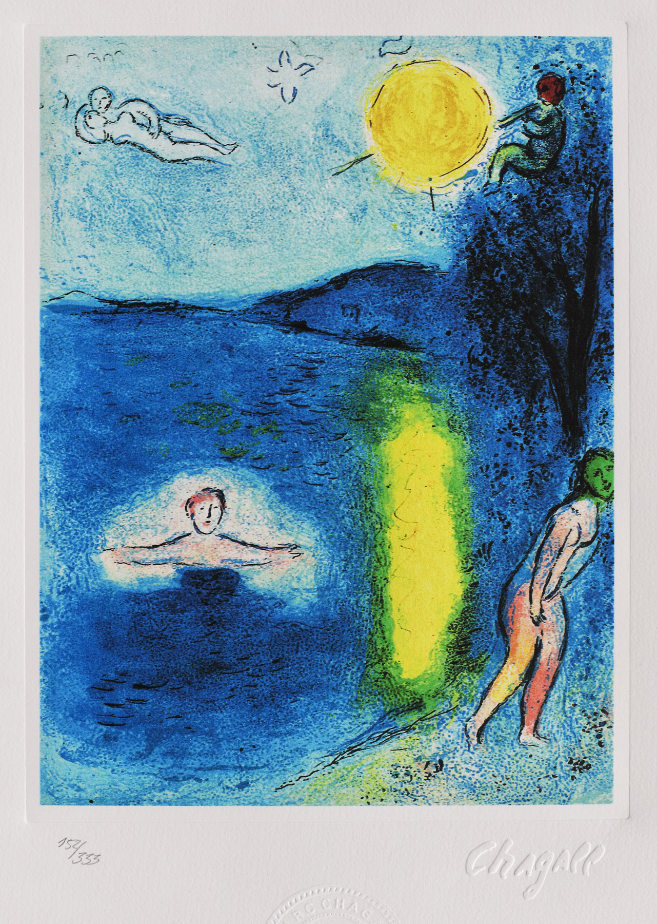 semnat, gravat, dreapta jos, sub cadru, "Chagall"; numerotat stânga jos, sub cadru, în creion, "152/333"; central jos, ştampila editurii, "SPADEM, Marc Chagall, Edition of 333"