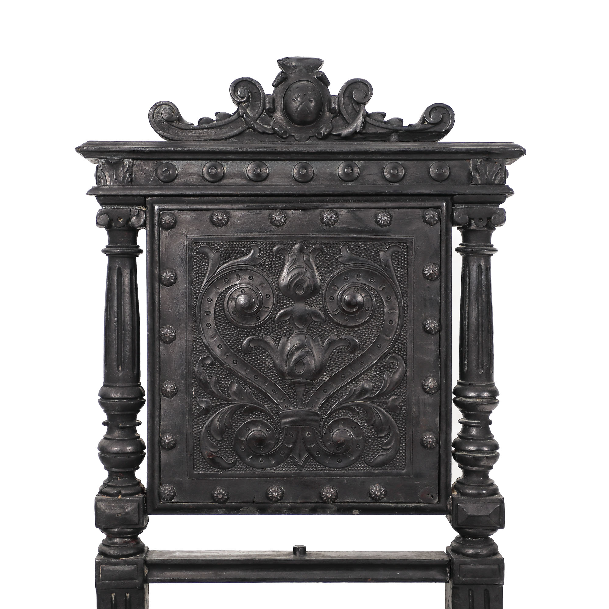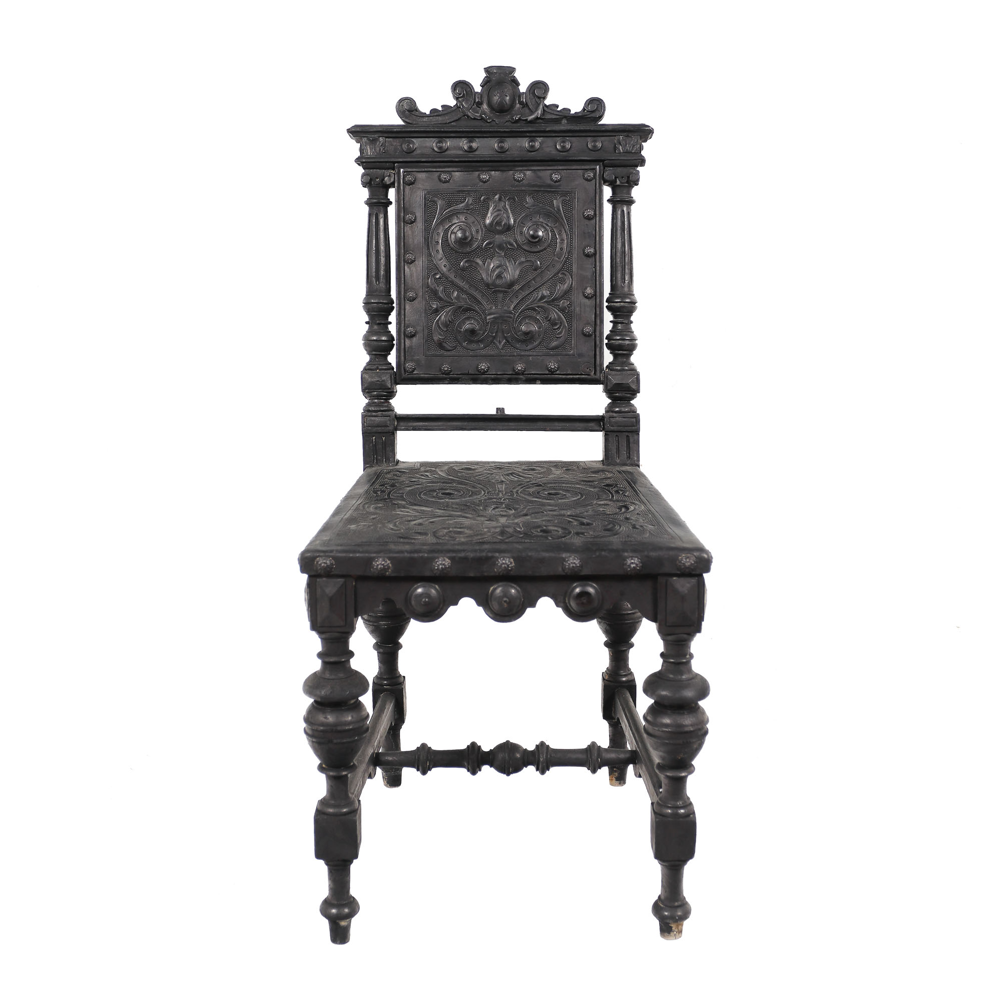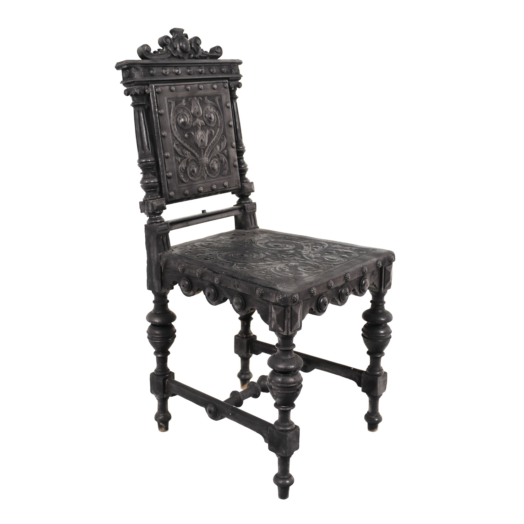 102. Scaun cu decor Historist, din lemn de nuc și piele, sfârșitul sec. XIX