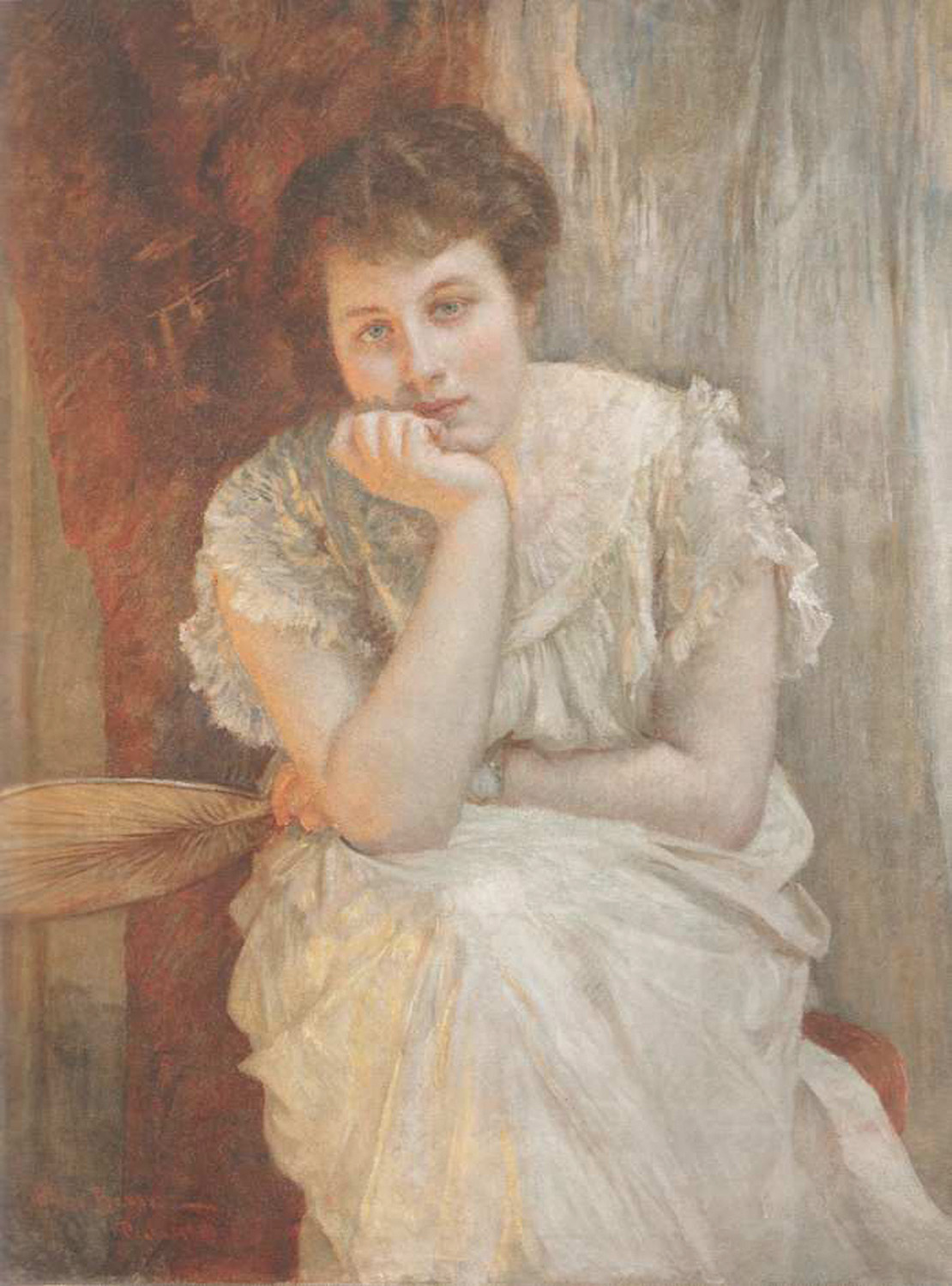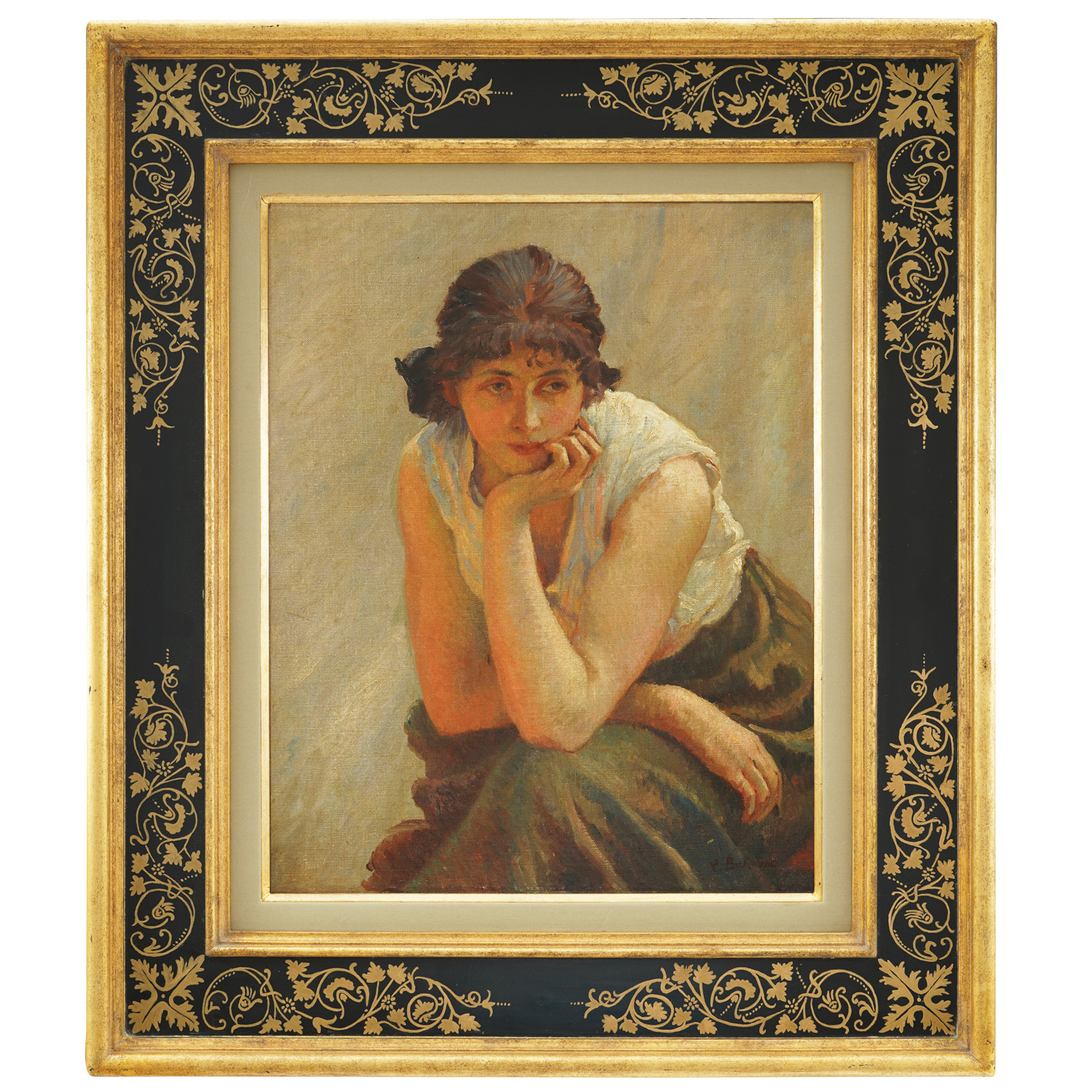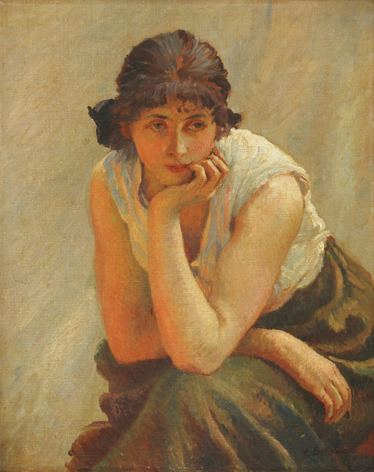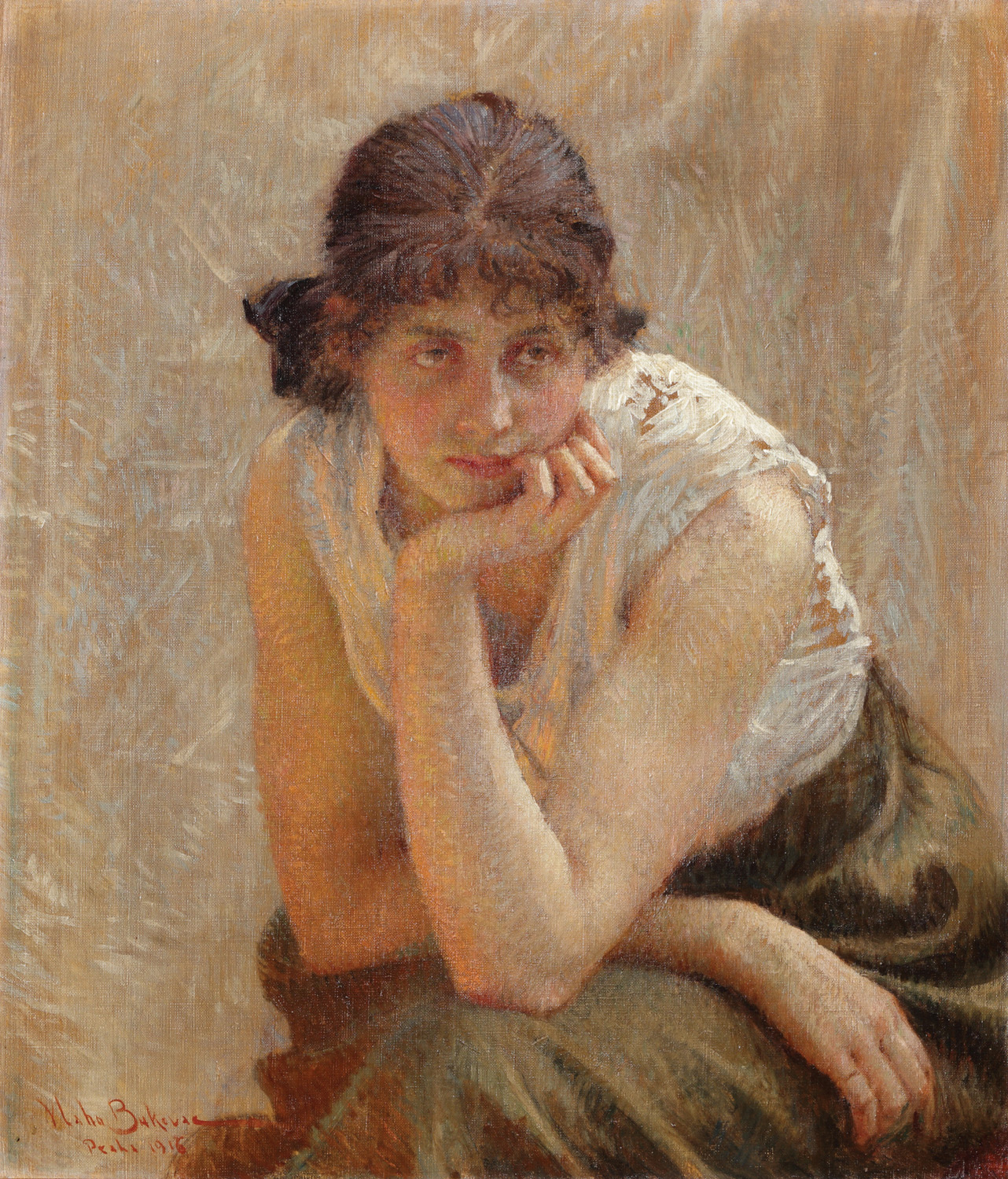 The work depicts the daughter of Vlaho Bukovac, Jelica Bukovac (1897-1967). A version of the same work is inventoried in the raissonne catalog of Vera Kružić Uchytil. Both paintings were created in Prague during the Prague period (1903-1922) at the time of the First World War, in 1916. After the death of the artist, both works left the Bukovac estate and likely went to England from the possession.