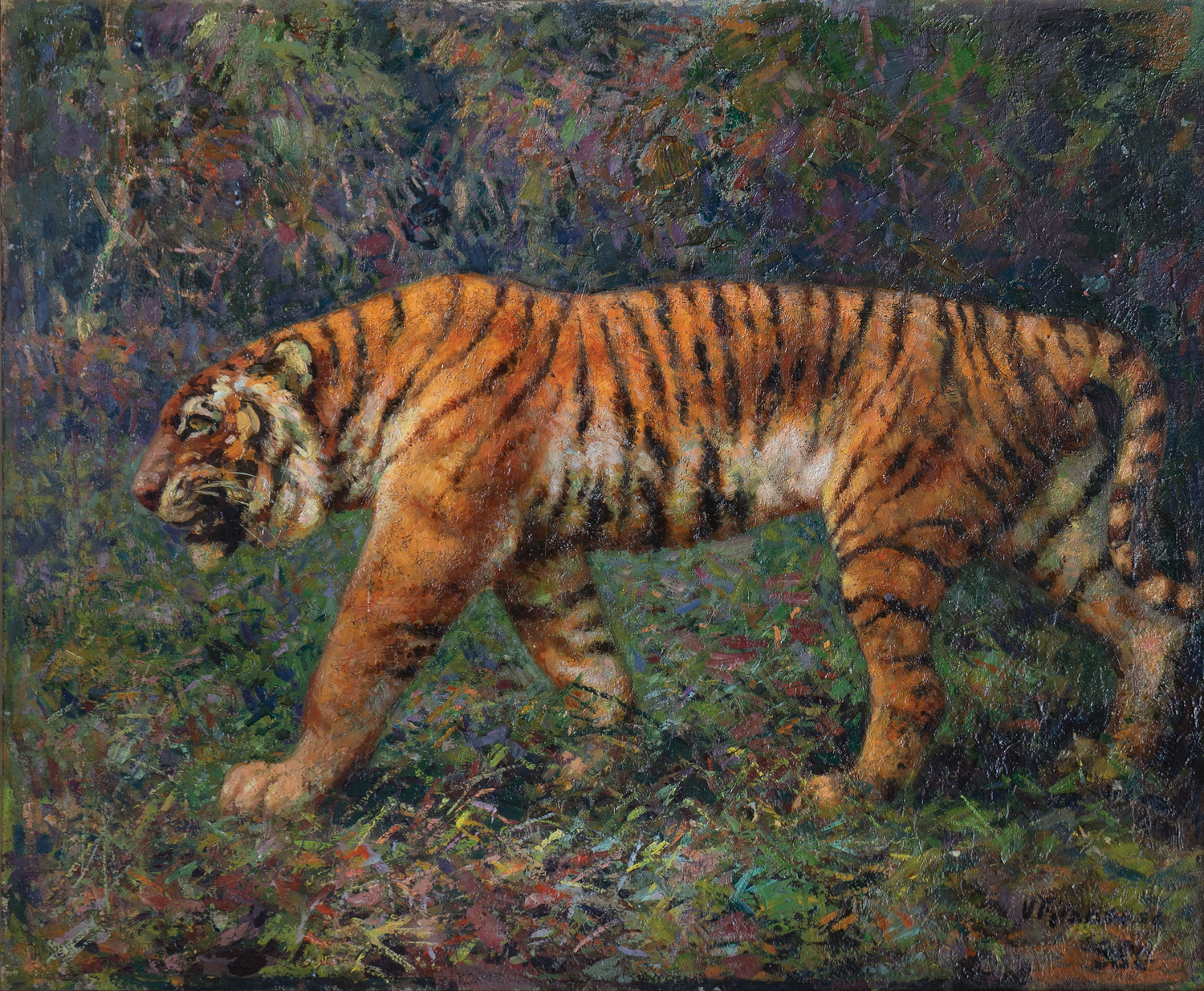 The most vital colorisms and drawing virtuosities of Filakovac occur on beasts and birds. In the history of Croatian painting of the 20th century, rare examples of beautifully painted animals are found, and even fewer are animalists. Mašić's poultry, Medović's quails, Kraljević's ducks and horses from the early last century, Tiljkovi's oxen, Becić's cats and skinless lambs, and Ružić's birds, and finally Džamonja's deer – are first-rate art but also regarded as one-off instances in these creators. Thus, when speaking of animalism and its founder in modern Croatian art, Filakovac and his entire opus must be emphasized. Matko Peić, the curator of Filakovac's exhibition in his native Slavonski Brod, where the painting "Tigar"(Tiger) was also displayed, described his painting personality as follows: Due to the works of great Flemish and French animal painters he saw in old Budapest Gallery, thanks to Budapest Zoo but mostly due to his original character – Filakovac became a Croatian painter asserting he has painted the most significant amount of beautiful wild and forest animals of local and foreign origin. Vladimir Filakovac studied painting at Budapest's Academy and spent his summers in Vukovar painting his favourite Slavonian landscapes and animal motifs for which he, as a passionate hunter, had a lasting inclination and a continuous influx of "models". His first exhibition at a Budapest art salon in 1913 was a significant success. He achieved similar success the same year at the Zagreb Ullrich Salon. During the Great War, graduated as an academic painter, he returned to Osijek, from where he was immediately sent to the battlefield. The period from 1921 to 1923 was spent in Vienna where he did graphic work and illustrations for magazines and the few oils he painted those years were portraits and studio studies of acts. Since his return to his homeland, he often "worked" during summers in Hvar resulting in a beautiful cycle of oil landscapes and cityscapes. In 1930, at the invitation of writer Branislav Nušić, who was his friend through "hunting line", he left Osijek and moved to Belgrade, where he worked as an illustrator. His first Belgrade exhibition was in 1938 at Paviliion Cvijeta Zuzorić. That same year in Zagreb, he participated in the exhibition Half A Century of Croatian Art and solo in 1939. During the pre-war 1940, together with painter Petar Dobrović, he worked on establishing the Art Academy in Belgrade where, in line with his favourite theme, he opened a department for animalistic painting. With the outbreak of war, he was forced to leave Belgrade and in early 1941 he settled in Zagreb. Since 1948, he was a full professor at the Zagreb Academy and until his retirement (1962) he taught students "plastic anatomy of animals". In the early 50s, he bought a house in Dubrava which with its lovely garden became equally valuable as a painting motif to Filakovac as wild animals. BRP
