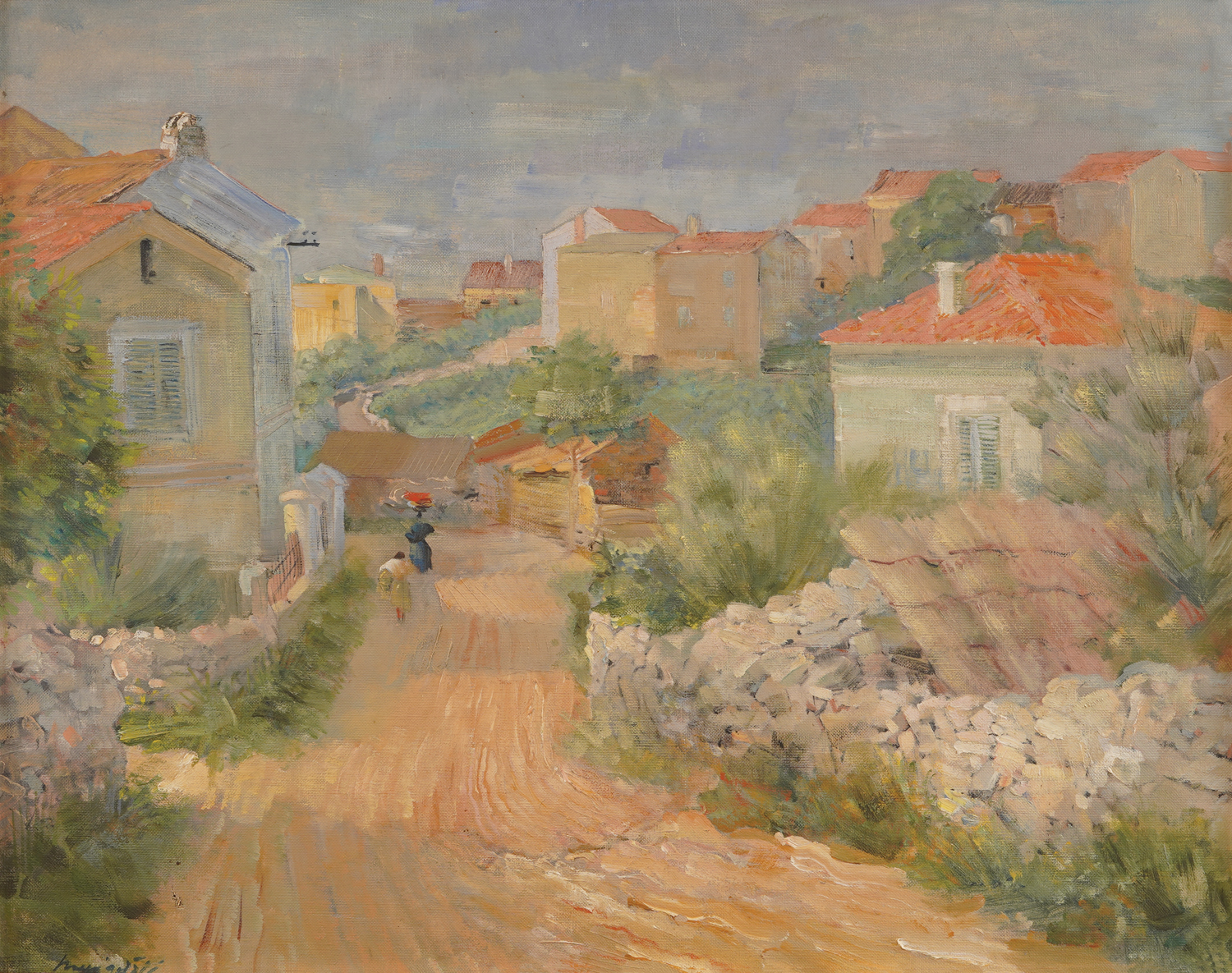 The view of Omišlj with subtle coloristic shades is a first-class painting by Omer Mujadžić, a great Croatian artist always devoted to the highest standard of painting art. Being diligently kept in a private collection for decades, this painting remained unknown to the general public and even to the art community until today. This fact was also contributed by a well-known fact from Mujadžić's biography that he was reluctant to exhibit during more than seven decades of creative lifespan and during his lifetime held only three solo exhibitions (in Sarajevo, Zagreb and Tuzla), which were modestly illustrated catalogues. The conducted research of the painter's opus and archival materials related to the exhibition ''Half a Century of Croatian Art'' reveals that this view - under the title ''Omišalj''- was exhibited during the exhibition (1938.) in the Meštrović pavilion in Zagreb (today the Home of Croatian Fine Artists). Mujadžić rarely appeared in public, and in one of the rare interviews he gave just before the end of his decades-long leadership of the painting class and the great act at the Zagreb Academy (1931-1974), he himself succinctly said that he had gone through three phases in painting: through shape, color and tone, which means through a kind of expressionism with cubist hints during the 20s, then colorism of impressionist handwriting during the pre-war 30s and finally through the tonal phase of blue-silver shine during the post-war years until he could paint. This view of Omišlj, as well as the landscapes from the vicinity of Baška, Omišlj, Krk and Dalmatia, which have already been recognized, of course, belongs to the author's "second" phase when his sensitive observance was directed towards quieter content, towards softening the form and light and the color of coastal landscapes and intimate scenes of Muslim women in interiors of his childhood, which he, nota bene, already pushed to the top of Croatian painting production of his, but also our time. BRP