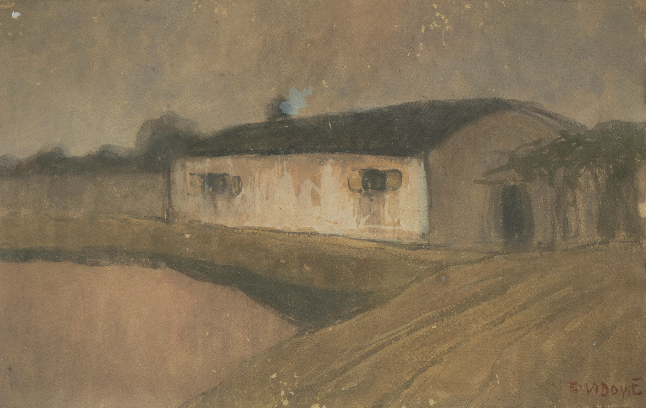 We can rightfully say that the painting of Split artist Emanuel Vidović (1870 - 1953) defined the period of modernism in Croatia and significantly contributed and enriched our landscape painting. During his long and prolific career, Vidović evolved from the post-Impressionist and divisionist influences of Giovanni Segantini to the lyrically-intimate approaches to the landscape motif, creating some of the key works of Croatian painting, such as ''Small World'' (1904), ''Angelus'' (1906/1907), and ''From the Lagoon'' (1905/1906). Whether he built his landscapes on large canvas formats or captured them on smaller scale surfaces, Vidović always strived to create atmospheric, tonally harmonious, and compositionally balanced works. These characteristics of his work are reflected in ''House by the Water'', which retains the atmosphericity and certain monumentality of much larger Emanuel Vidović's canvases within the smaller dimensions of paper. Here he creates almost minimalistic, monochromatic composition, building architectural elements and landscape elements with broad brush strokes and transparent layers of color. The strong diagonals of the work, particularly noticeable in the way the house depicted is positioned, draw the observer into the landscape and add perspective and depth to it. This charming watercolor once belonged to the collection of art historian and translator Tonko Maroević (1941 - 2020) and was also exhibited at Emanuel Vidović's retrospective exhibition in 1987, held in the then Museum Space, today's Klovićevi dvori Gallery. The exhibition also included a stylistically and compositionally related work ''In Bosnia'' (1919/1920), in which Vidović composes the motif of low houses diagonally in the upper half of the painting, while the lower half of the work is almost abstractly resolved in broad color planes. As a painter who often reworked known themes, Vidović also recorded ''House by the Water'' on another, almost identical watercolor of the same name. This is a slightly later work, dated in 1924, which is known to us from the reproduction published in the catalog of the retrospective exhibition of Emanuel Vidović in the Art Pavilion in 1971. MM