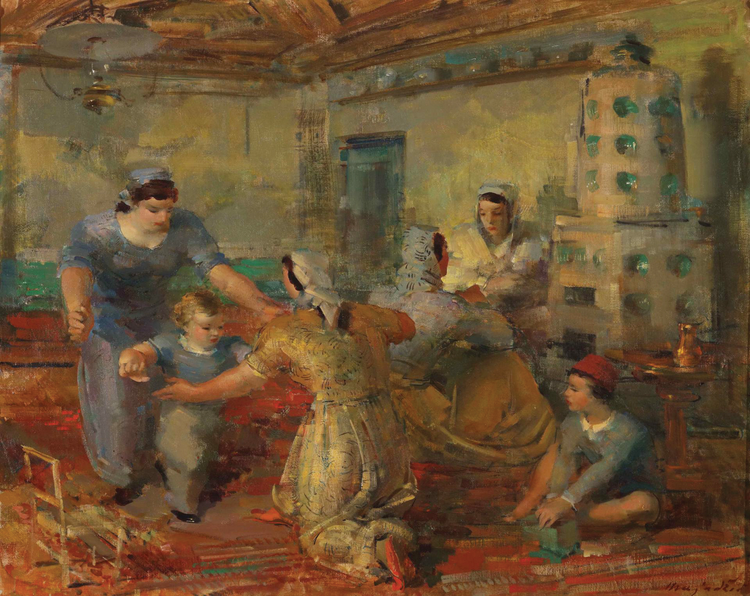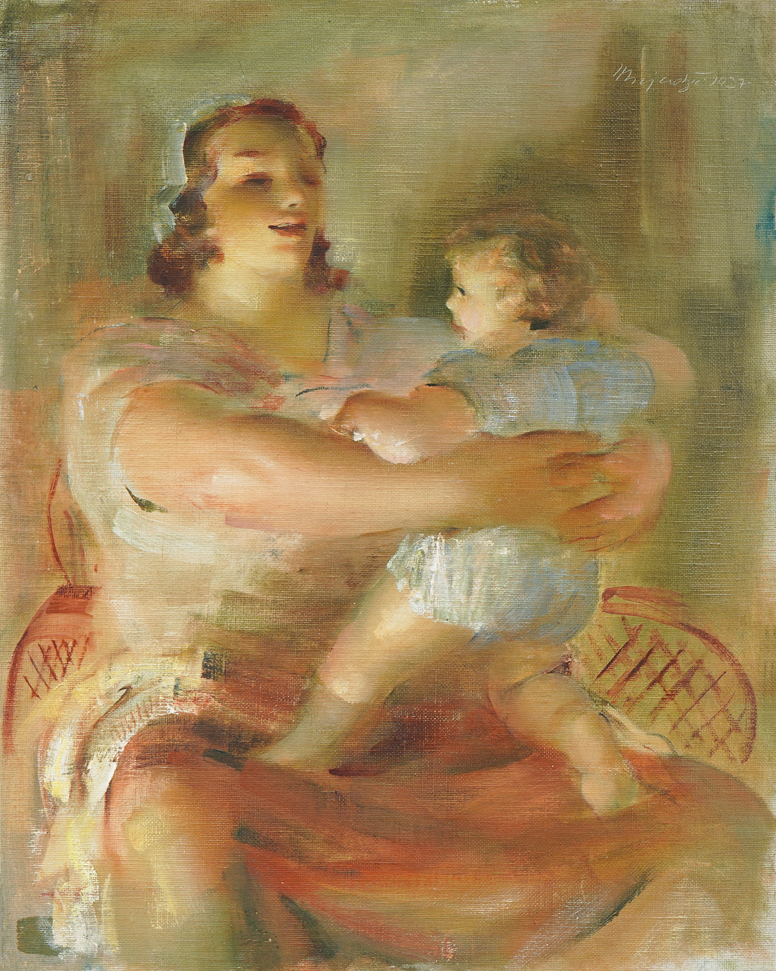 The painting Mother and Child, with its intimate mood and subtly lit palette, clearly exhibits Mujadzic's stylistic transformation begun in the early 30s when he moved away from the plastic modeling of figures and "earthly" socially engaged plots. These expressive and stylistic determinants of his post-academic painting of Parisian and Zagreb provenance had already receded by the end of the 20s in the face of a flood of memories of a peaceful and actually happy childhood spent in Bosanska Gradiska. The scene on this painting, soaked in nostalgia and sensitivity, is a beautiful testament to Mujadžić's upcoming dedication to painting intimate scenes from everyday family life. The application of color is glaze-like, the light illuminating the face is gentle, and the dynamics of the composition are calming. In a word, a magical scene of unclouded happiness. In terms of artistry, it is executed at the highest level of refined painting tradition, based on the highest values of the past and on the positivist achievements of modern painting expression.